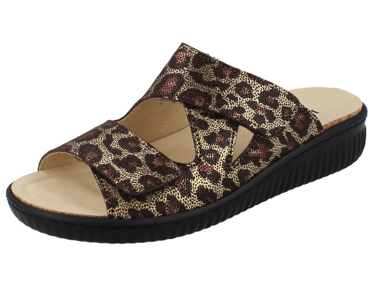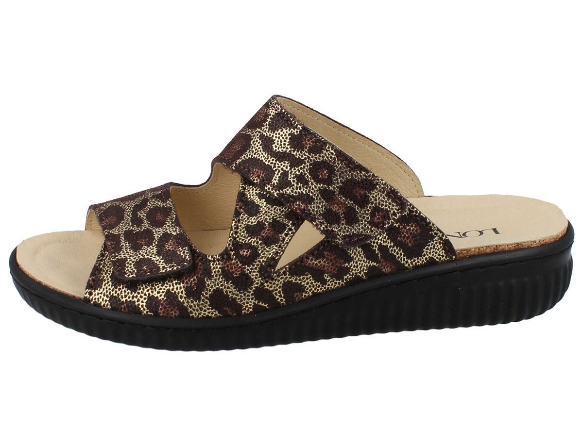 LONGO Damen Pantolette Hausschuhe Schlappen braun gold bedrucktes Nubukleder