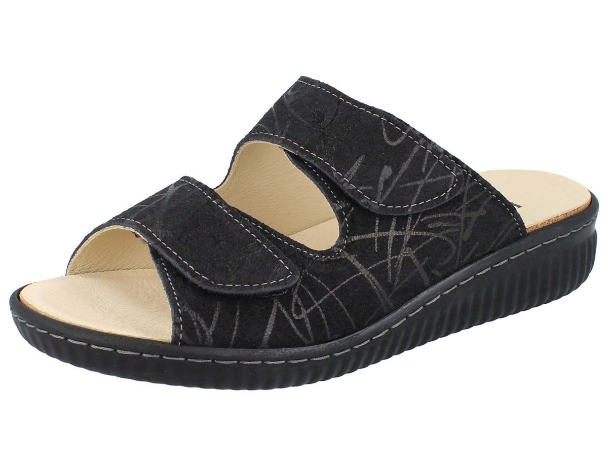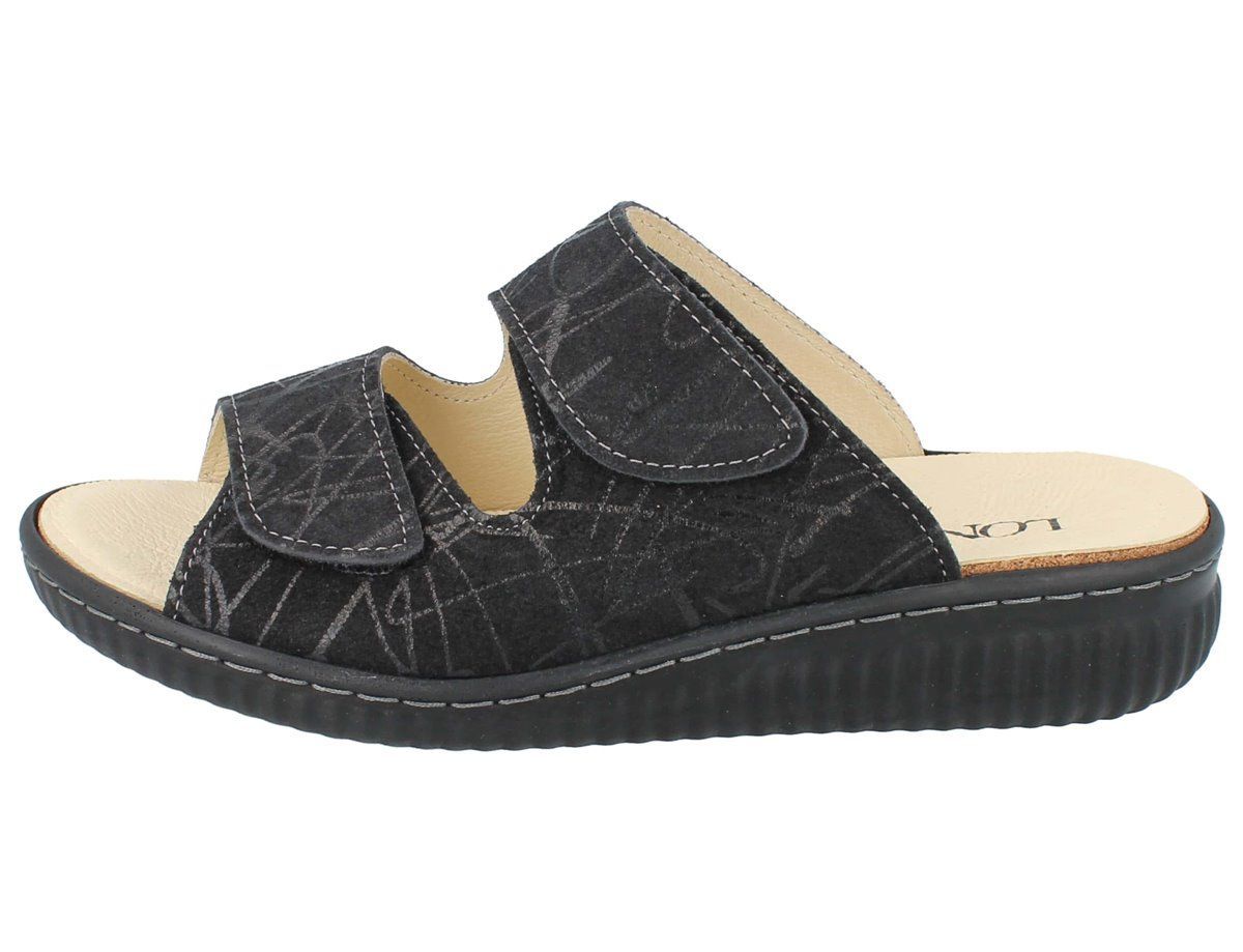 LONGO Damen Pantolette Hausschuhe Schlappen schwarz bedrucktes Nubukleder