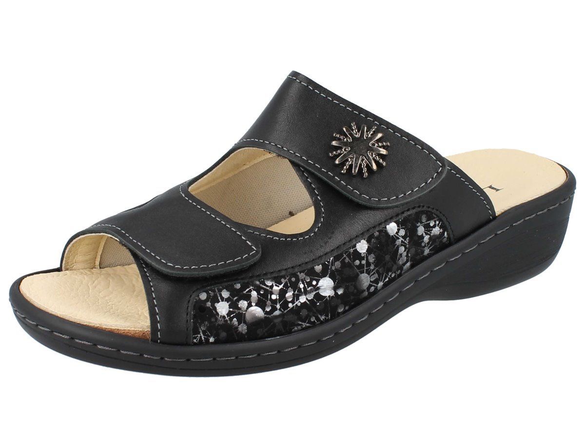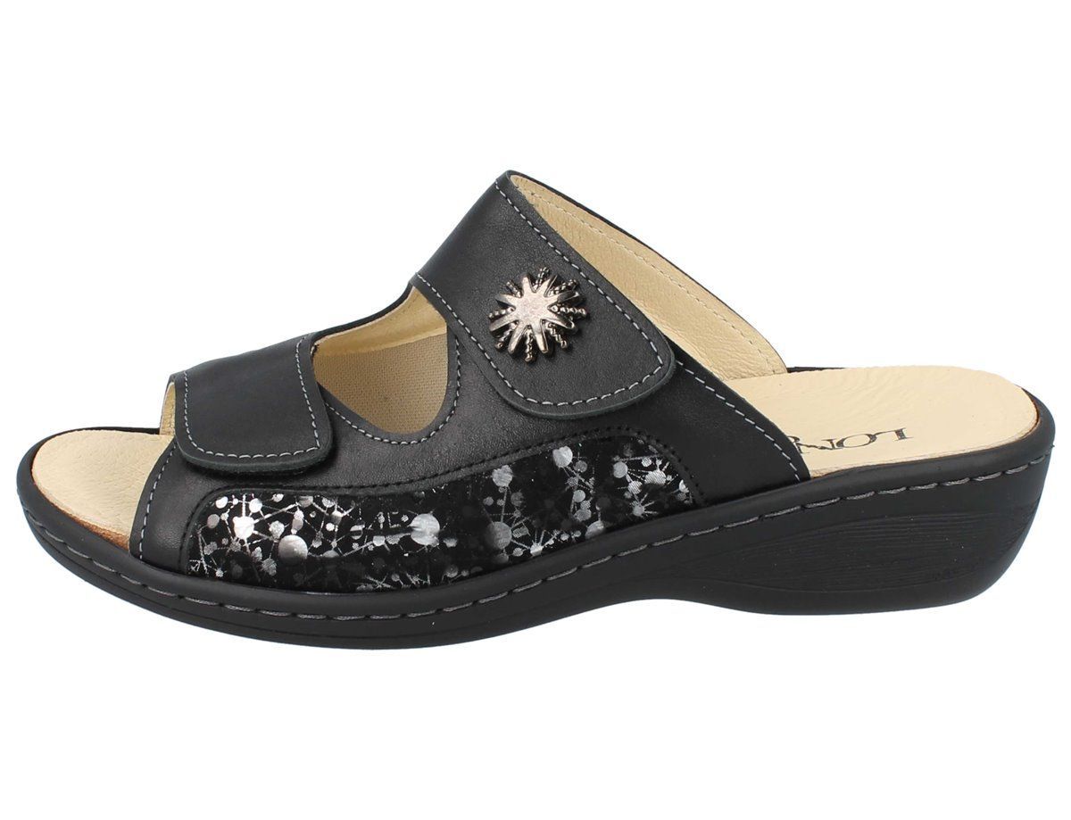 LONGO Stretch Damen Pantolette Hausschuhe Schlappen schwarz silber Leder Textil
