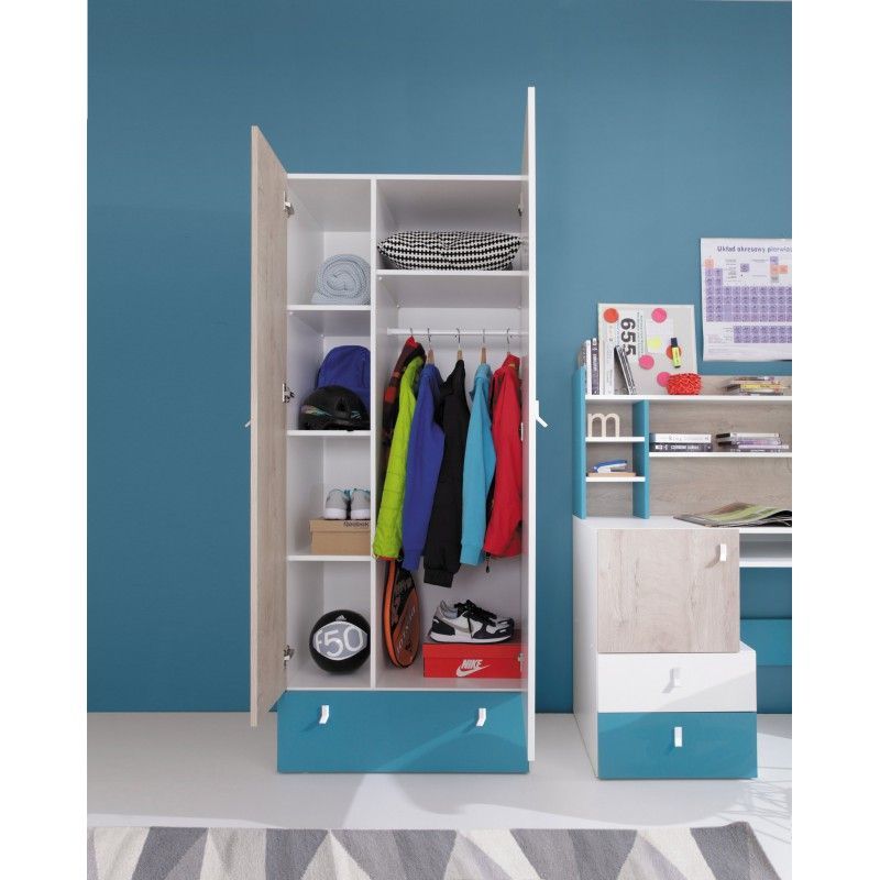 Gegenstand dieses Verkaufs ist ein Jugendmöbelset von LOPI, das Folgendes umfasst: einen Kleiderschrank mit Regalen und einer Stange, einen funktionalen Schreibtisch für die Hausaufgaben, eine schöne und stilvolle Kommode, zwei geräumige Bücherregale für Bücher oder andere Lernhilfen und ein Hängeregal. Das ganze Set sieht modern und stilvoll aus, so dass jedes Kind dieses Möbelset lieben wird.