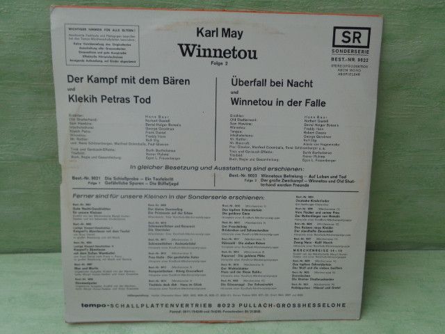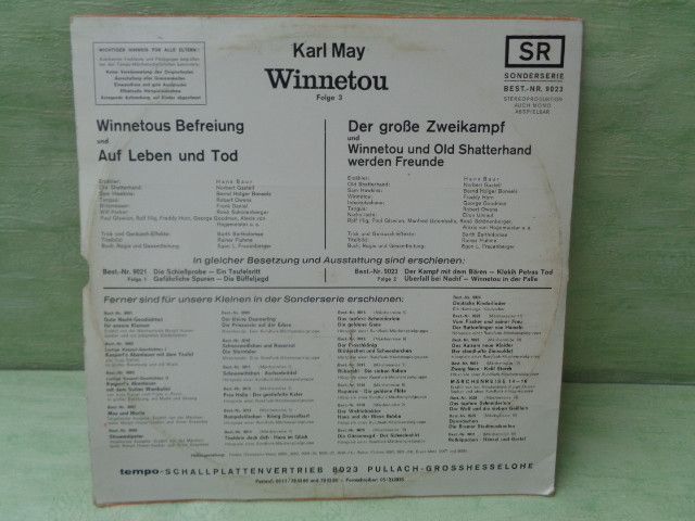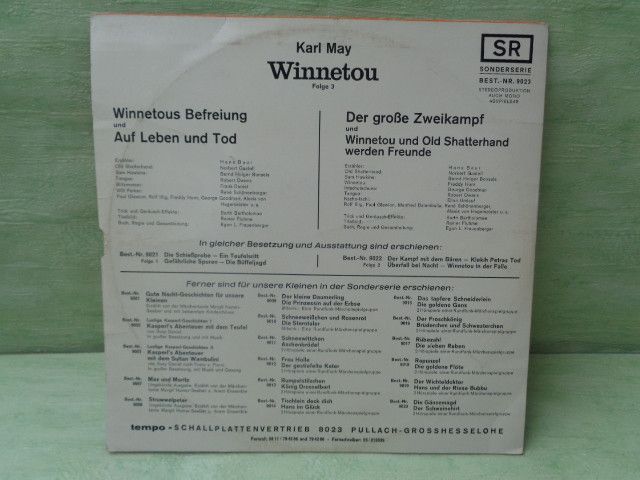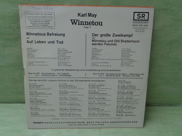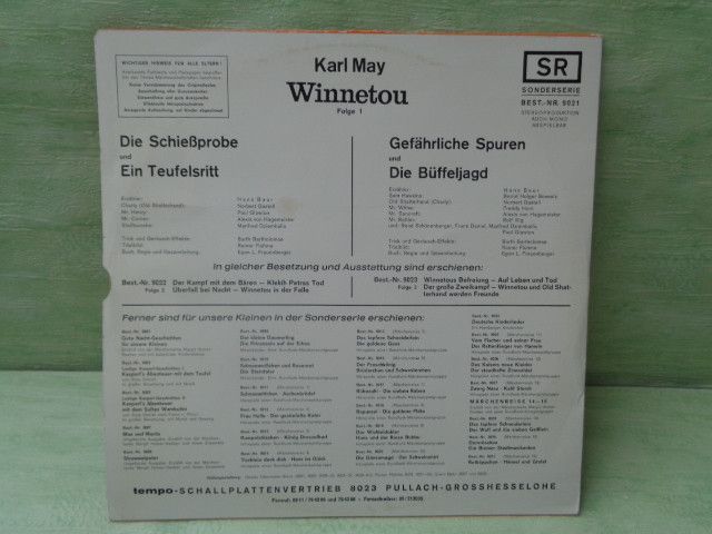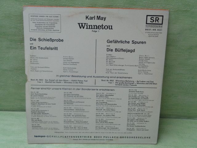 * * * Sammeln & Seltenes - Hörspiel Vinyl * * * * ... aus Freude an schönen Dingen ..... Vinyl - LP - Schallplatten 9021: Die Schießprobe - Ein Teufelsritt Gefährliche Spuren Die Büffeljagd 9022: Der Kampf mit dem Bären Klekih Petras Tod Überfall bei Nacht - Winnetou in der Falle 9023: Winnetous