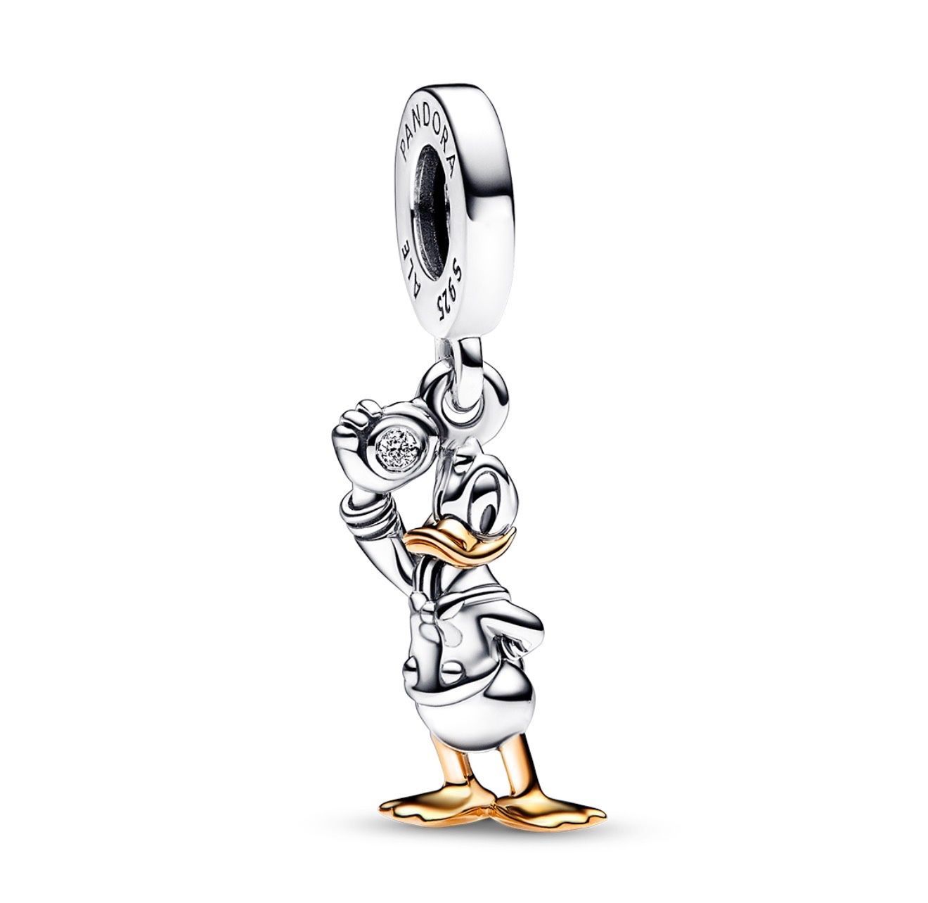 ür den ultimativen Disney-Fan: Donald Duck Dangle Charm von Disney. Donald Duck trägt sein klassisches Matrosenhemd und ist handgefertigt aus Sterlingsilber mit 14-karätigen Goldakzenten. Donald nimmt eine kecke Pose ein und lüftet seine Matrosenmütze, um einen funkelnden, im Labor hergestellten Dia
