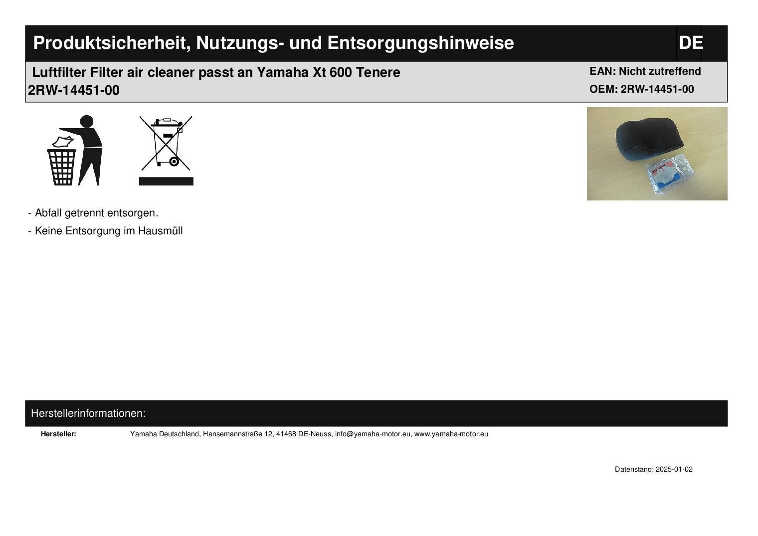 Luftfilter Filter air cleaner passt an Yamaha Xt 600 Tenere 2RW-14451-00