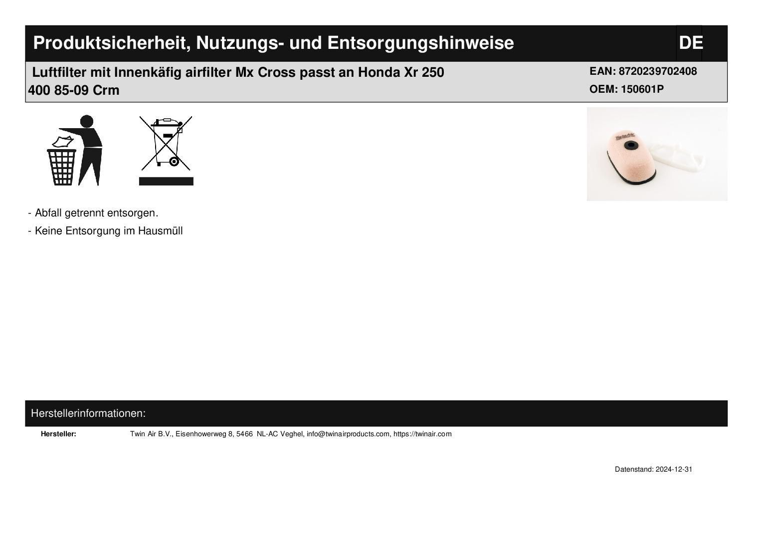 Luftfilter mit Innenkäfig airfilter Mx Cross passt an Honda Xr 250 400 85-09 Crm