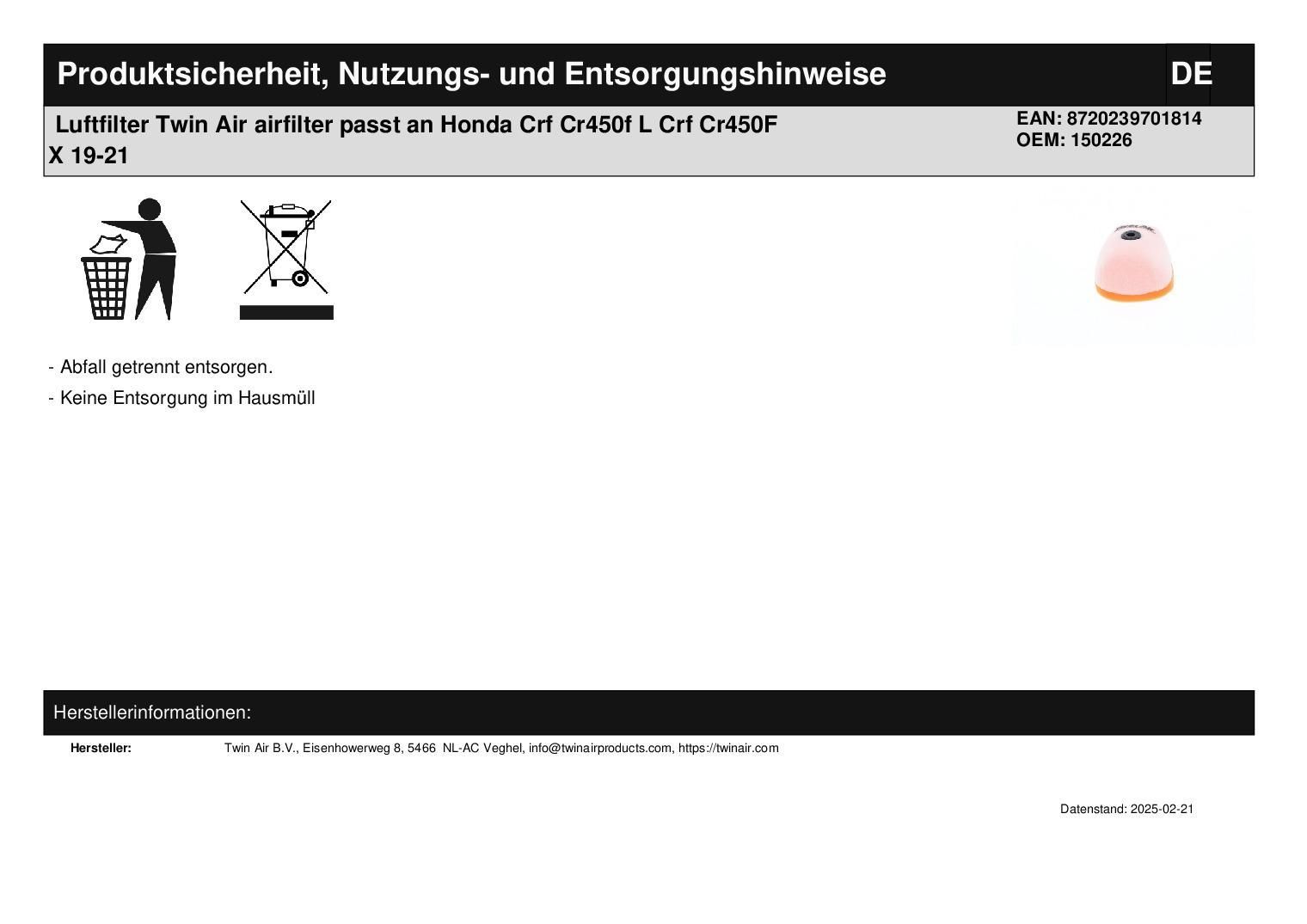 Luftfilter Twin Air airfilter passt an Honda Crf Cr450f L Crf Cr450F X 19-21