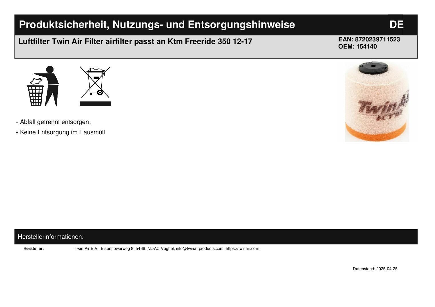 Luftfilter Twin Air Filter airfilter passt an Ktm Freeride 350 12-17