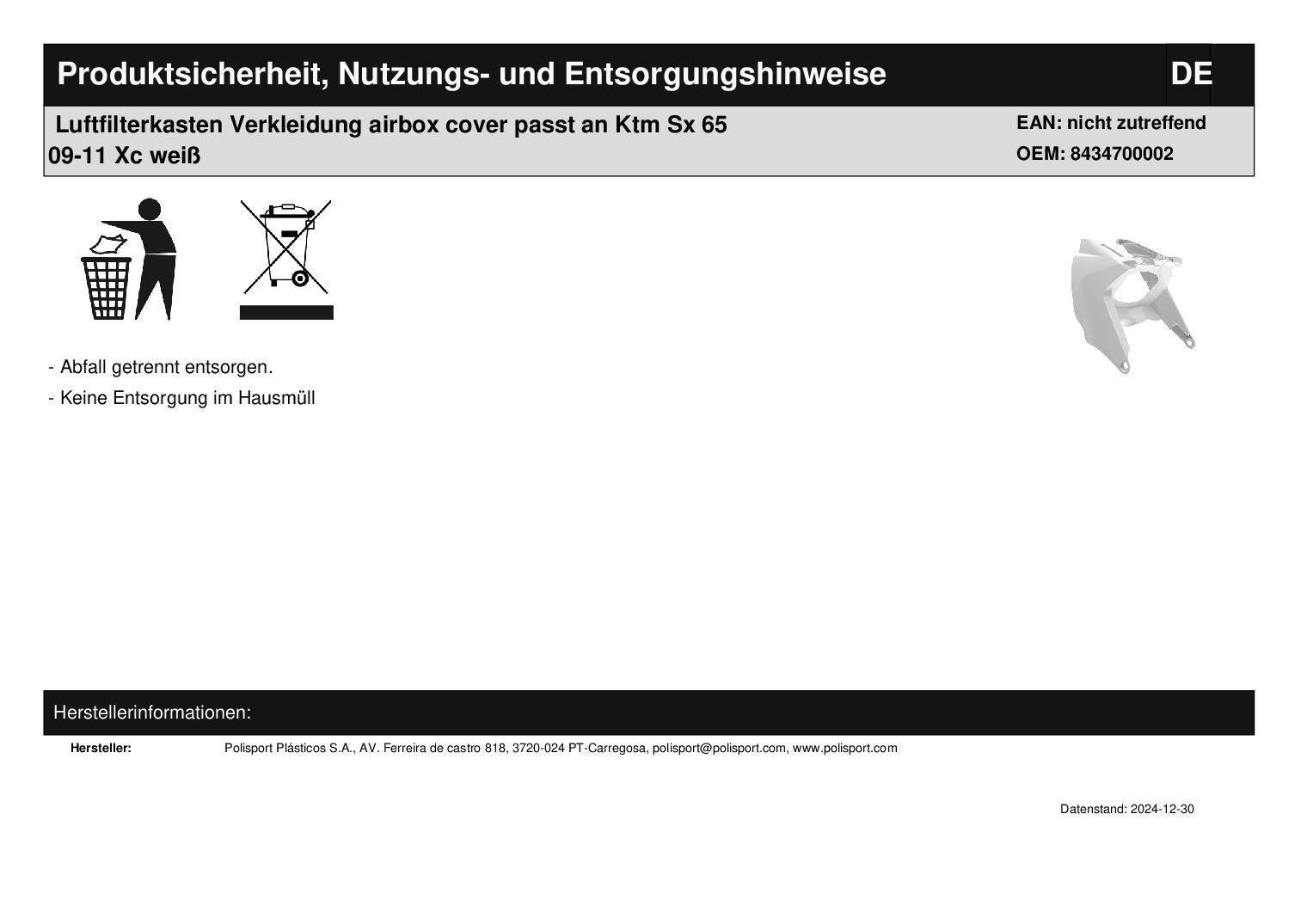 Luftfilterkasten Verkleidung airbox cover passt an Ktm Sx 65 09-11 Xc weiß