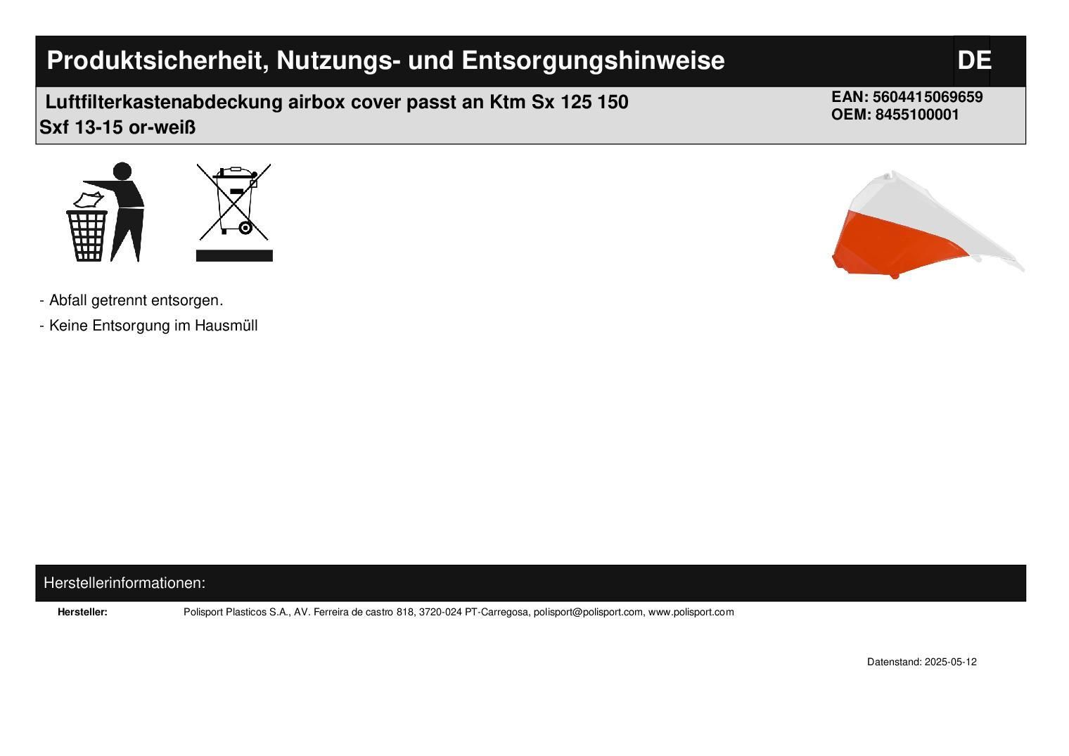 Polisport Luftfilterkastenabdeckung airbox cover passt an Ktm Sx 125 150 Sxf 13-15 or-weiß
