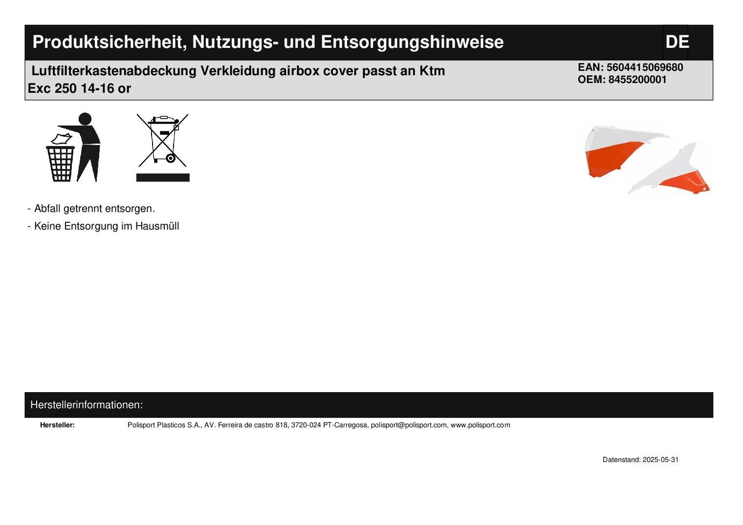 Polisport Luftfilterkastenabdeckung Verkleidung airbox cover passt an Ktm Exc 250 14-16 or