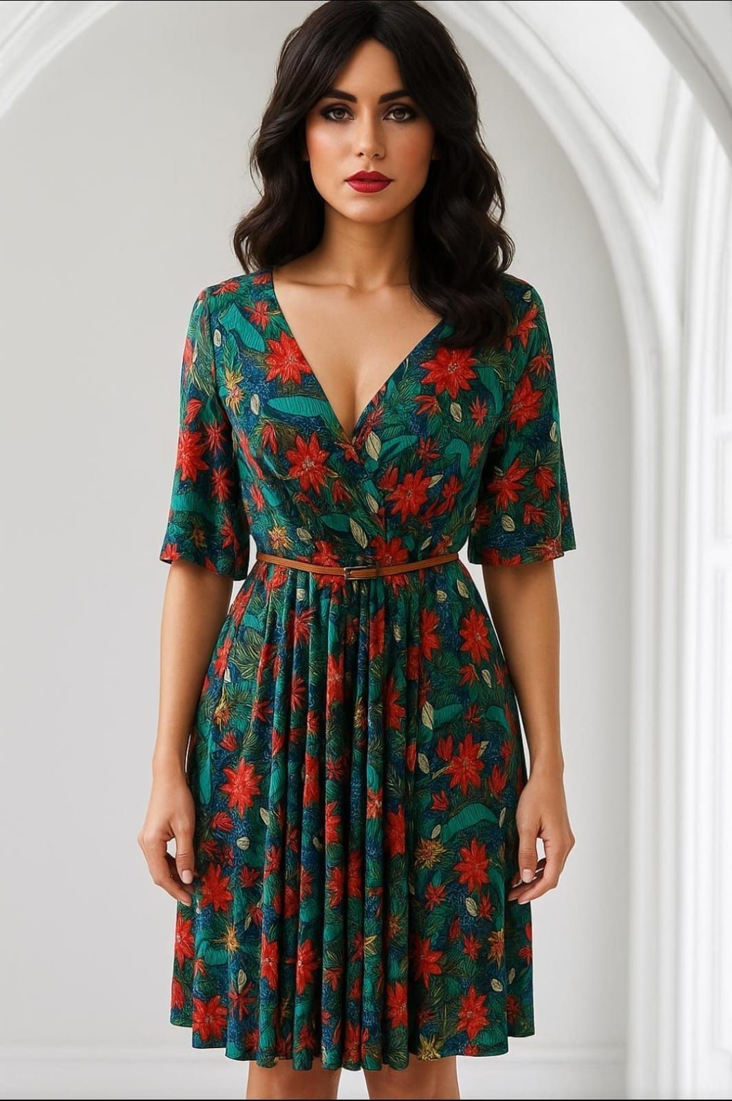 Dieses wunderschöne, lockere Sommerkleid begeistert mit seinen kräftigen Rottönen und frischen grünen Akzenten – genau das Richtige, um an warmen Tagen stilvoll und bequem durch den Tag zu gehen. Der Gürtel ist abnehmbar, sodass du das Kleid je nach Anlass figurbetont oder ganz entspannt tragen kann