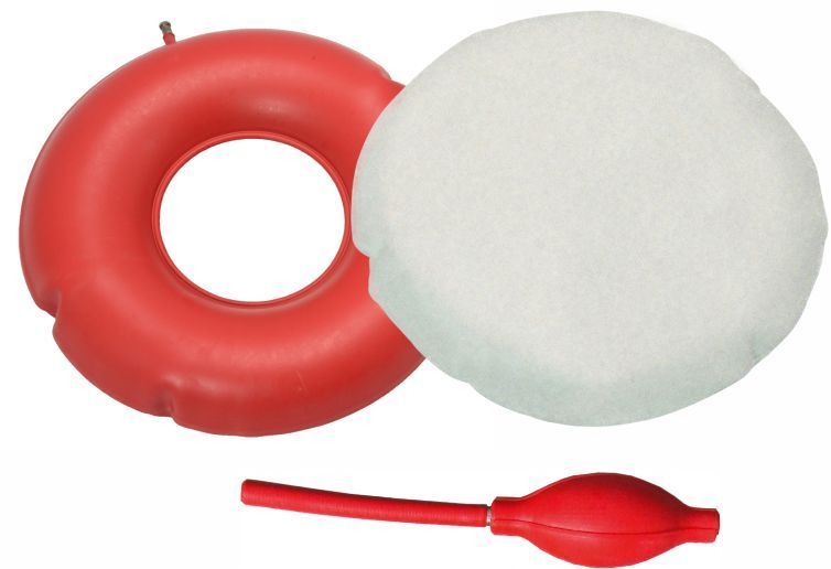 regulierbarer Luftdruck sorgt für angenehmes und druckfreies Sitzen Luftring aus rotem Gummi inkl. Pumpe mit Frotteebezug, weiß Maße: Ø ca. 43 / Innen Ø ca. 14 cm