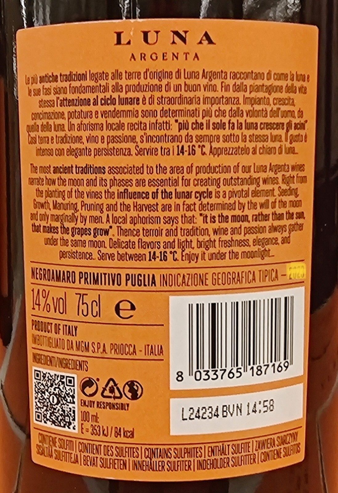 Luna Argenta Negroamaro Primitivo Puglia Rot - 0,75 L - Italien