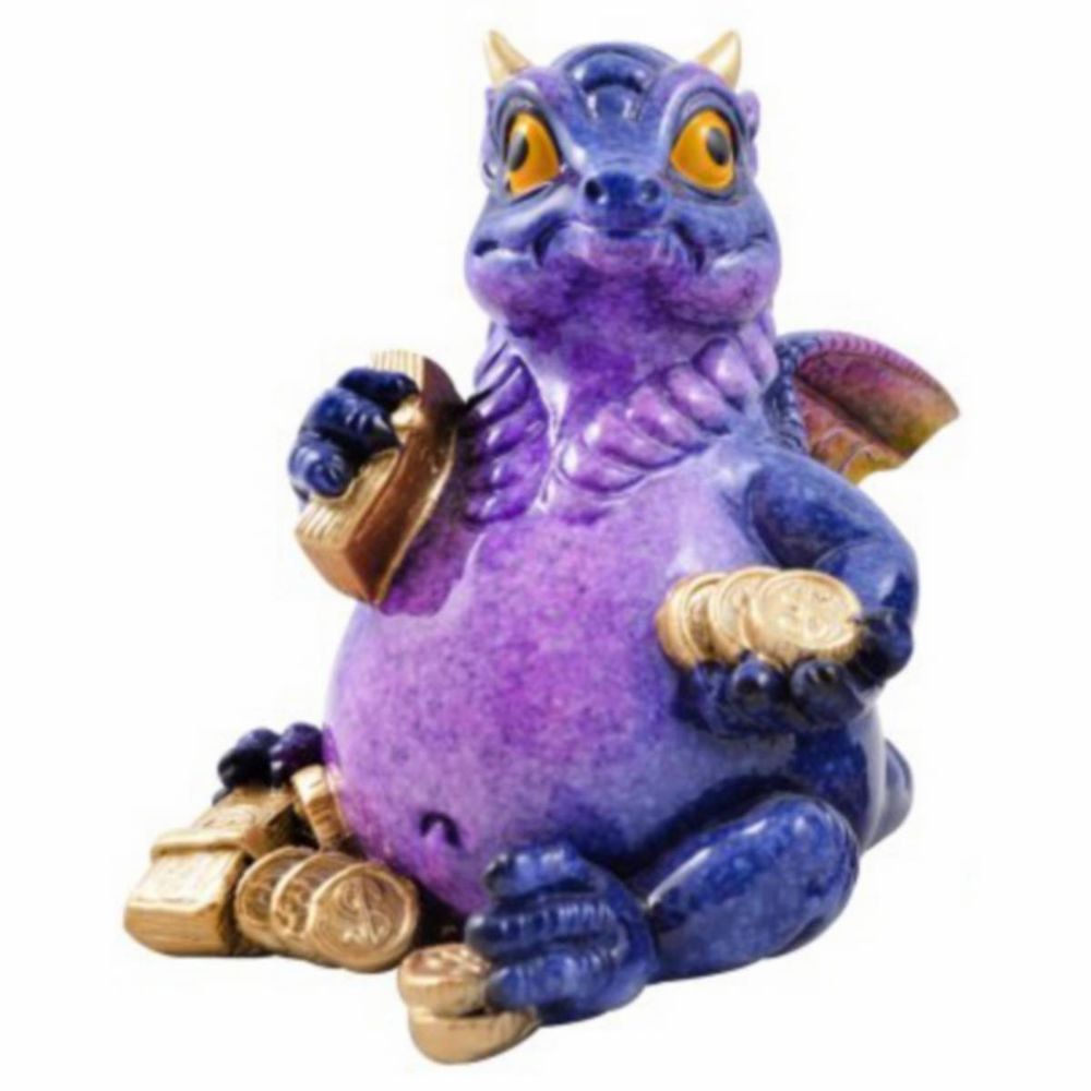 Lustiger kleiner lila-blauer Drache spielt mit Geld - Porzellanfinish (Gr. 9x5x5cm)