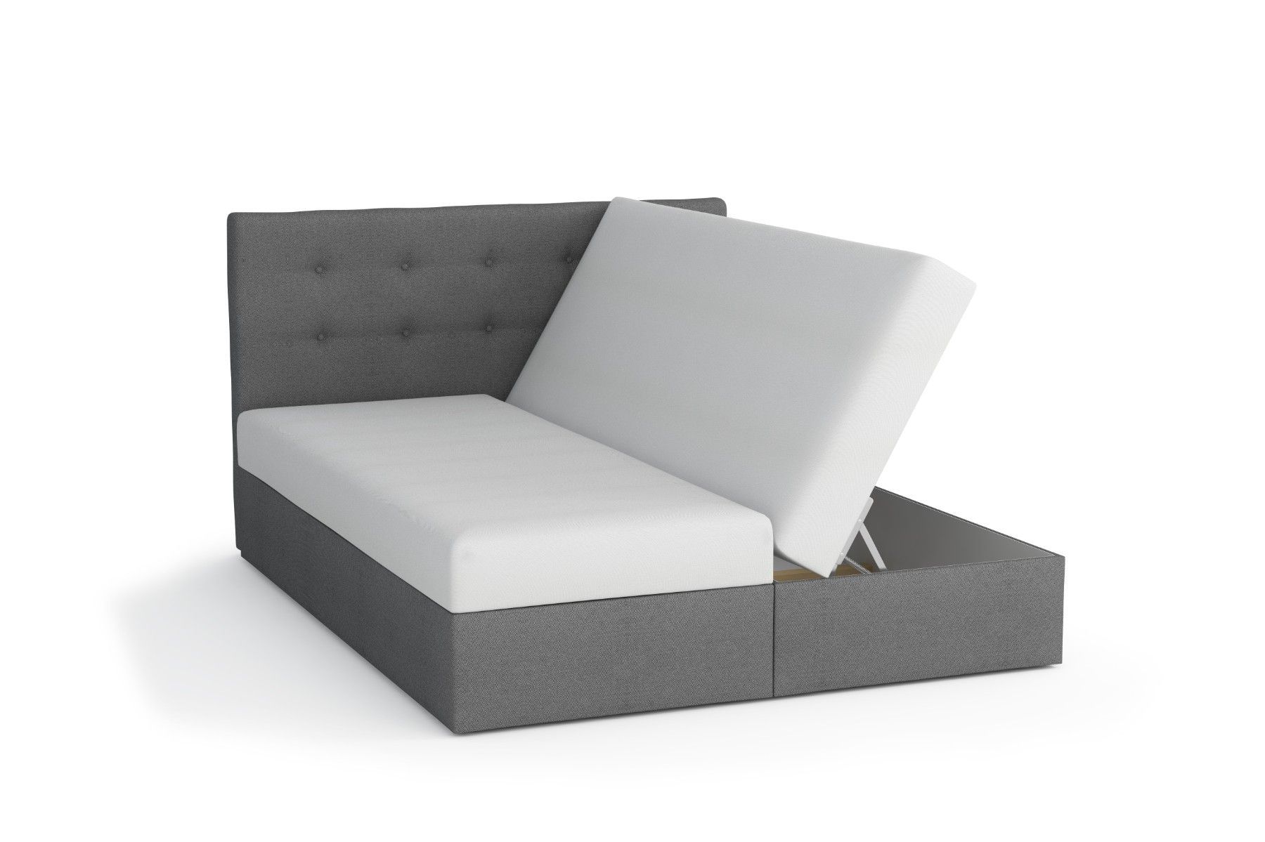 Boxspringbett NAPOLI 2 Gesamtabmessungen: Breite: 145/ 165/ 185/ 205 cm Schlaffläche: 140/ 160/ 180/ 200x200 cm Tiefe: 220 cm Kopfteilhöhe: 114 cm Fußteilhöhe: 60 cm Schlafhöhe: 45 cm Schlafhöhe mit Topper: 50 cm Fußhöhe: HOLZ beine 10 cm Anzahl der Behälter: 2 Aufbau: Spanplatte + Holz Ausklappbar Bettkasten Schnelle und einfache Installation