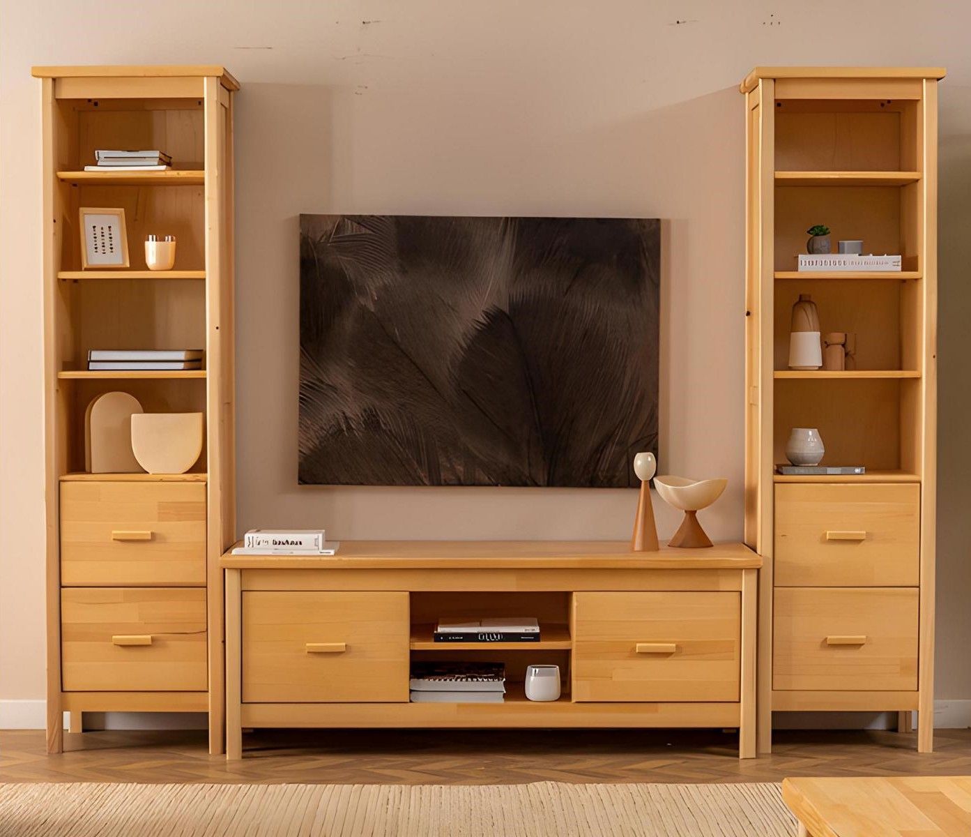 Luxuriöse Beige Wohnzimmer Garnitur RTV-Ständer 2x Holz Vitrinen 3tlg