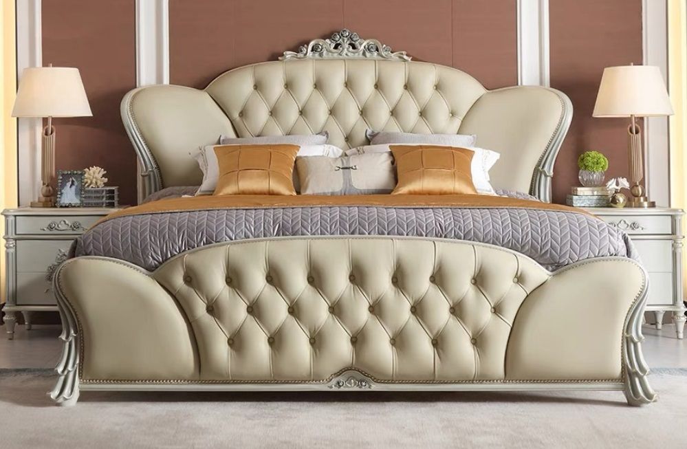 Luxuriöses Chesterfield Bett Beiges Kunstleder Bett Massivholz Bett