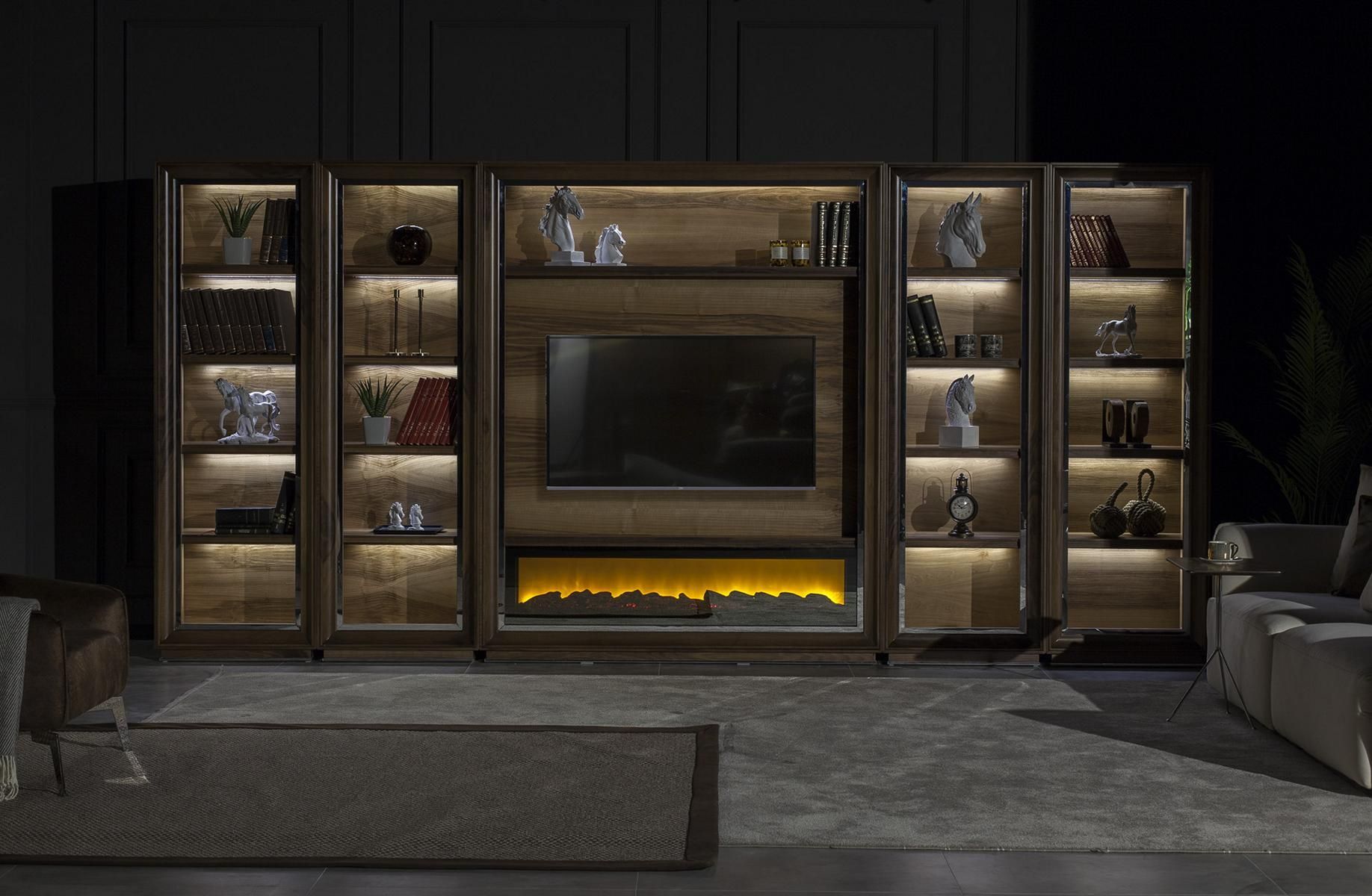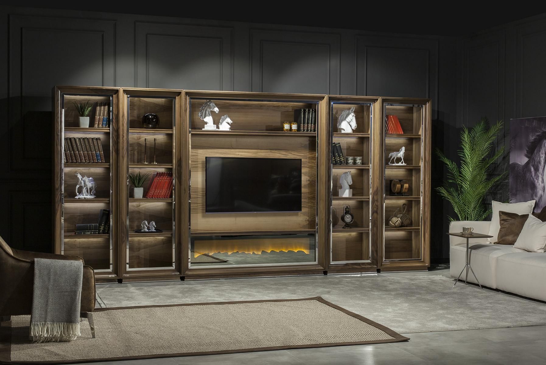 Luxus Wohnwände 448cm Schrank Wand Wohnwand mit Kamin Wohnzimmer Holz