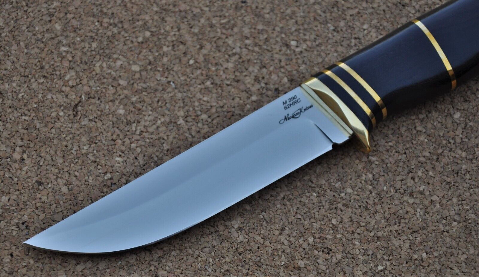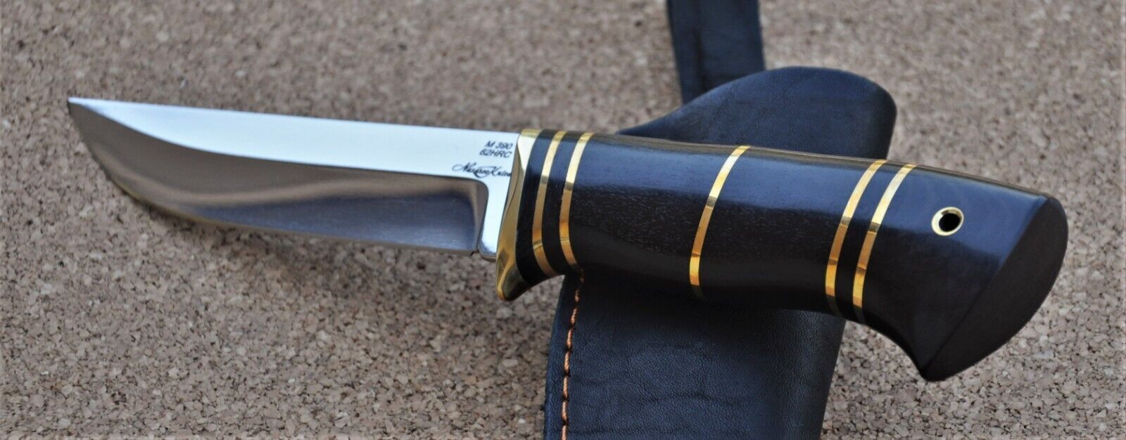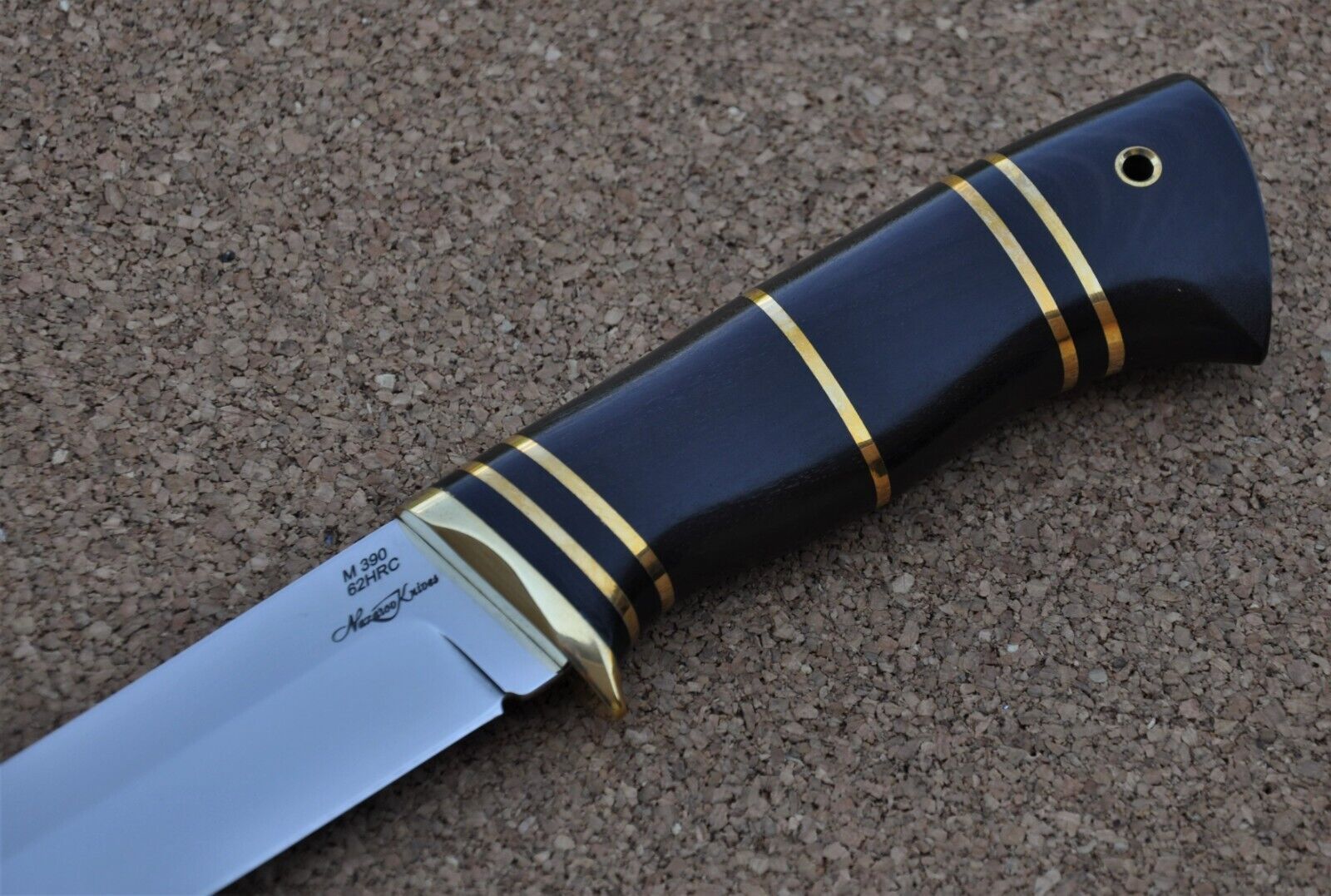 Zum Verkauf steht ein Jagdmesser aus M390 Stahl der Firma Nazarov Knives aus Russland. Parameter: Messerlänge: ca. 245 mm Klingenlänge: ca. 125 mm Rückenstärke: ca. 2,3 mm Klingenbreite: ca. 28 mm (mittig gemessen) Stahl: M390 poliert HRC: 62 Griffmaterial: schwarze Hainbuche+ Messing Gewicht: ca. 1