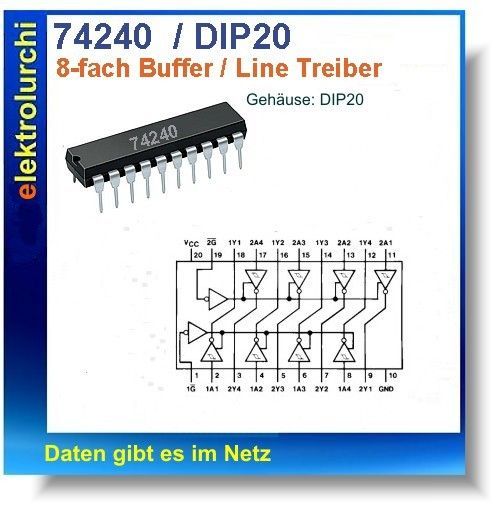 Sie bieten hier auf folgende Artikel NEU 1 Stück M74HC240B1 - 8-fach Buffer Line Driver, 3-State Output, DIP20, IC, ST Thomson Der Baustein zählt zu der 74HCxxx Serie Technische Daten Versorgungsspannung: 15VDC Betriebstemp.: 0EuroC to +70 Grad Gehäuse: DIP20 (Bild zeigt die Gehäuseform) Hersteller: