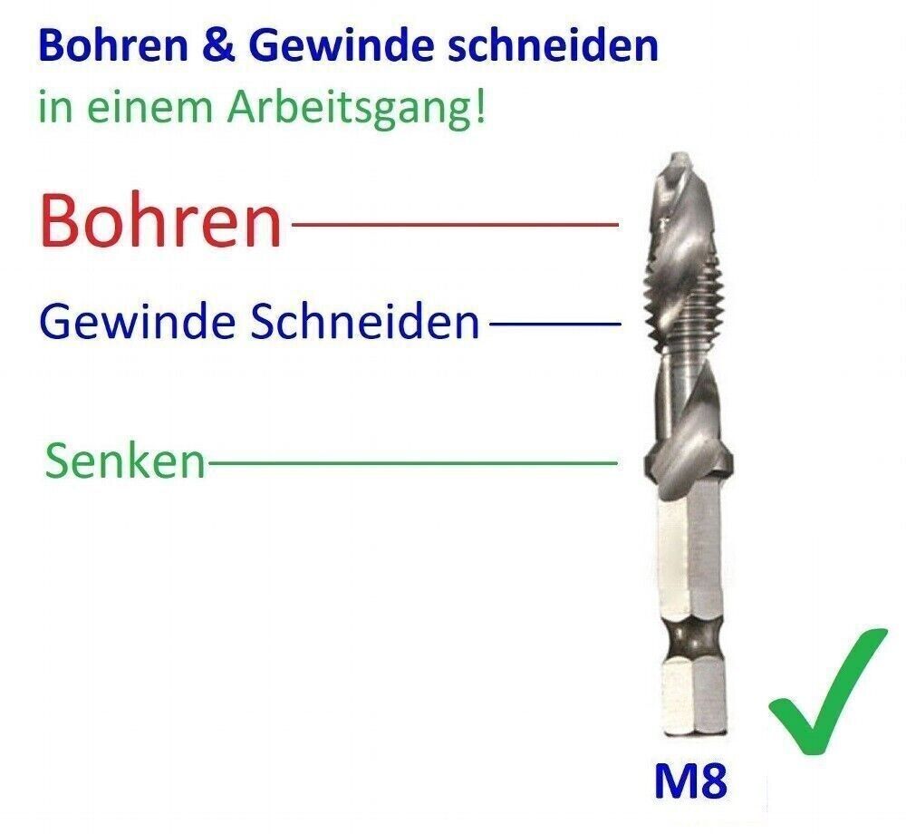 Kernloch bohren, Gewinde schneiden & senken. Alles in einem Arbeitsgang mit dem Kombo Gewindebohrer. Lieferumfang: HSS Kombo Gewindebohrer M8