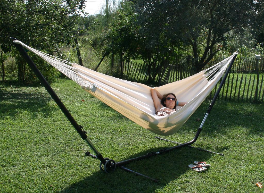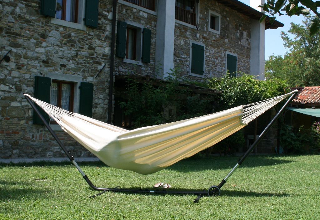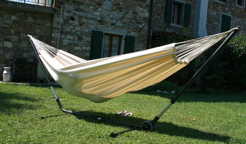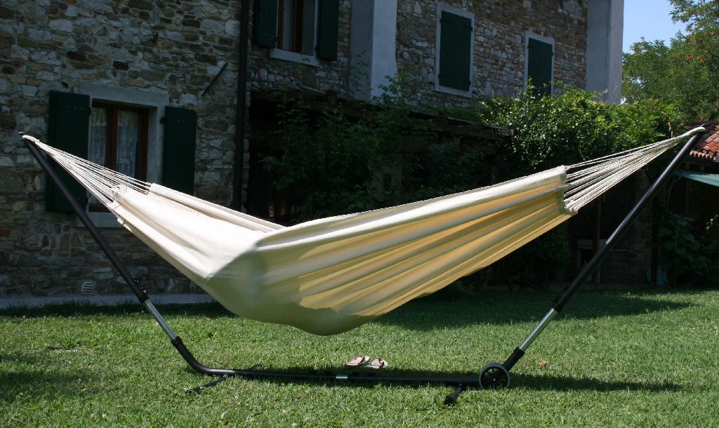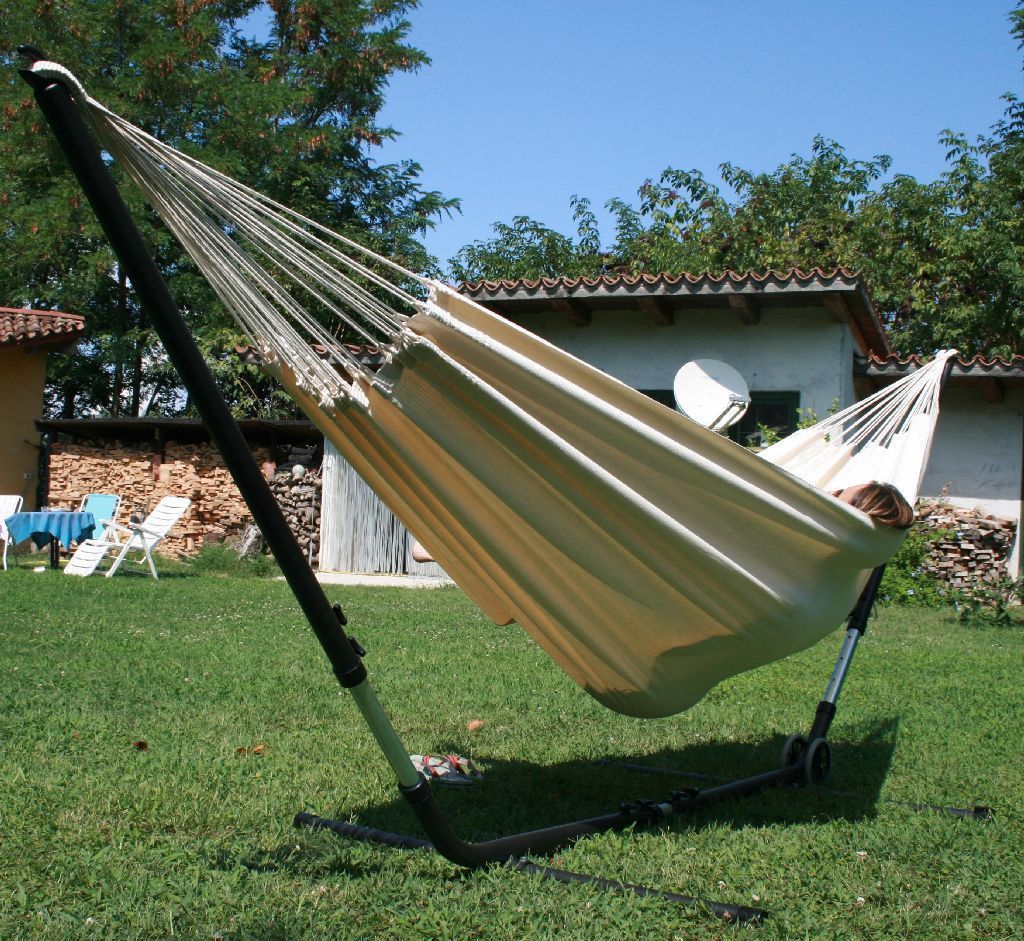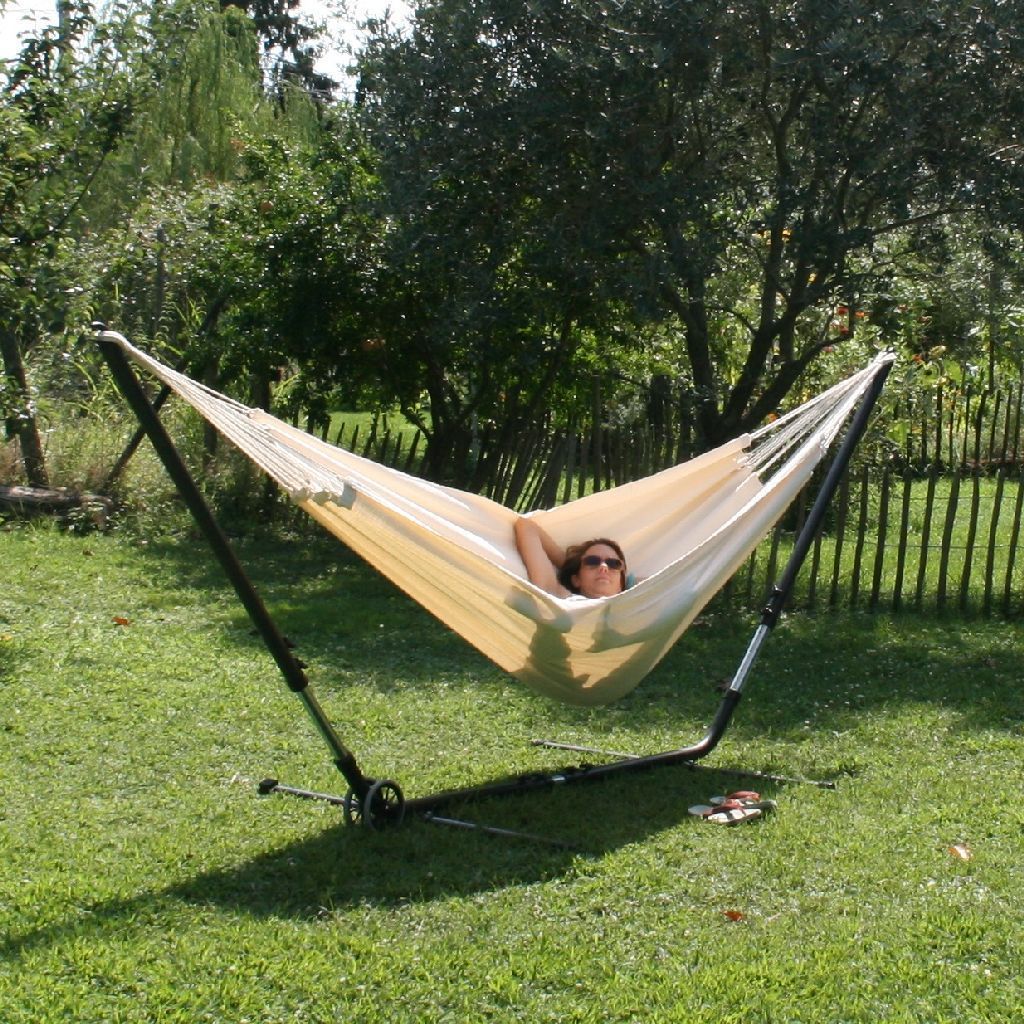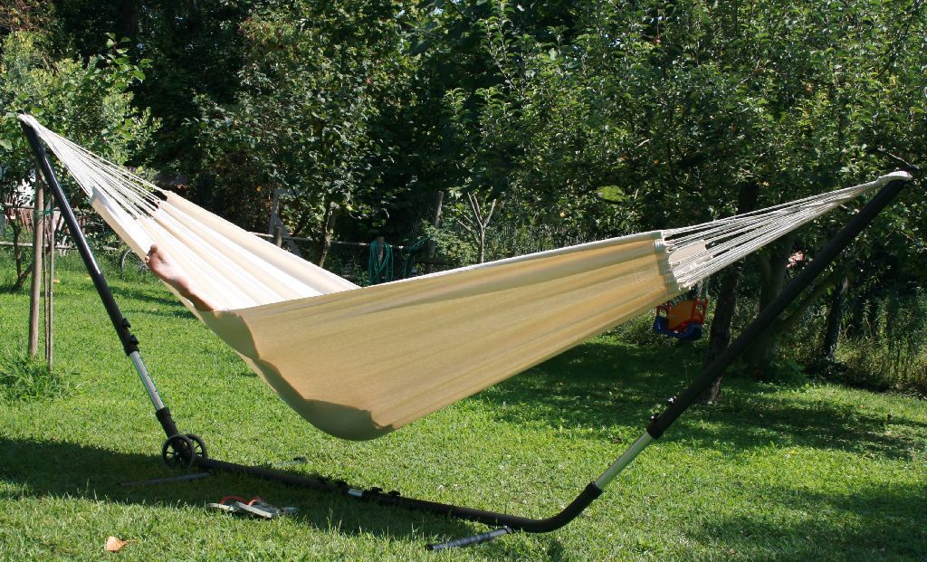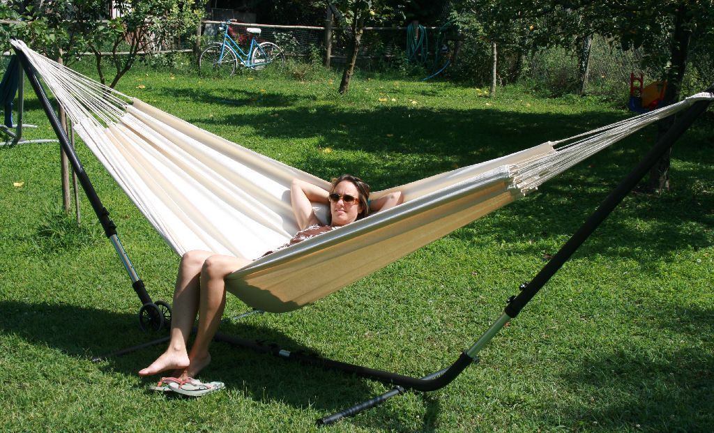 Das Cuba Gigante Hängematten Set ist ein längen- und höhenverstellbares Metallgestell und eine natur weiße Tuchhängematte aus Baumwolle. Die Brasilianische Doppelhängematte ist für zwei Personen geeignet und bis 180 kg belastbar. Der extra starke Hängemattenständer aus pulverbeschichtetem Stahl ist