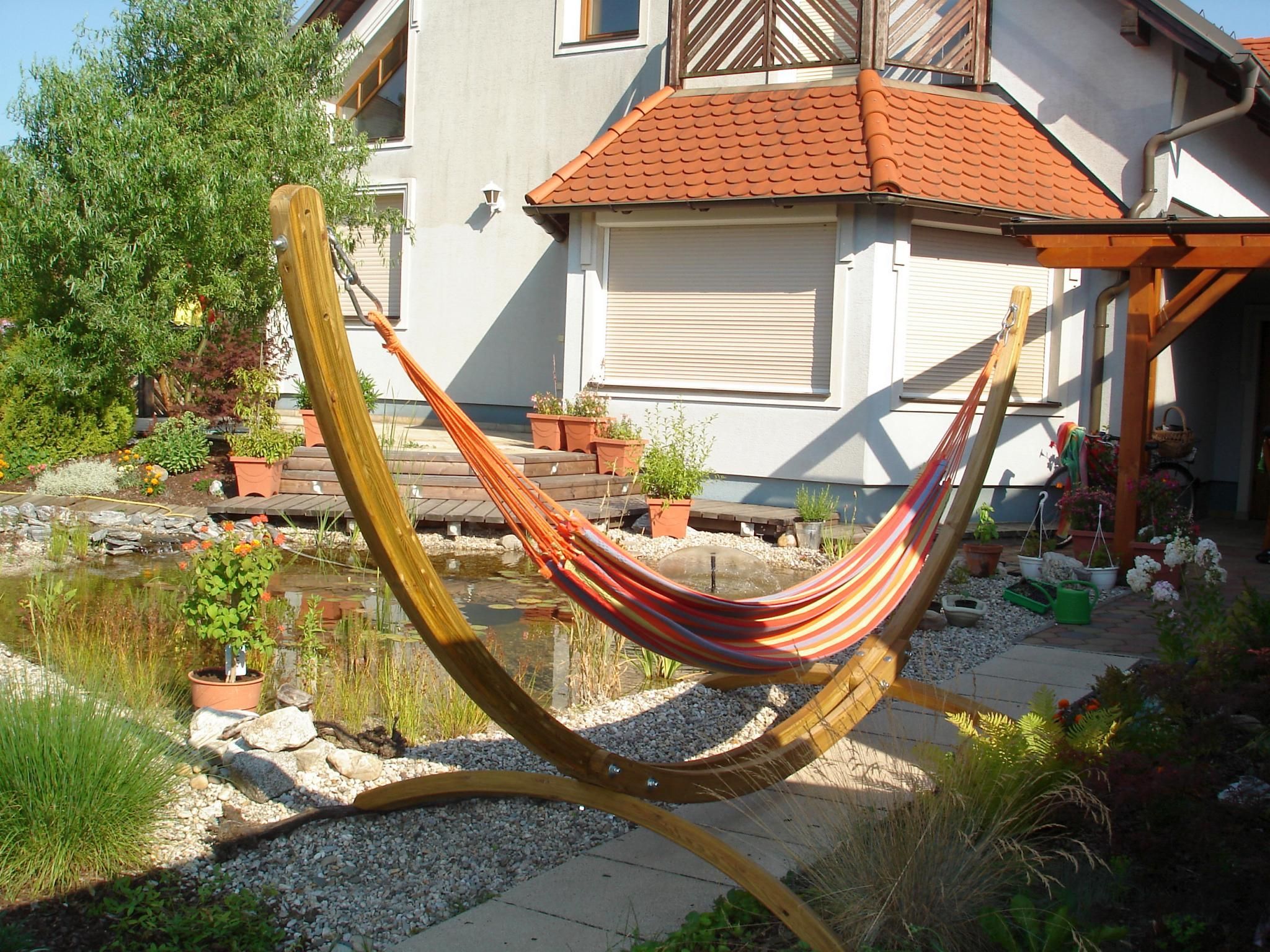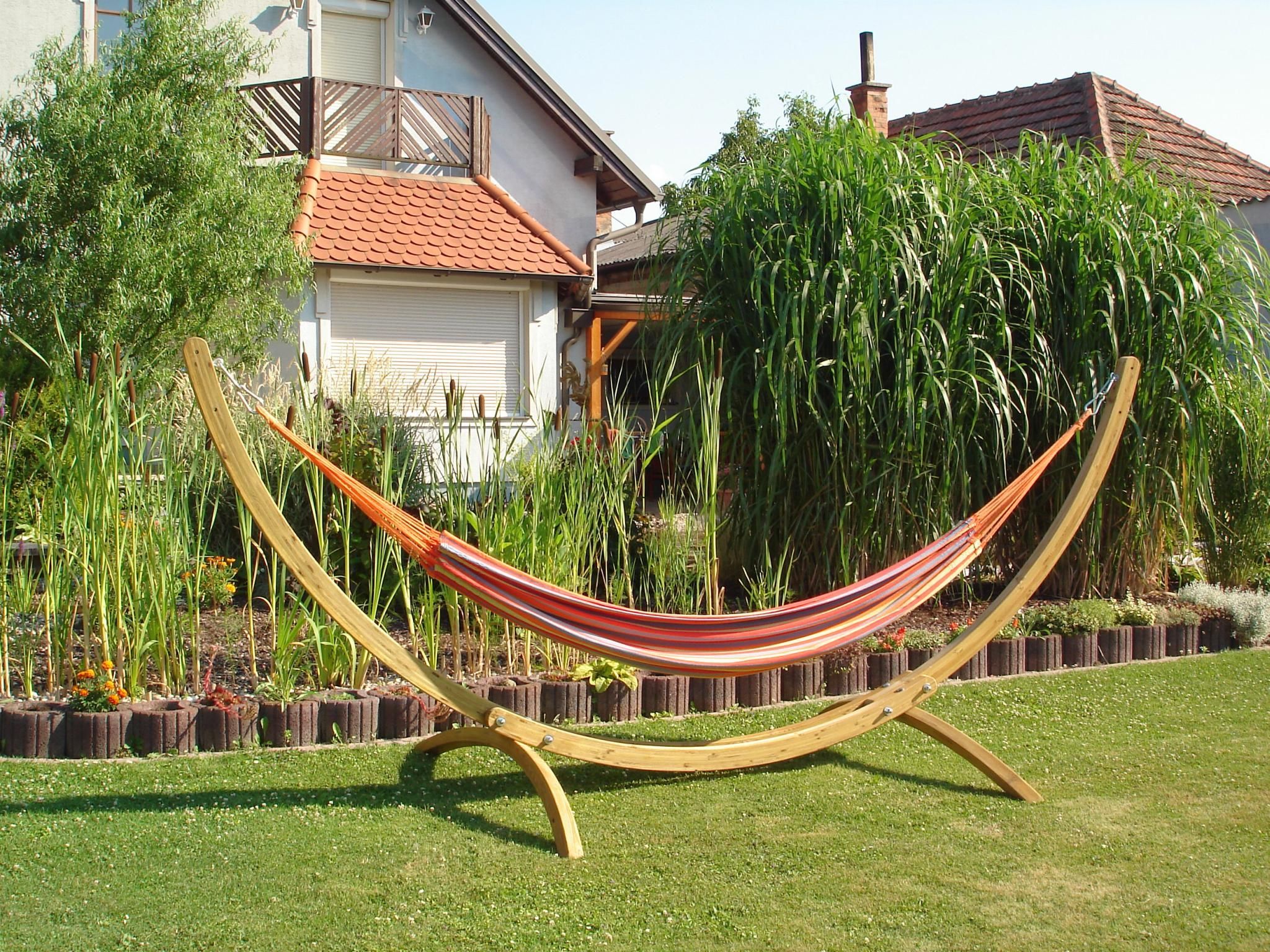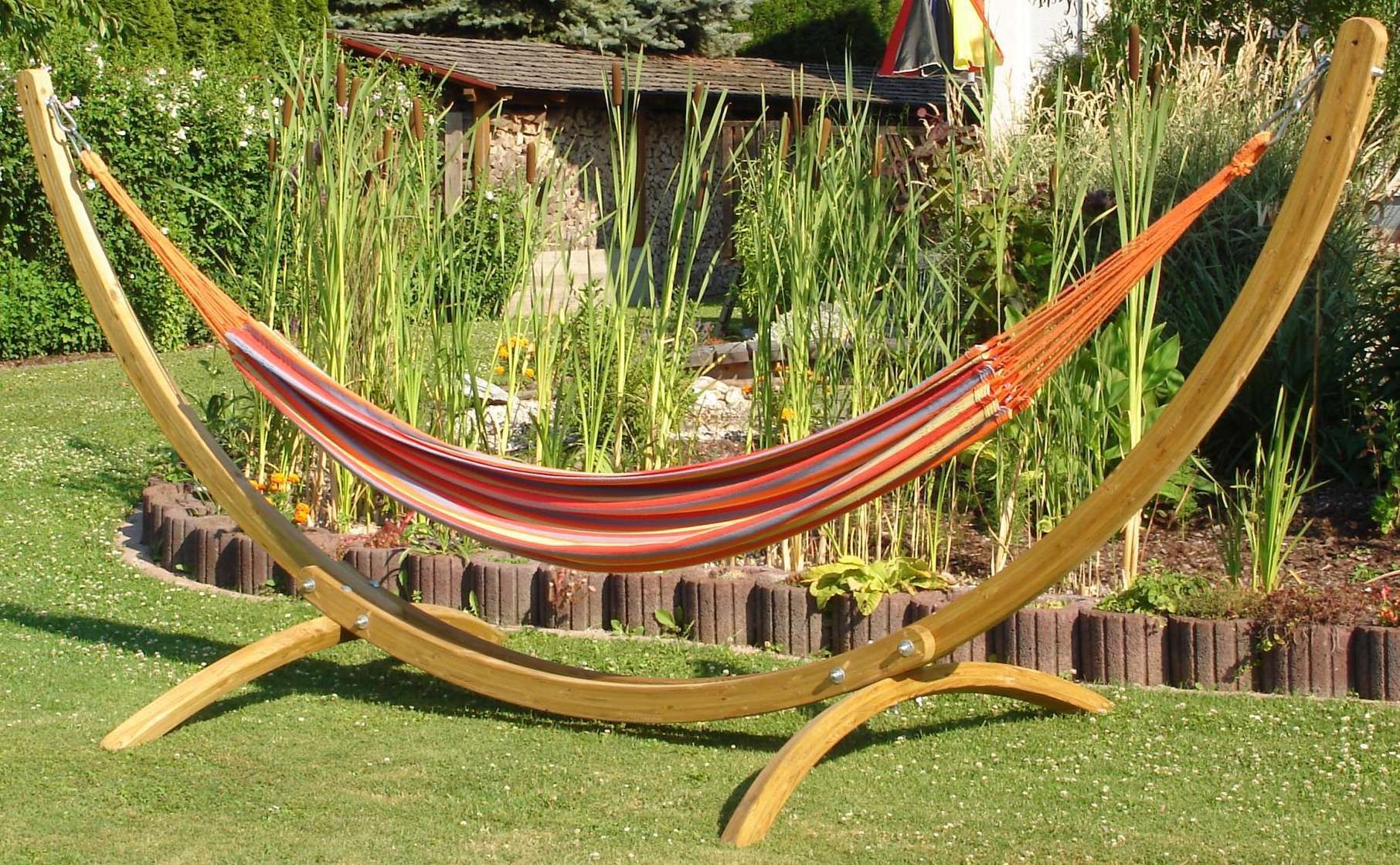 Diese Kombination aus extra großer Hängematte mit Gestell ist ein schönes Gartenmöbel zum Liegen und Träumen für ein bis zwei Erwachsene. Die bunte Baumwollhängematte wurde in Brasilien gefertigt. Farbe wielobarwnosc Grösse Standard Abmessungen Liegefläche 245 x 160 cm Gesamtlänge 400 cm Belastbarke