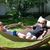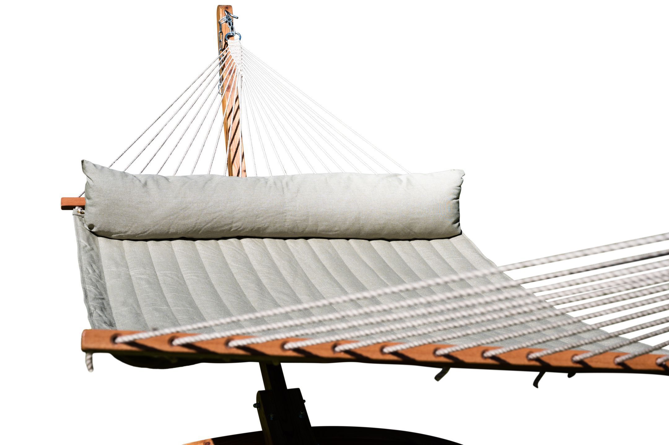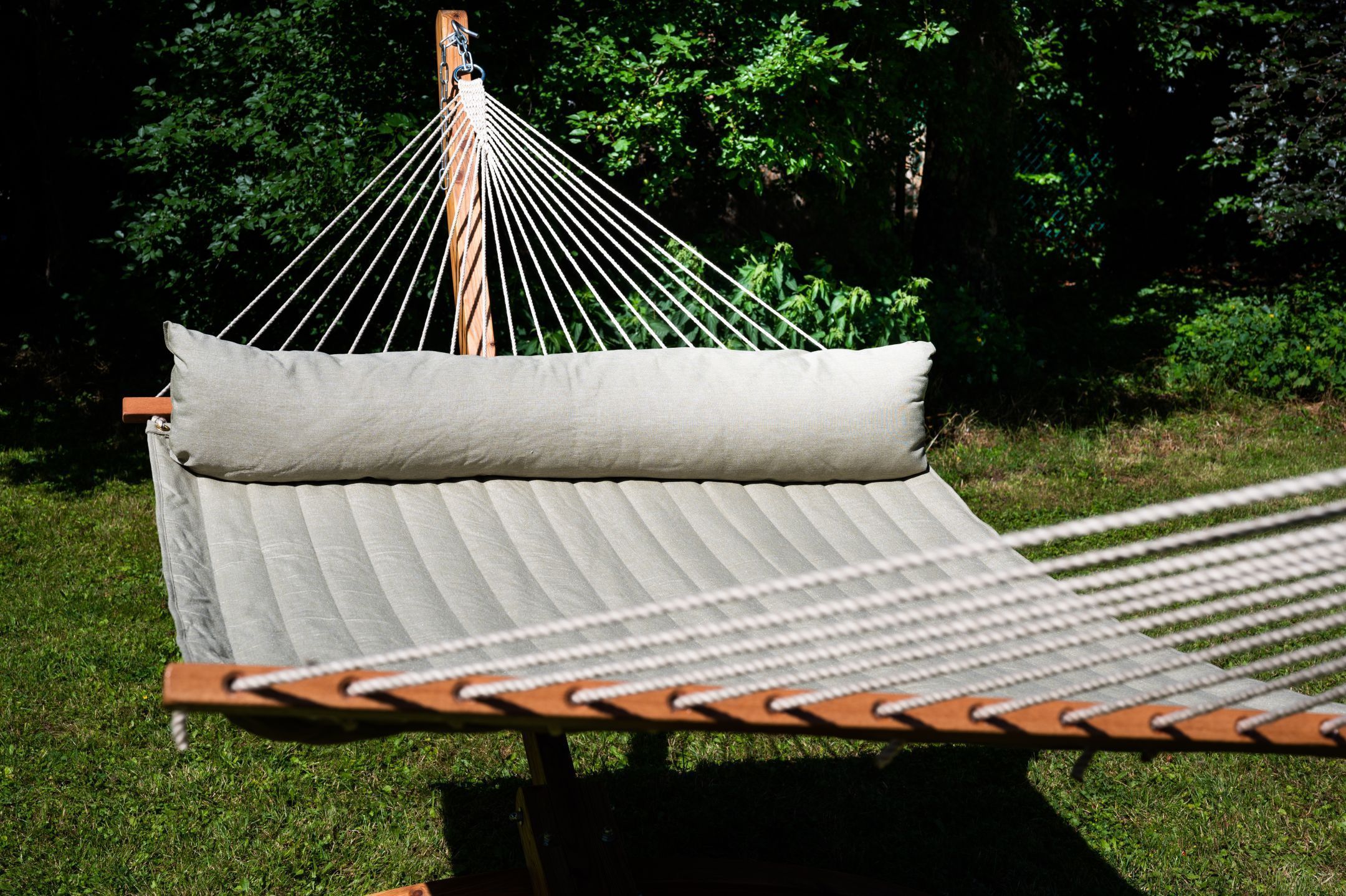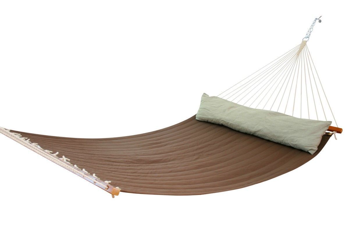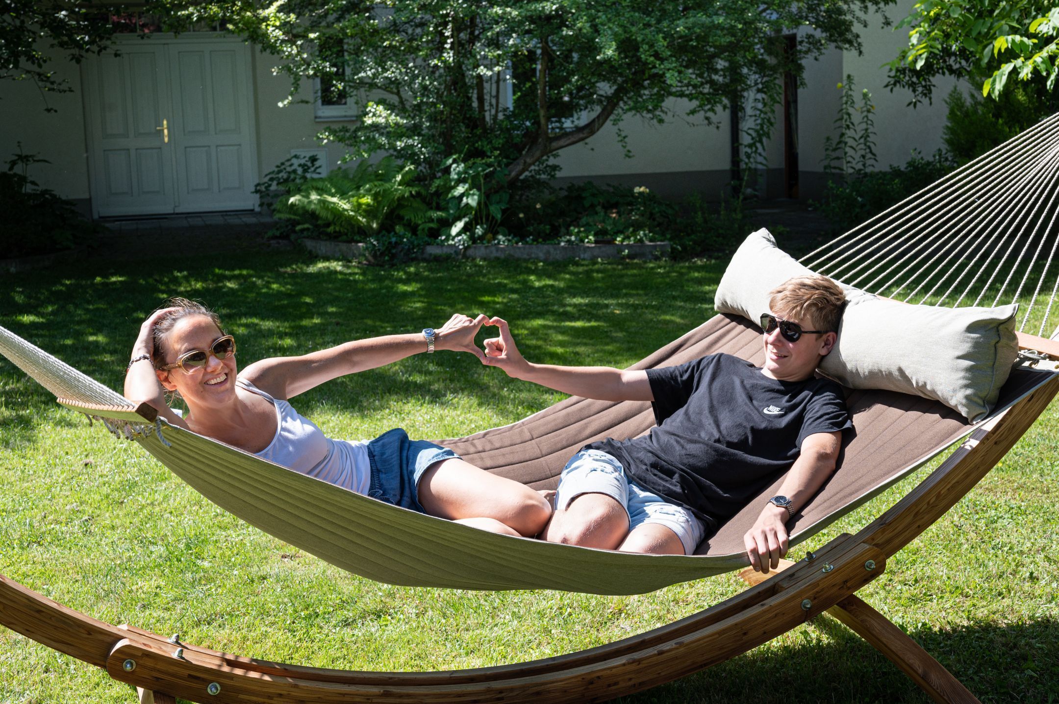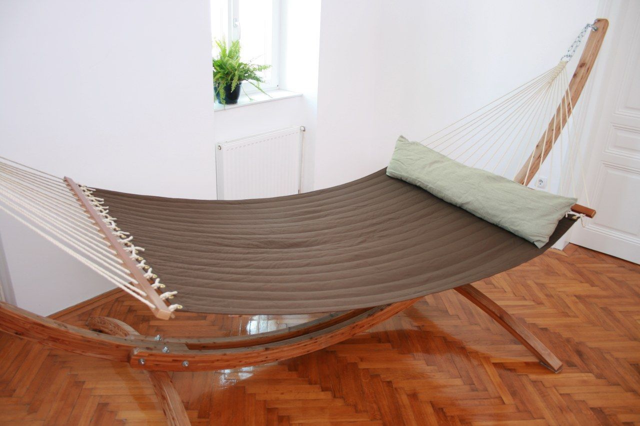 <p>Dieses Hängemattenset besteht aus dem extra großen Holzgestell Siesta Grande und der Doppelhängematte California Terra. Die Stabhängematte hat eine breite, gepolsterte Liegefläche und ein extra Kopfkissen. Die Oberseite der Hängematte mit Holzspreizstab ist flachsgrün, die Unterseite Schokola