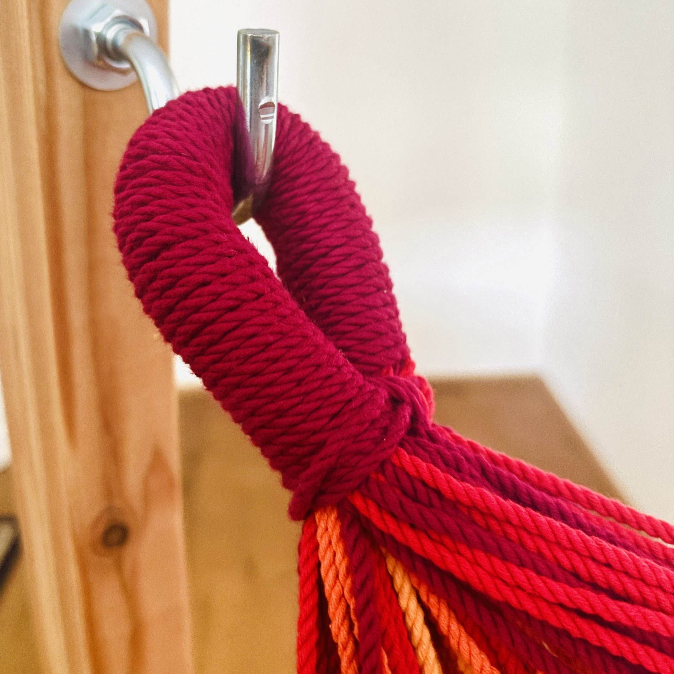 Dieses Hängesessel-Set ist robust und umweltfreundlich zugleich. Der Netzhängesessel wurde mit viel Zeit und Sorgfalt in Handarbeit hergestellt. Jeder Hängestuhl ist ein Unikat. Die extra dicken Baumwollschnüre sorgen für ein strapazierfähiges, dichtes Netz. Dadurch wird die Sitzfläche stabil und la