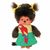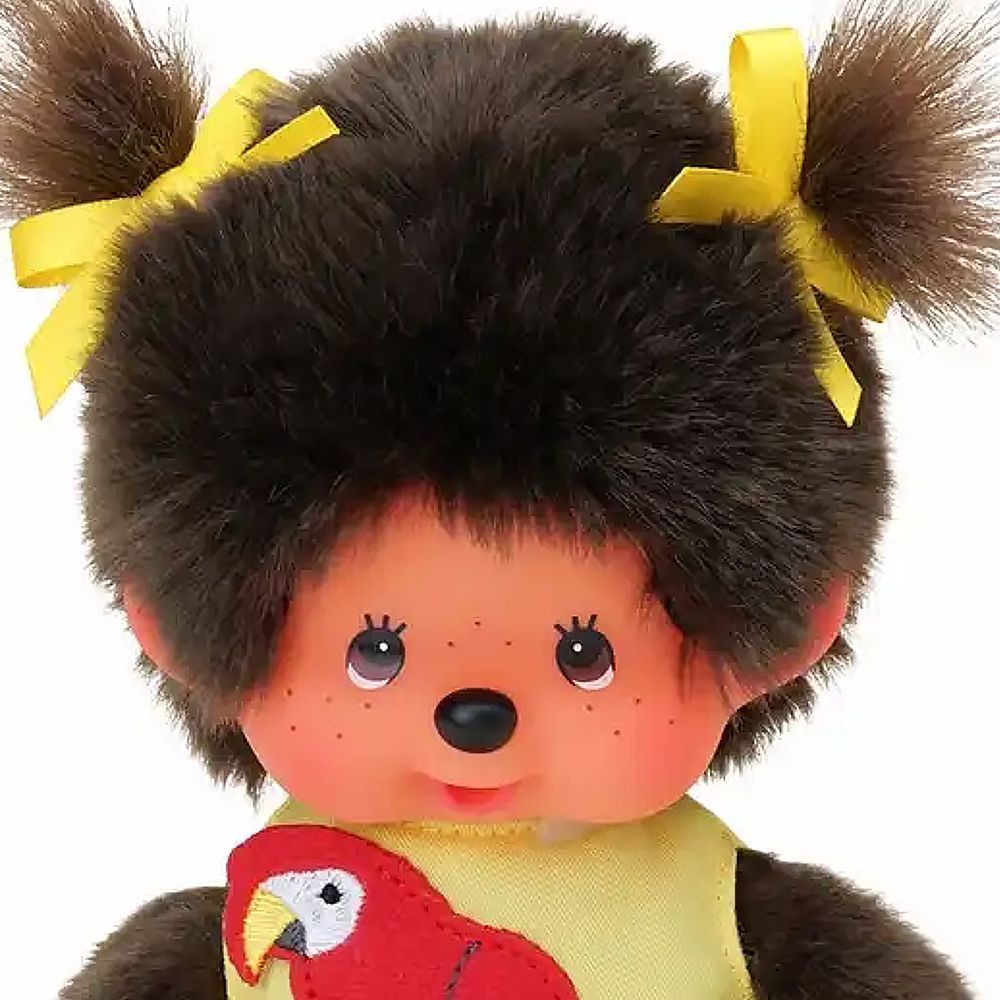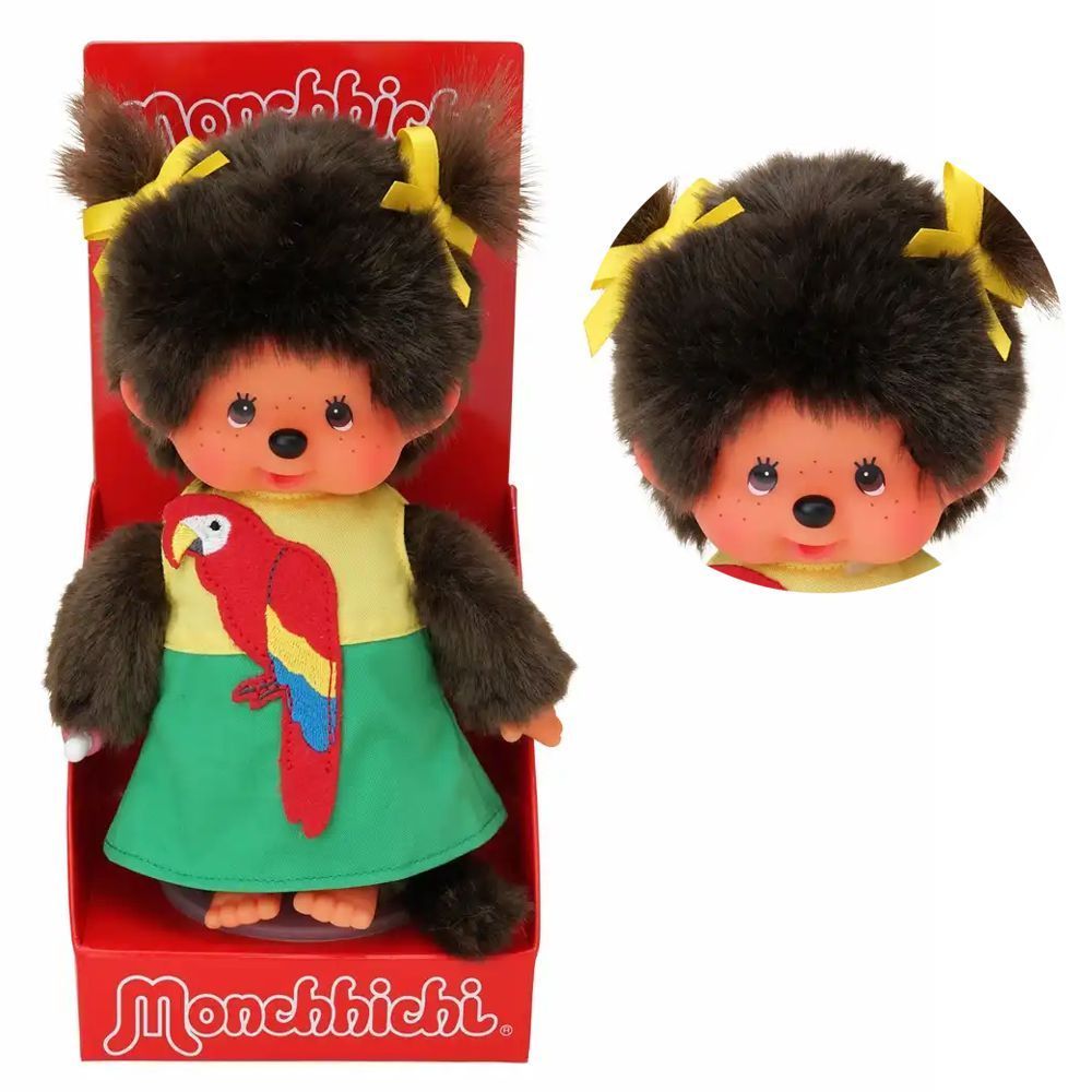 Mädchen im Papageien-Kleid | 20 cm Monchhichi Puppe mit zwei Zöpfchen