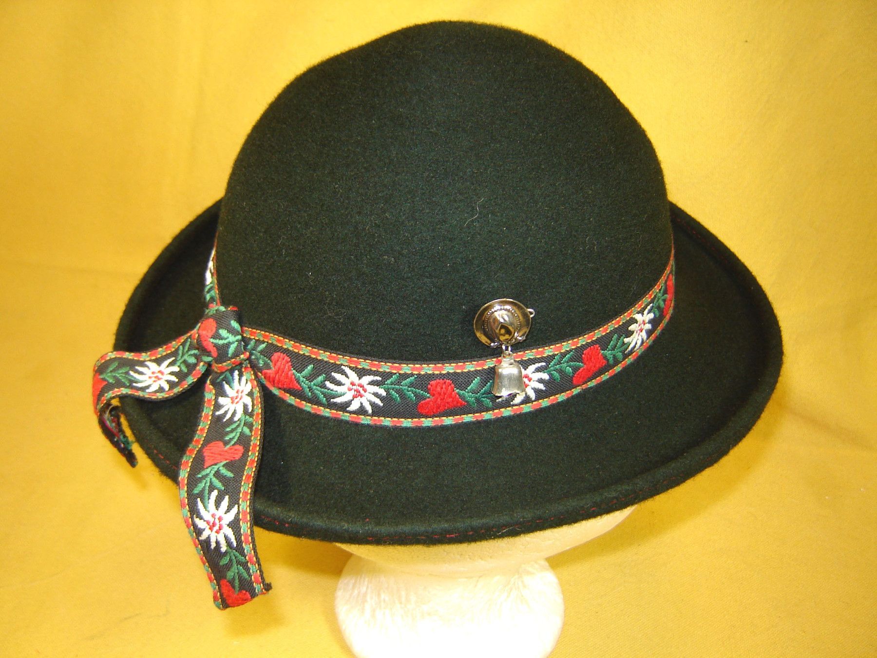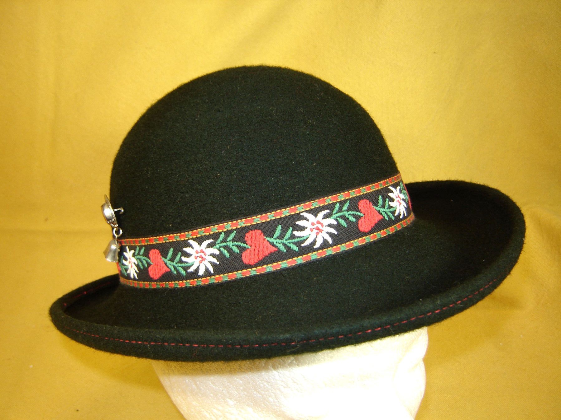 . Einzelstück ausgefallener Mädchenhut aus wetterfestem 100% Wollfilz in Farbe dunkelgrün hübsche Trachtenform mit rundum aufgeschlagenem Rand sehr schön verarbeitet mit Baumwoll Innenband mit bunter Edelweißborte und Schleifchen hinten in Größe 52- 53 cm Kopfumfang . . Bitte Sehen Sie sich hier all