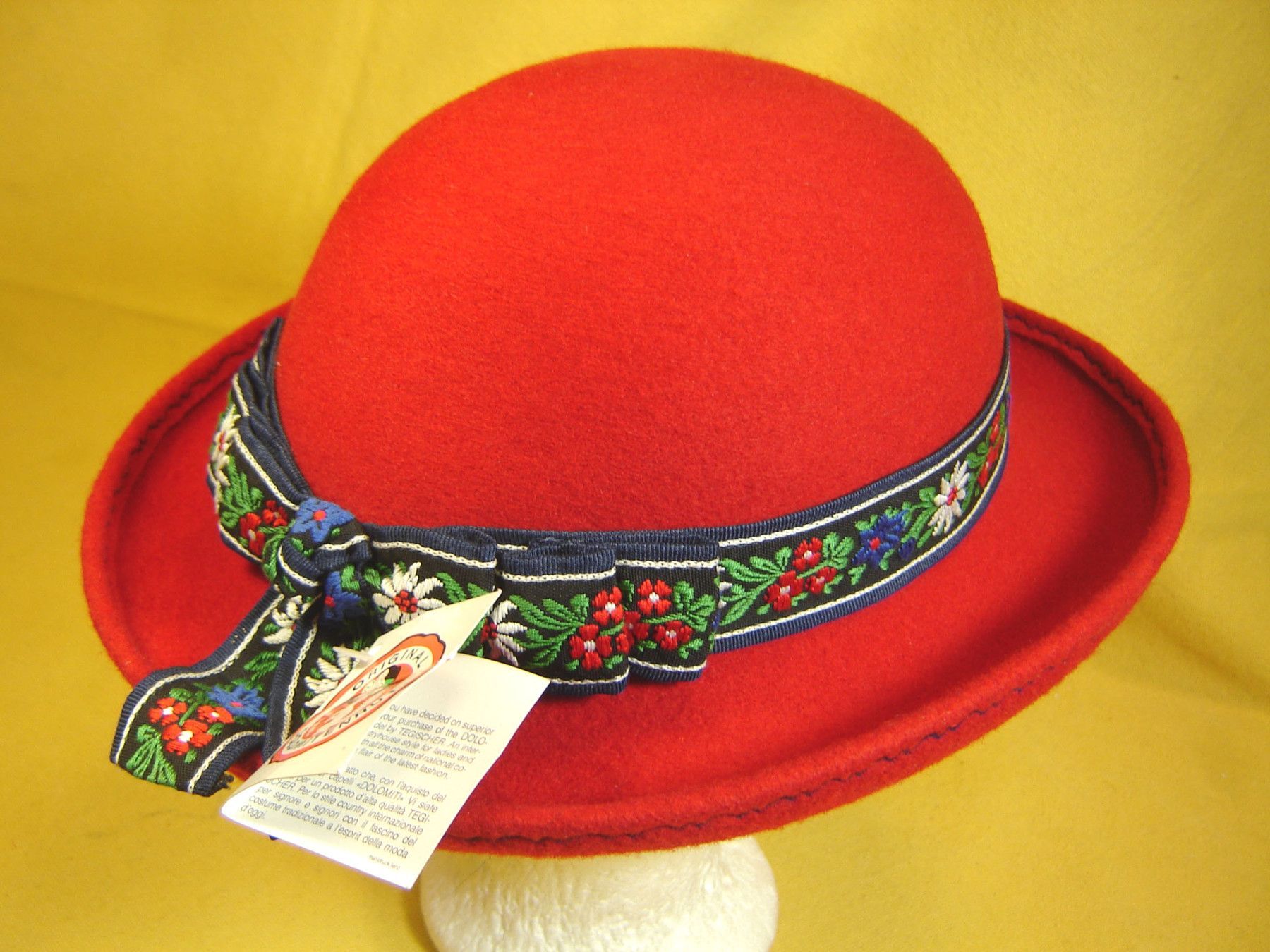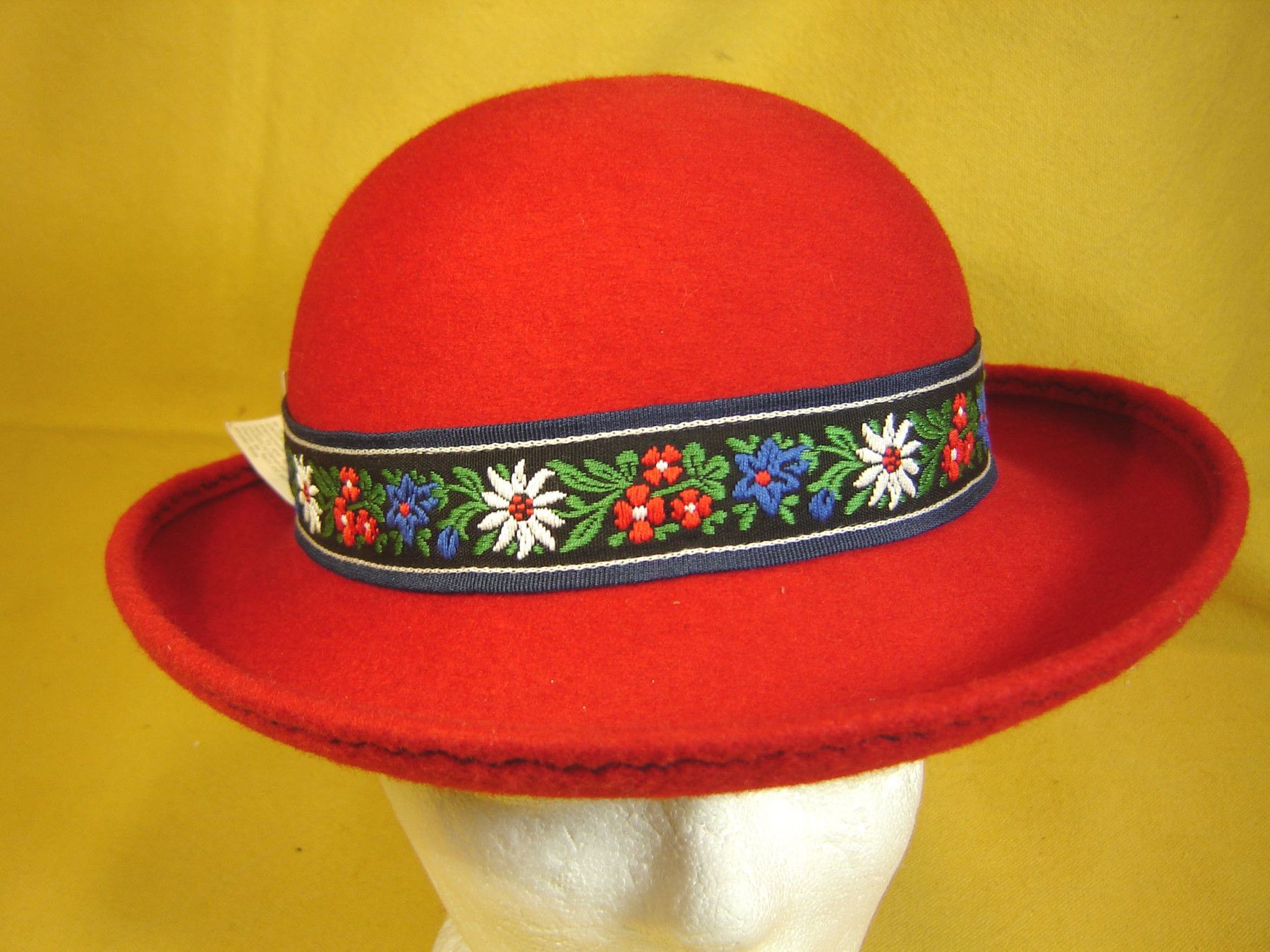 . Einzelstück ausgefallener Mädchenhut aus wetterfestem 100% Wollfilz in Farbekräftig rot hübsche Trachtenform mit rundum aufgeschlagenem Rand sehr schön verarbeitet mit Baumwoll Innenband mit bunter Edelweißborte und Schleifchen hinten in Größe 53- 54 cm Kopfumfang . . Bitte Sehen Sie sich hier all