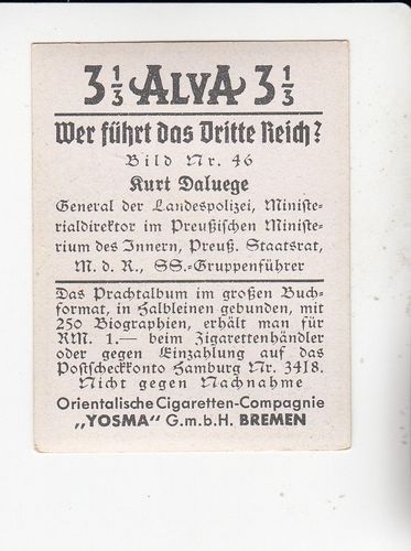 Sammelbild aus der Männer im dritten Reich Wer führt das Dritte Reich verschiedene Rückseiten Herausgeber Zigarettenfabrik Brinkmann Bremen Alva Yosma aus den Jahre 1933 Bildgröße 6,0 cm x 4,7 cm Bild war noch nicht eingeklebt Erhaltung siehe scan Sämtliche zeitgeschichtlichen und militärhistorische