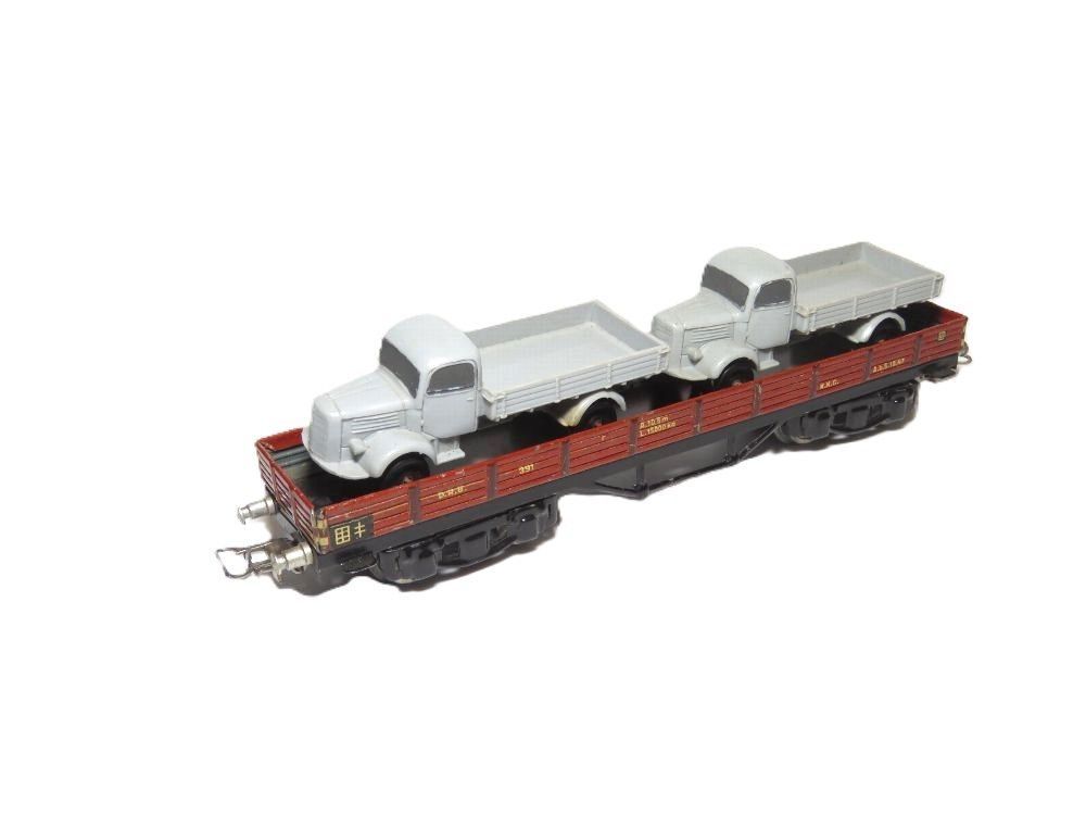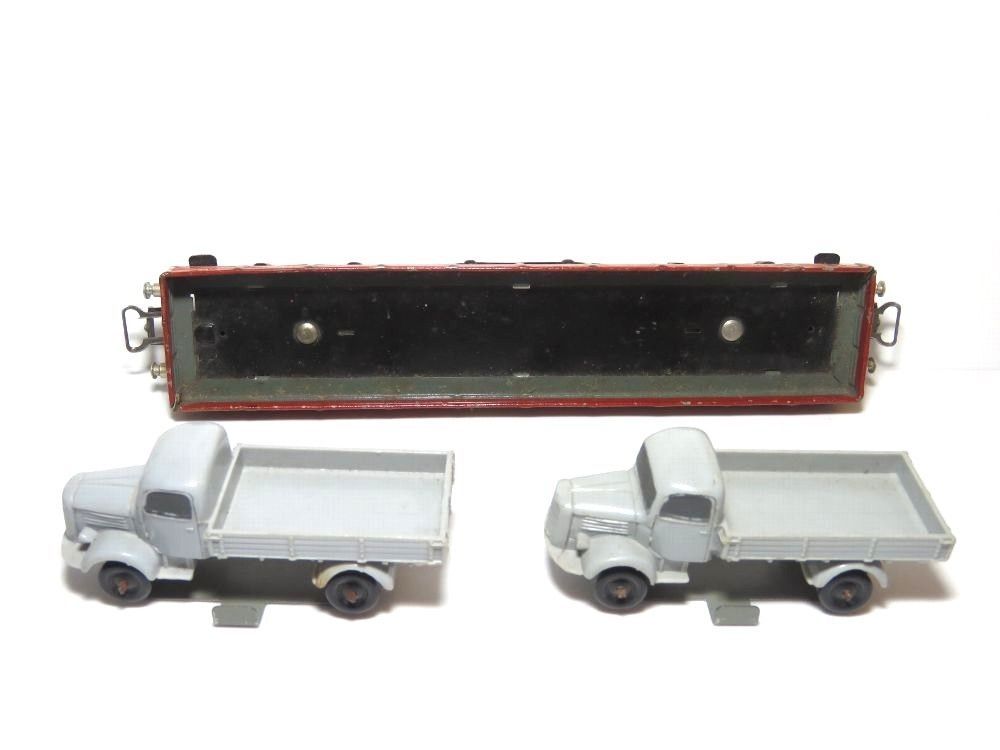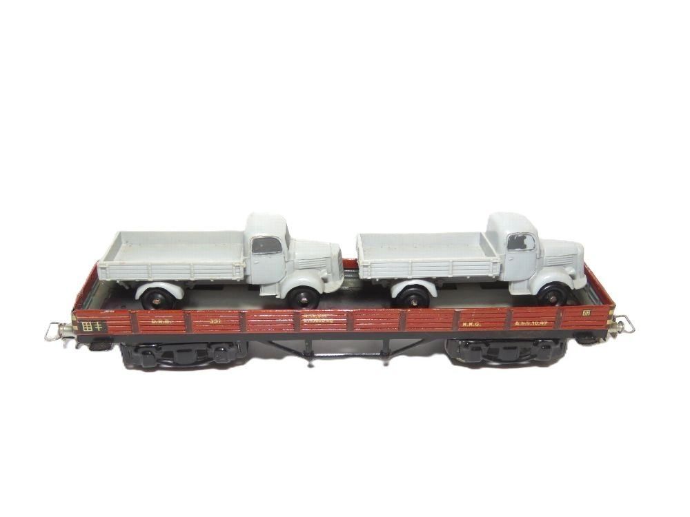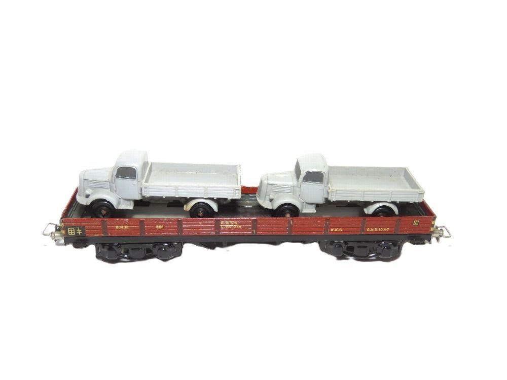 Hersteller: Märklin Artikelnummer: 391 Artikel: Niederbordwagen & 2 x LKW Wagennummer: 391D. R. B. Farbe: Braun NEM Schacht: Nein Bauzeit: 1938 - 1945 Maßstab: 1:87 Originalverpackung: Ja (Da die Verpackung nicht Bestandteil dieses Artikels ist, wird der Zustand nicht näher beschrieben) Anmerkun