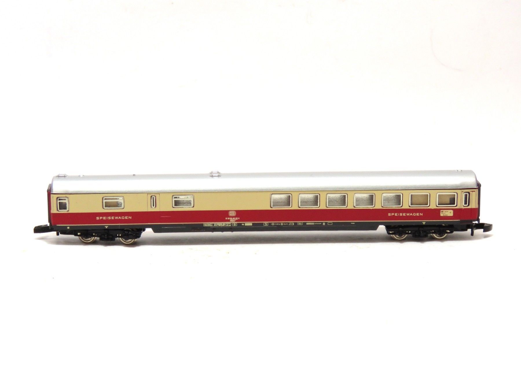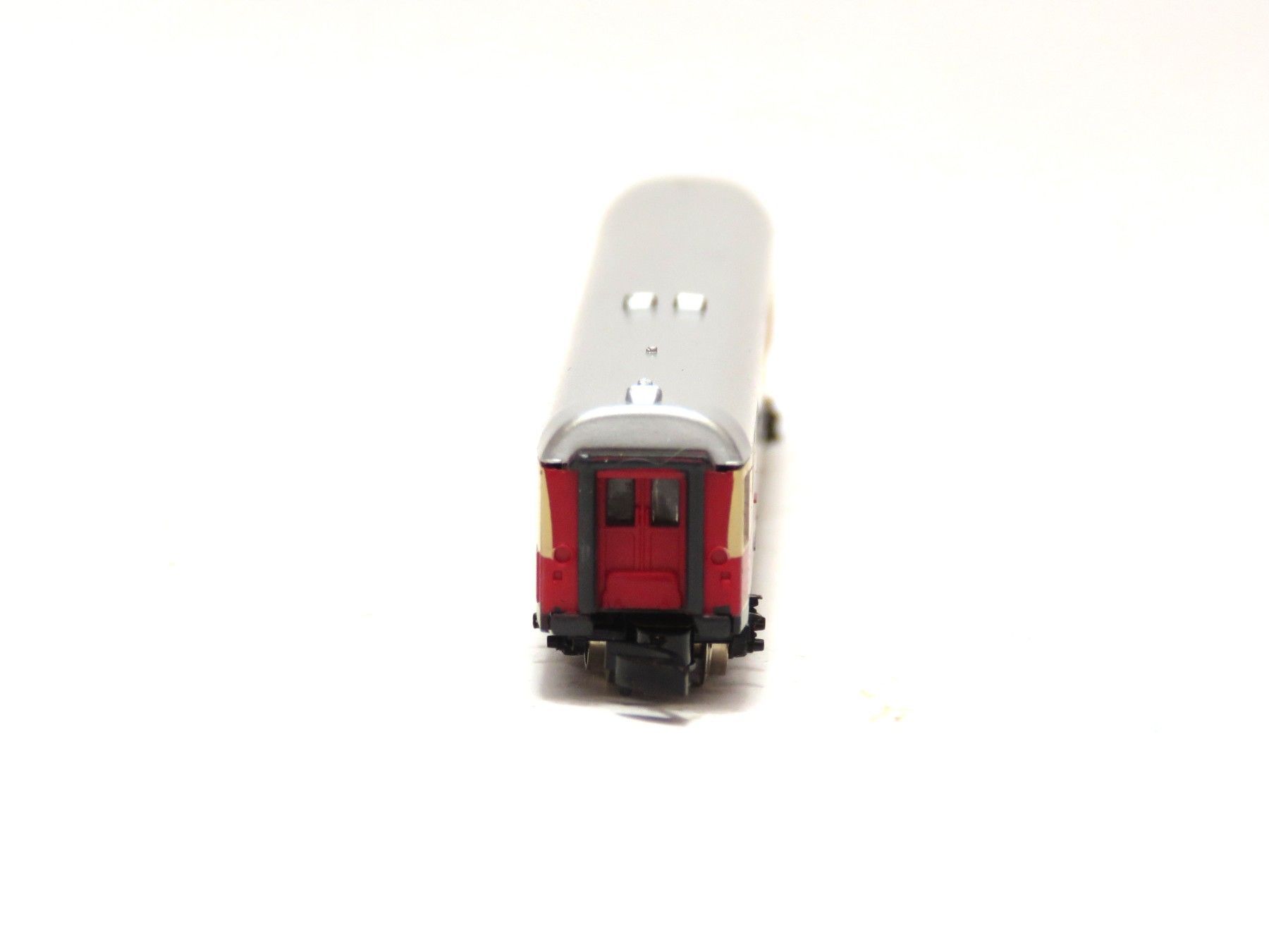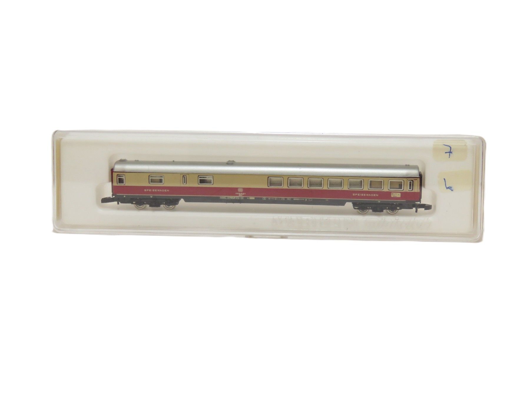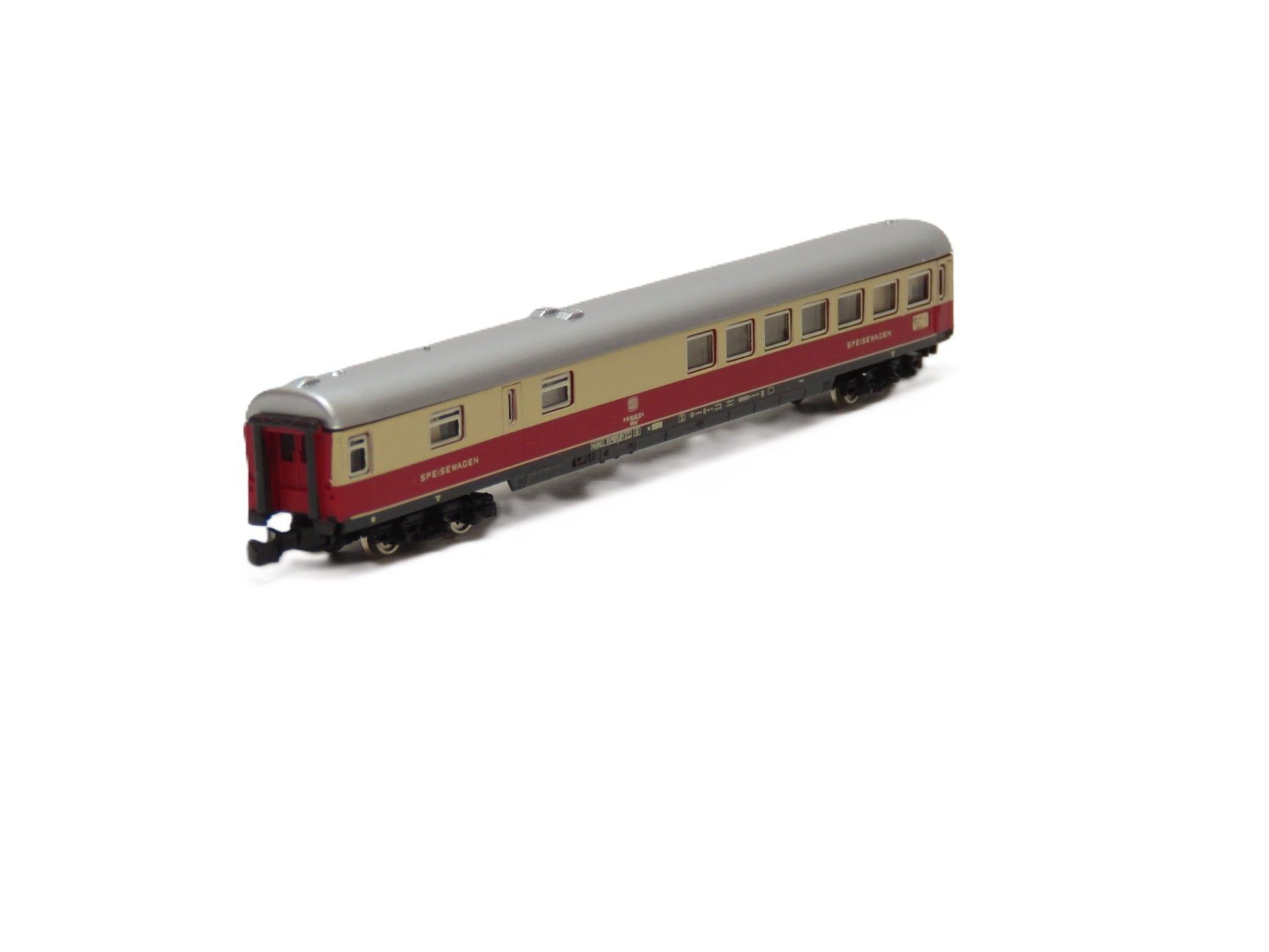 Hersteller: Märklin mini-club Artikelnummer: 8736 Artikel: Speisewagen Innenbeleuchtung: Ja Lichtfunktion: OK Länge: 120 mm Farbe: Rot Beige Maßstab: 1:220 Originalverpackung: Ja (Da die Verpackung nicht Bestandteil dieses Artikels ist, wird der Zustand nicht näher beschrieben) Das Foto ist Teil der