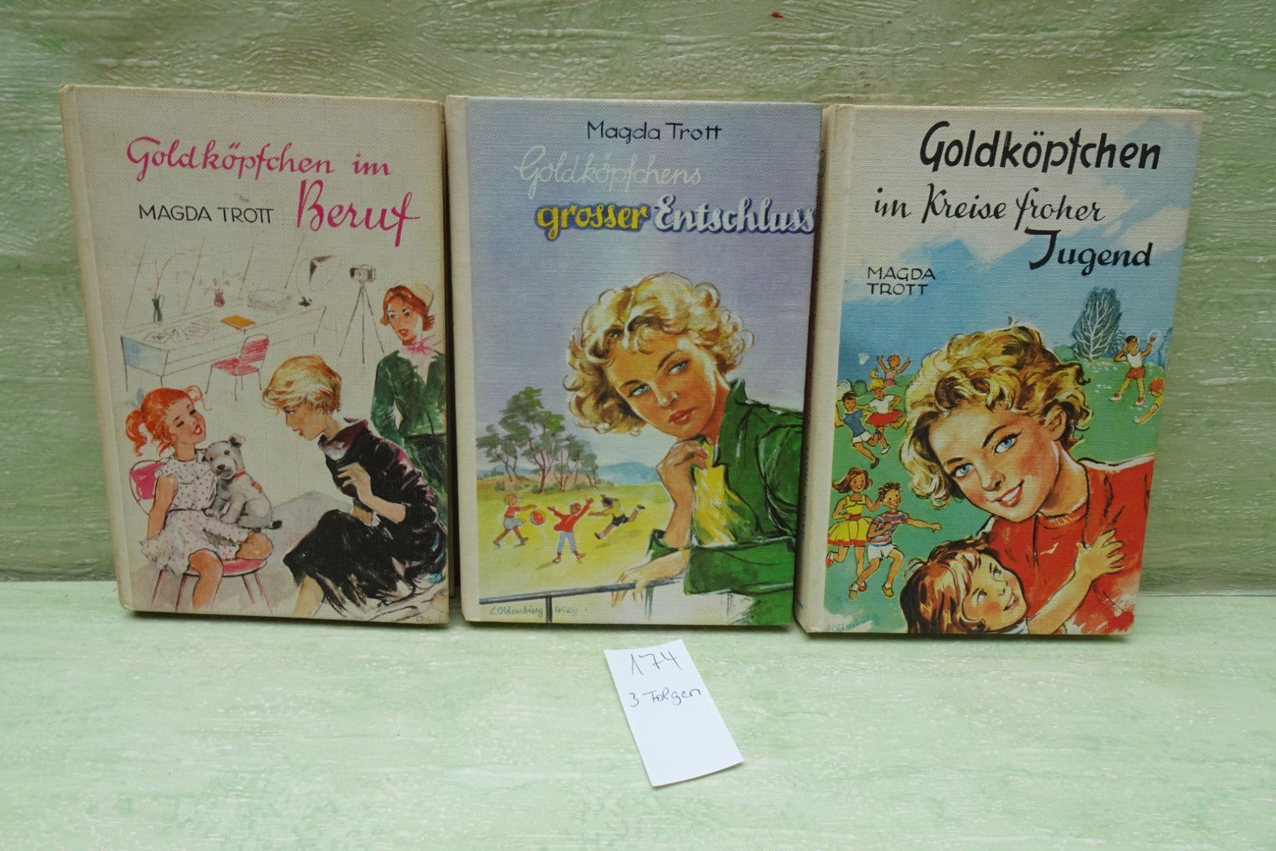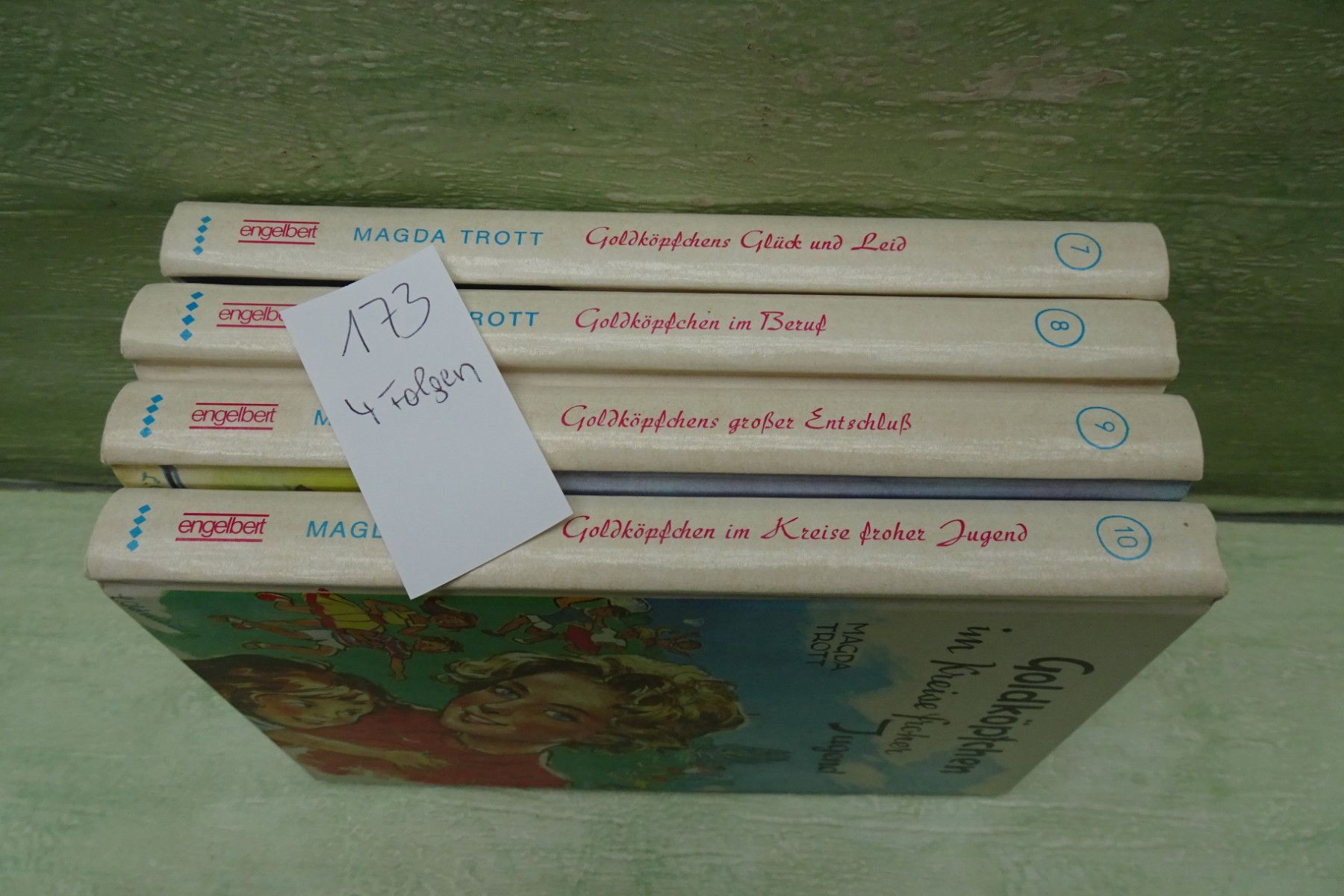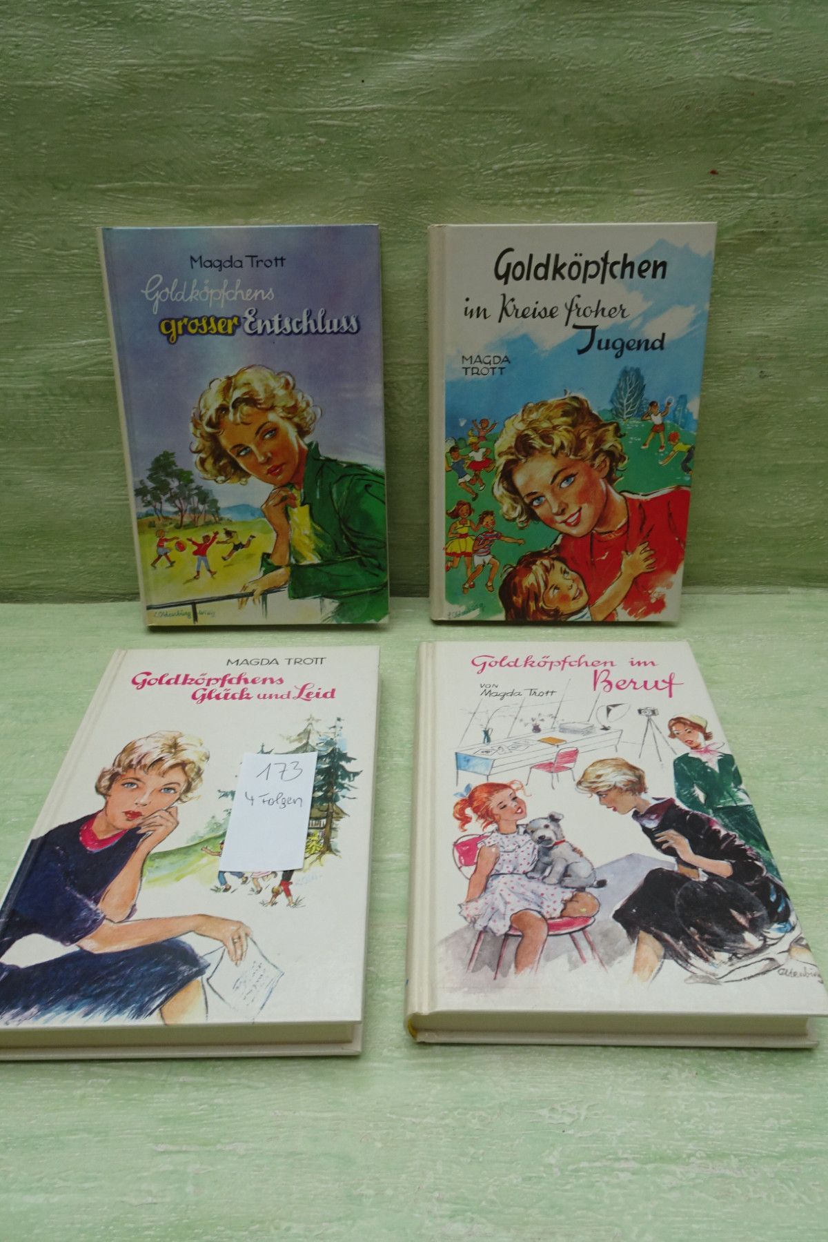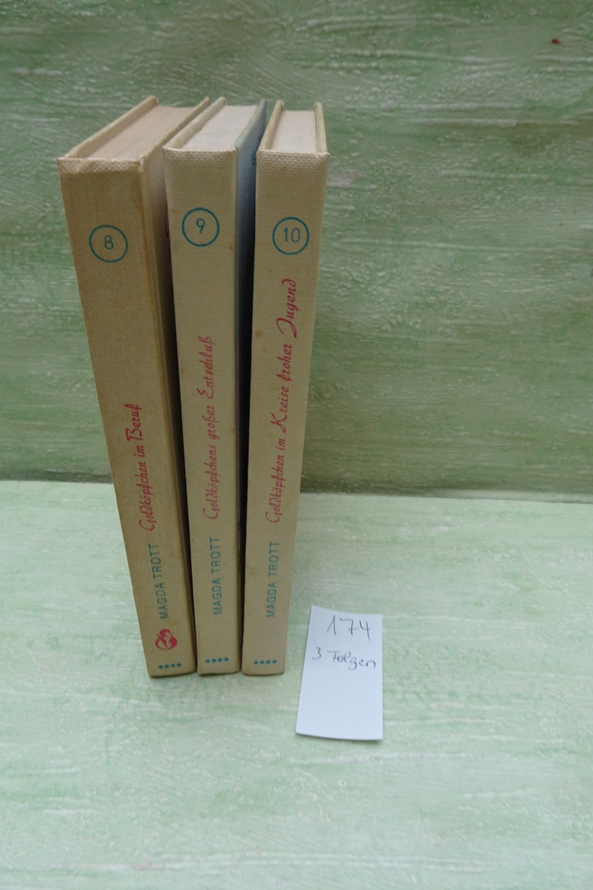 Jugend- & Kinderbücher ... Erinnerungen ..... Magda Trott Goldköpfchen -Auswahl- 173: glatte Ausgaben 7: Glück und Leid 8: im Beruf 9: großer Entschluß 10: im Kreise froher Jugend 174: Leinenbücher 8: im Beruf 9: großer Entschluß 10: im Kreise froher Jugend Abkürzungen: Buchschnitt : BS fleckig