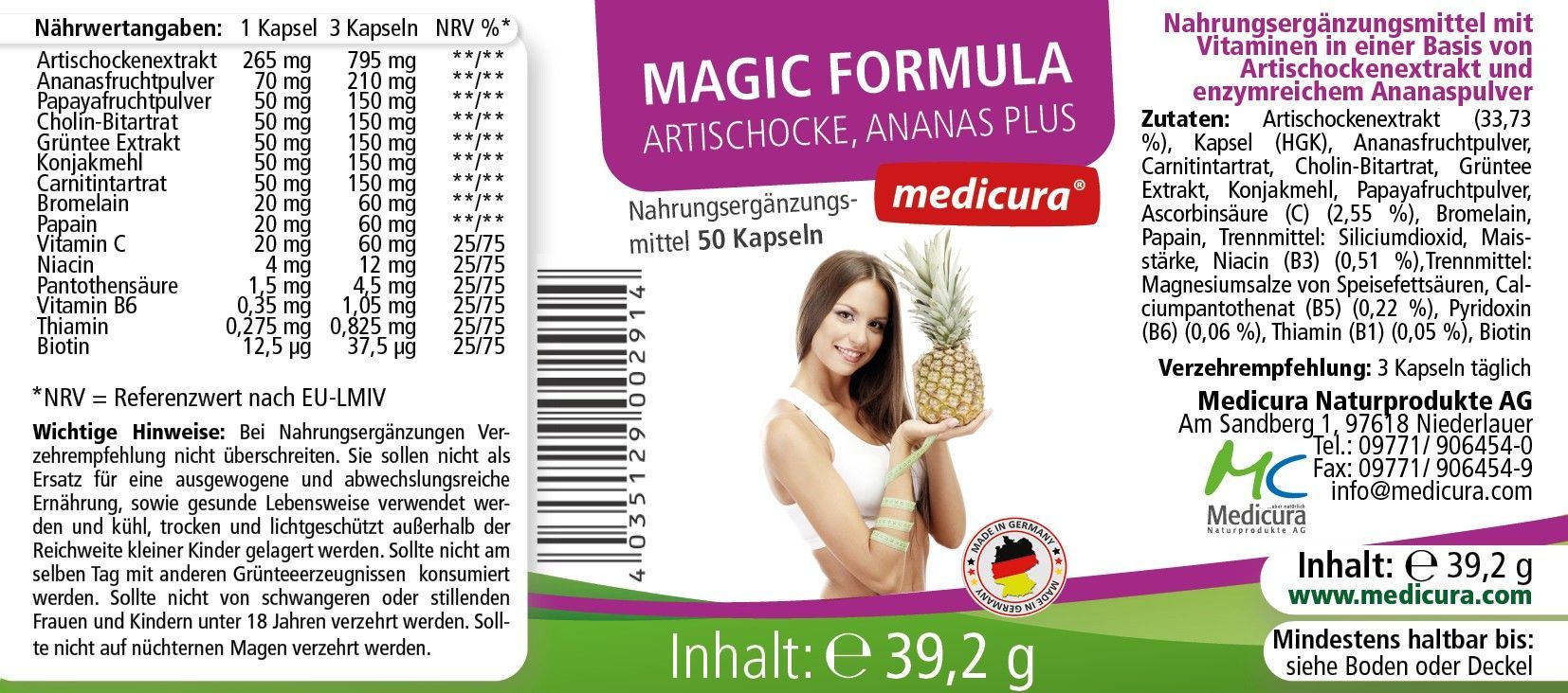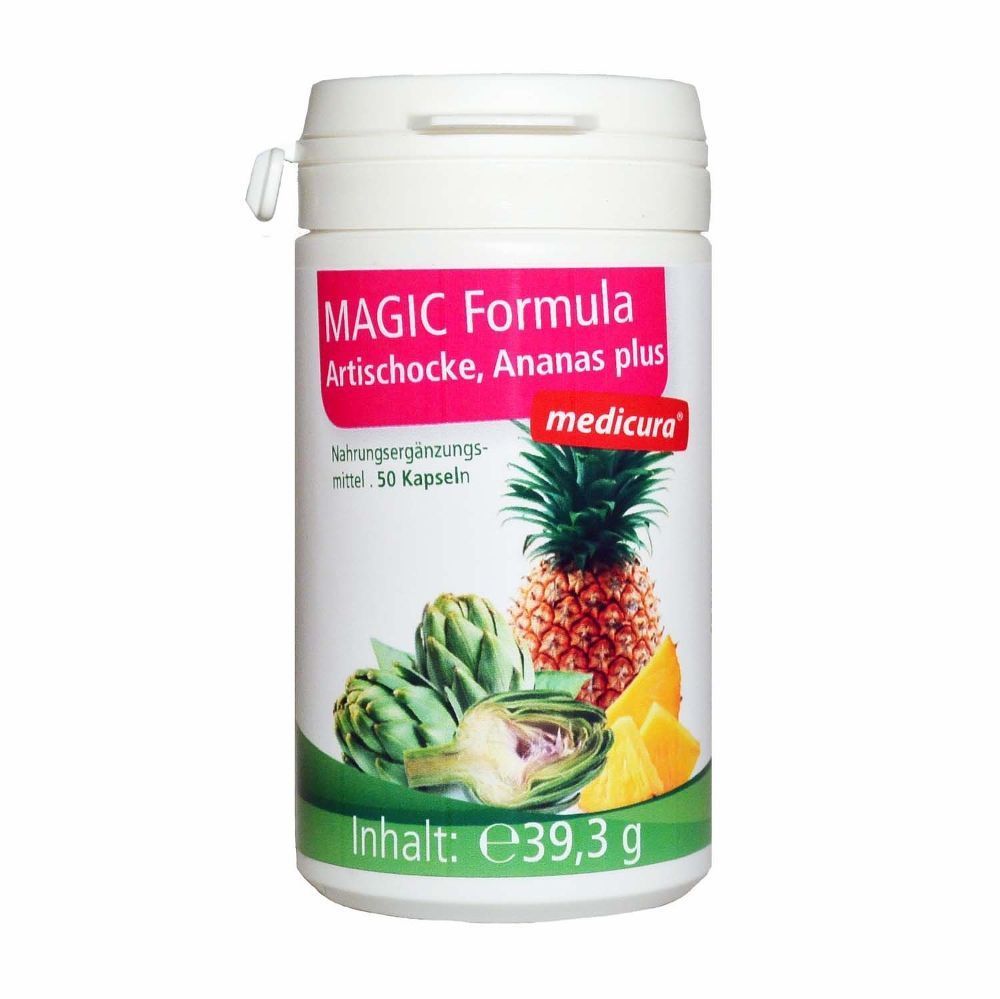 Magic Formula - Artischocke, Ananas - Nahrungsergänzungsmittel mit Vitaminen Zusammensetzung Kapsel: Artischockenblätter-Trockenextrakt (265mg), Fruchtpulver: Ananas (70mg), Papaya (50mg),Bromelain, Papain, Cholin-Bitartat, Grüntee Extr., Konjaktmehl, Carnitintrat, Bromelain, Vit. C, Aerosil, Maisst... Mehr