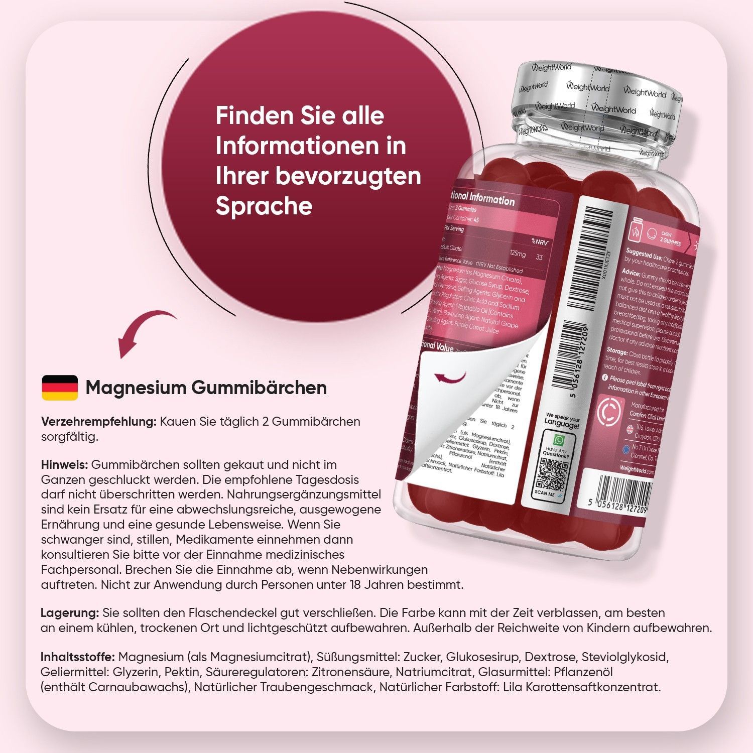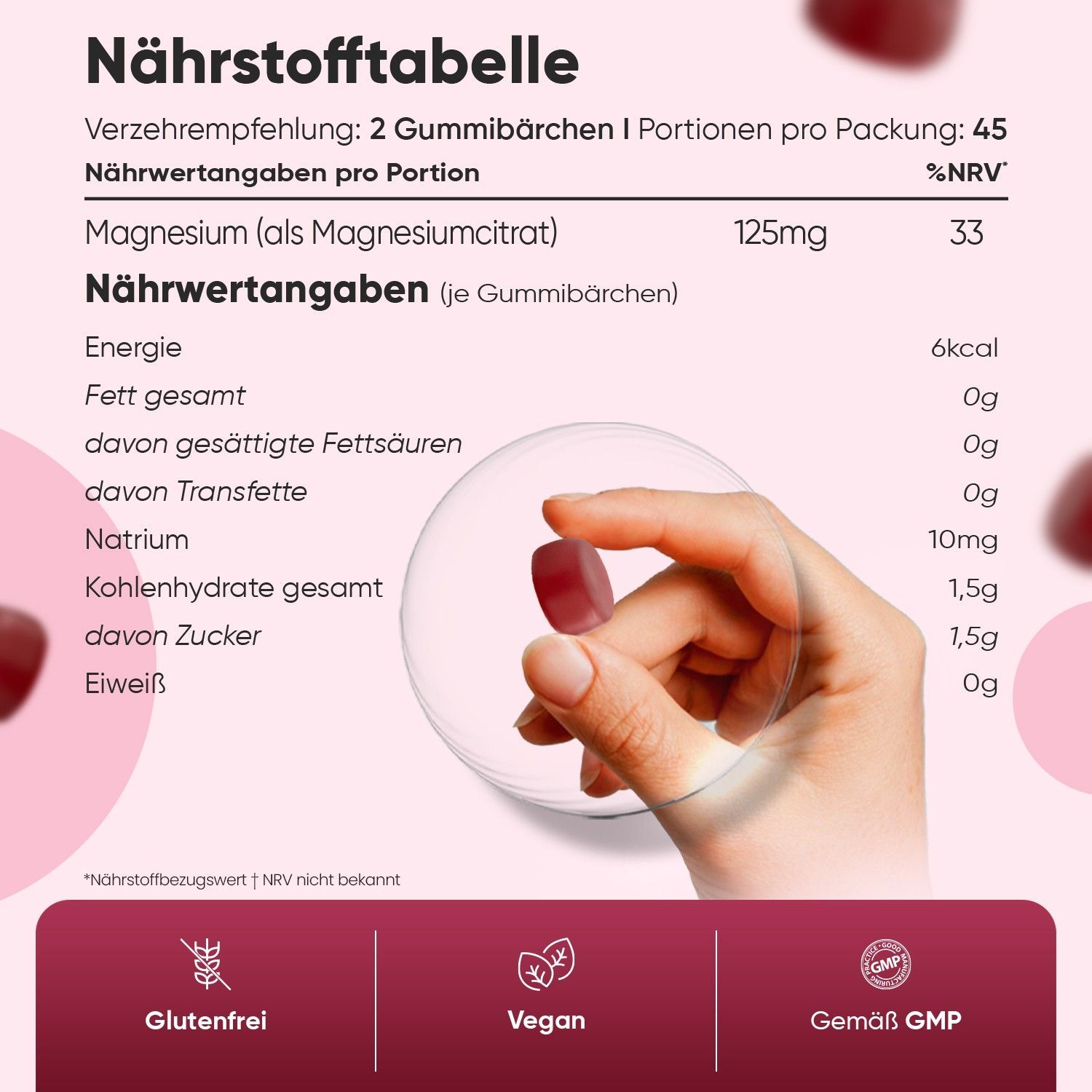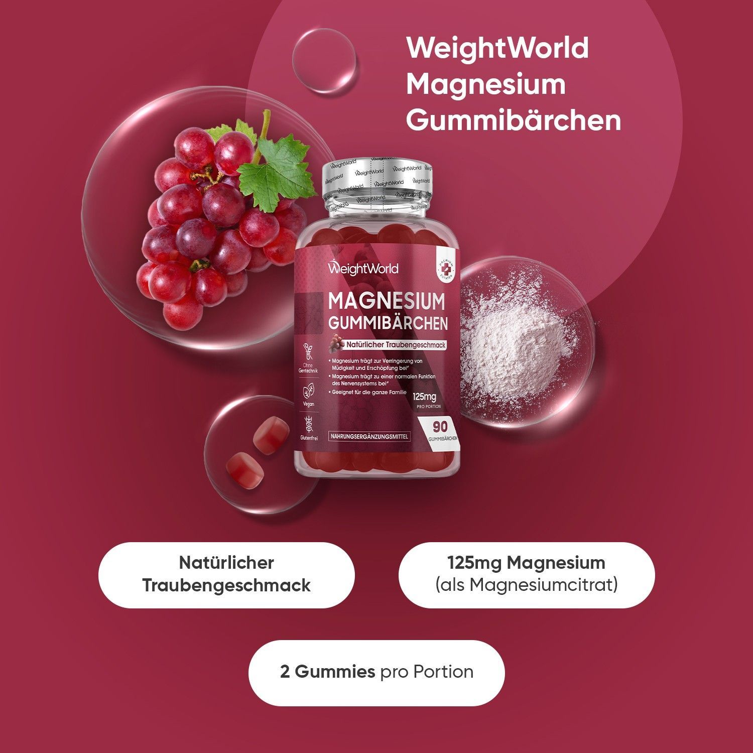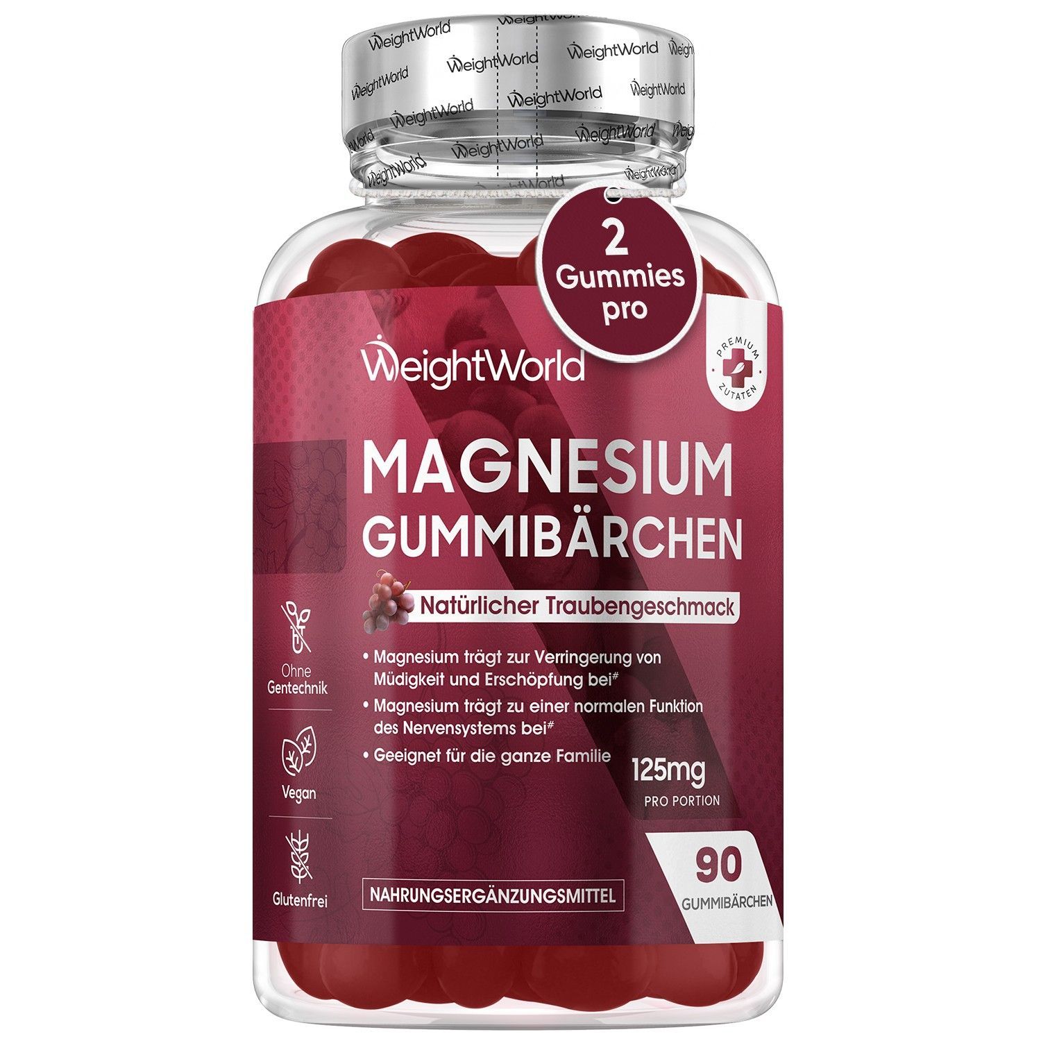 Magnesium Gummibärchen 125mg - 90 Magnesiumcitrat Gummis für Erwachsene & Kinder