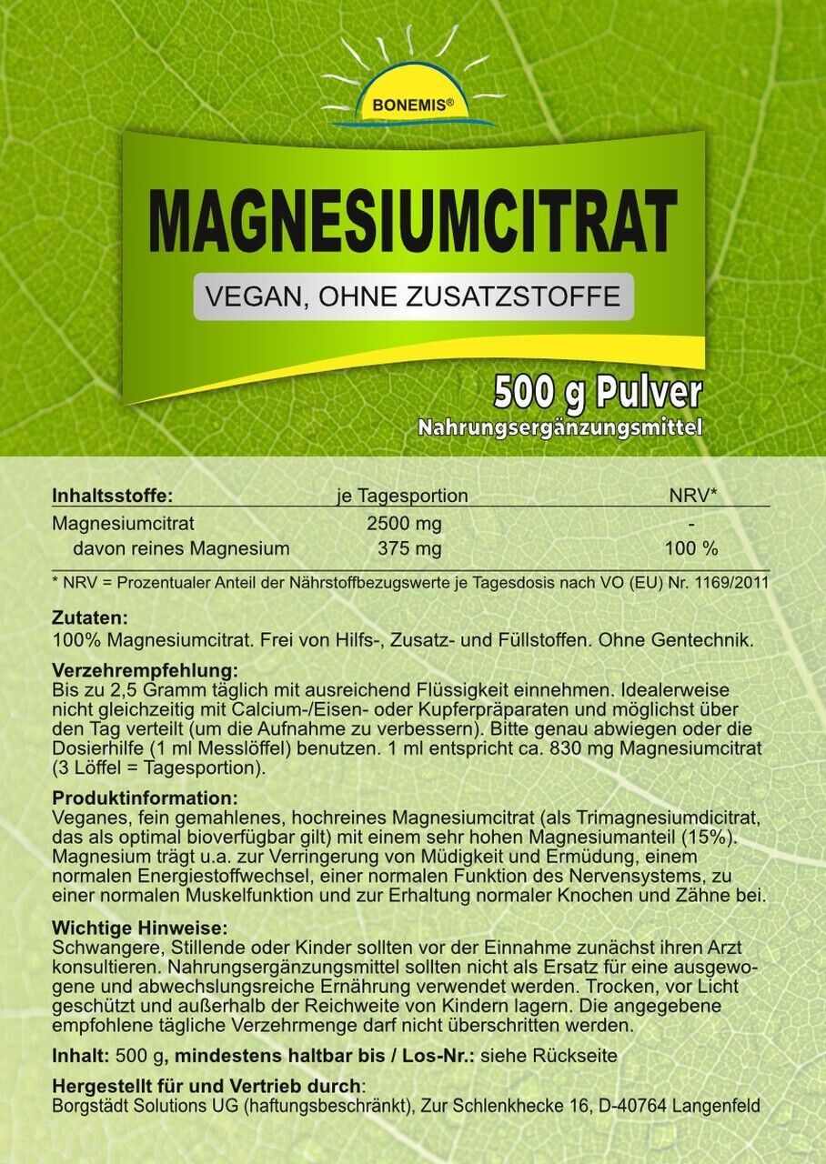 Magnesiumcitrat, veganes Pulver, Premiumqualität ohne Zusätze, 500 g im Beutel