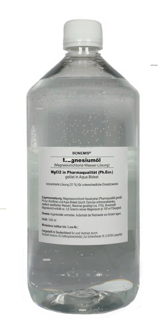 Wir liefern ab 30,- Euro Warenwert innerhalb von Deutschland versandkostenfrei ! Bonemis® Magnesiumöl aus MgCl2 (Ph.Eur.) und Aqua Bidest (Osmosewasser), 1000 ml in PET-Flasche Magnesiumöl in seiner wohl reinsten Form. Hergestellt in Deutschland aus Magnesiumchlorid Hexahydrat (Pharmaqualität gemäß