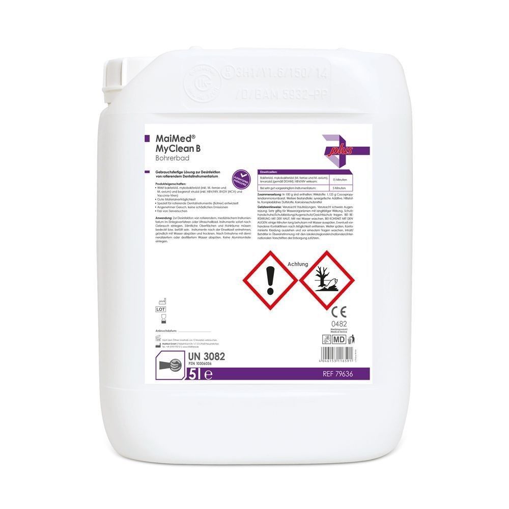 MaiMed® MyClean B Bohrerbad Produktinformationen MaiMed ® MyClean B ist ein kraftvolles, gebrauchsfertiges Instrumentendesinfektionsmittel, das speziell für die gründliche Desinfektion von rotierendem Dentalinstrumentarium entwickelt wurde. Es bietet eine breite Wirksamkeit gegen Bakterien u
