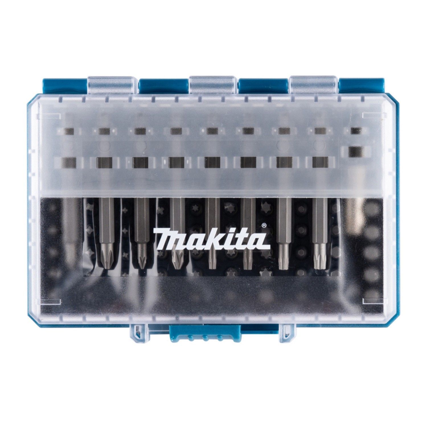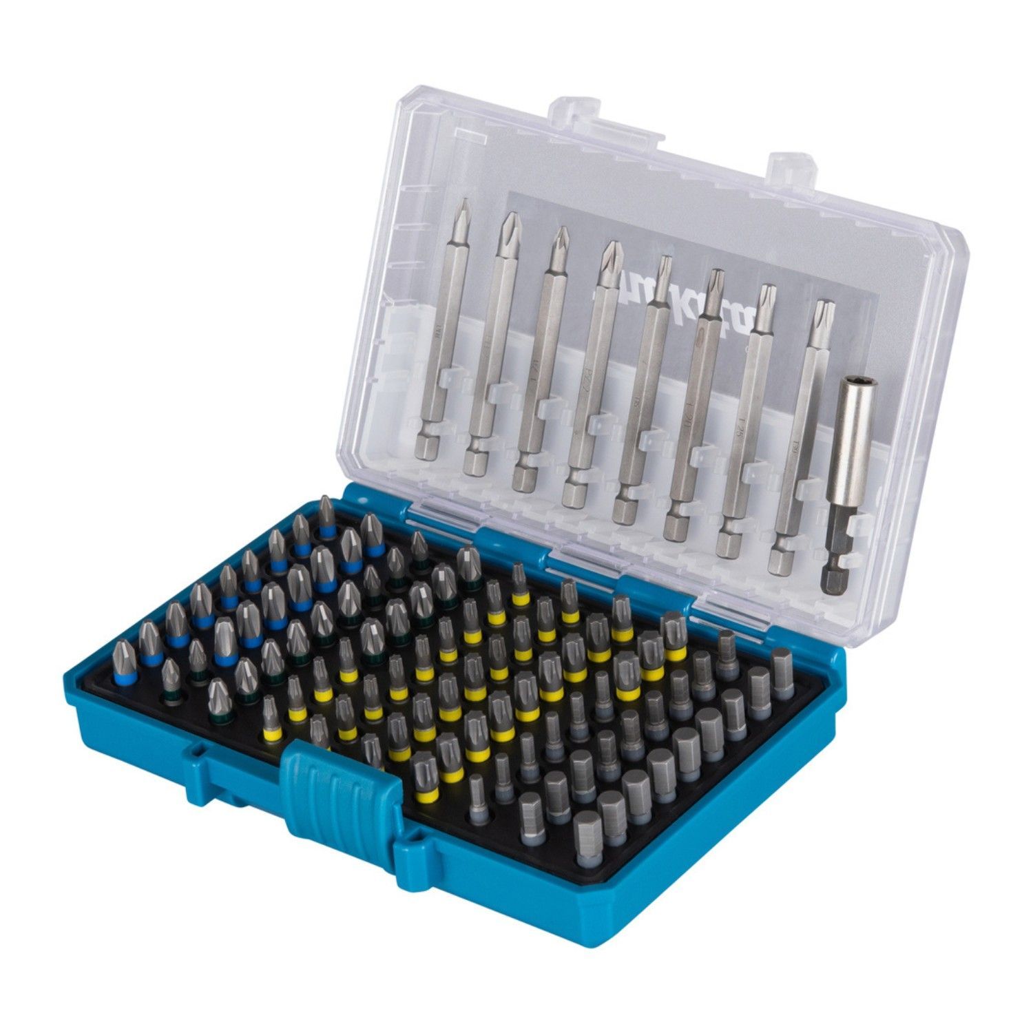 Bits 25 mm 5x PH1, 6x PH2, 5x PH3, 5x PZ1, 6x PZ2, 5x PZ3, 5x T10, 6x T15, 6x T20, 6x T25, 6x T30, 5x T40, 6x H3, 6x H4, 6x H5, 6x H6, Bits 75 mm 1x PH1, 1x PH2, 1x PZ1, 1x PZ2, 1x T15, 1x T20, 1x T25, 1x T30, Bithalter 60 mm magnetisch
