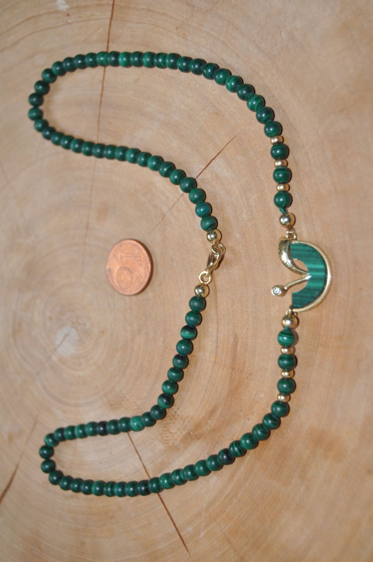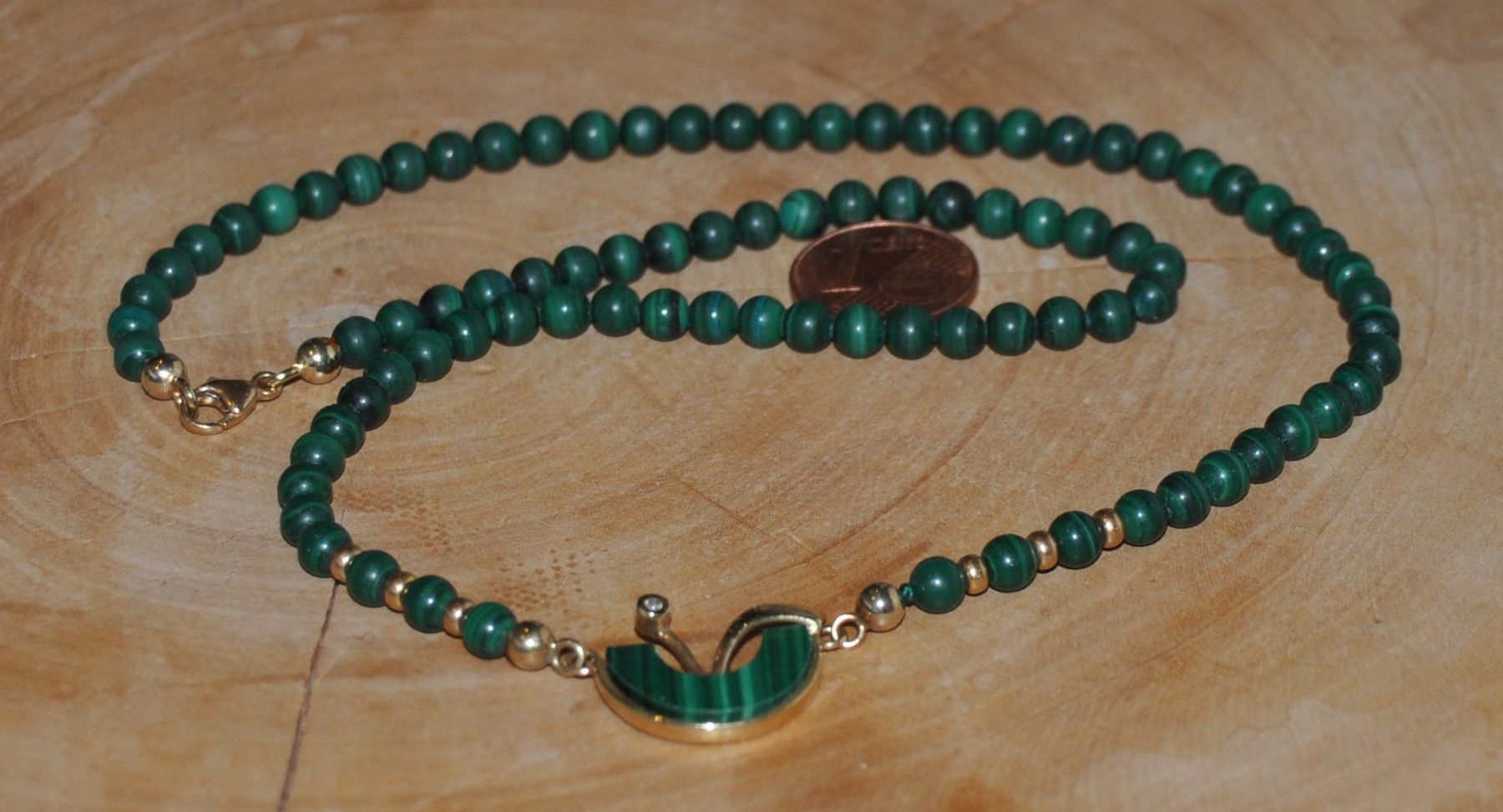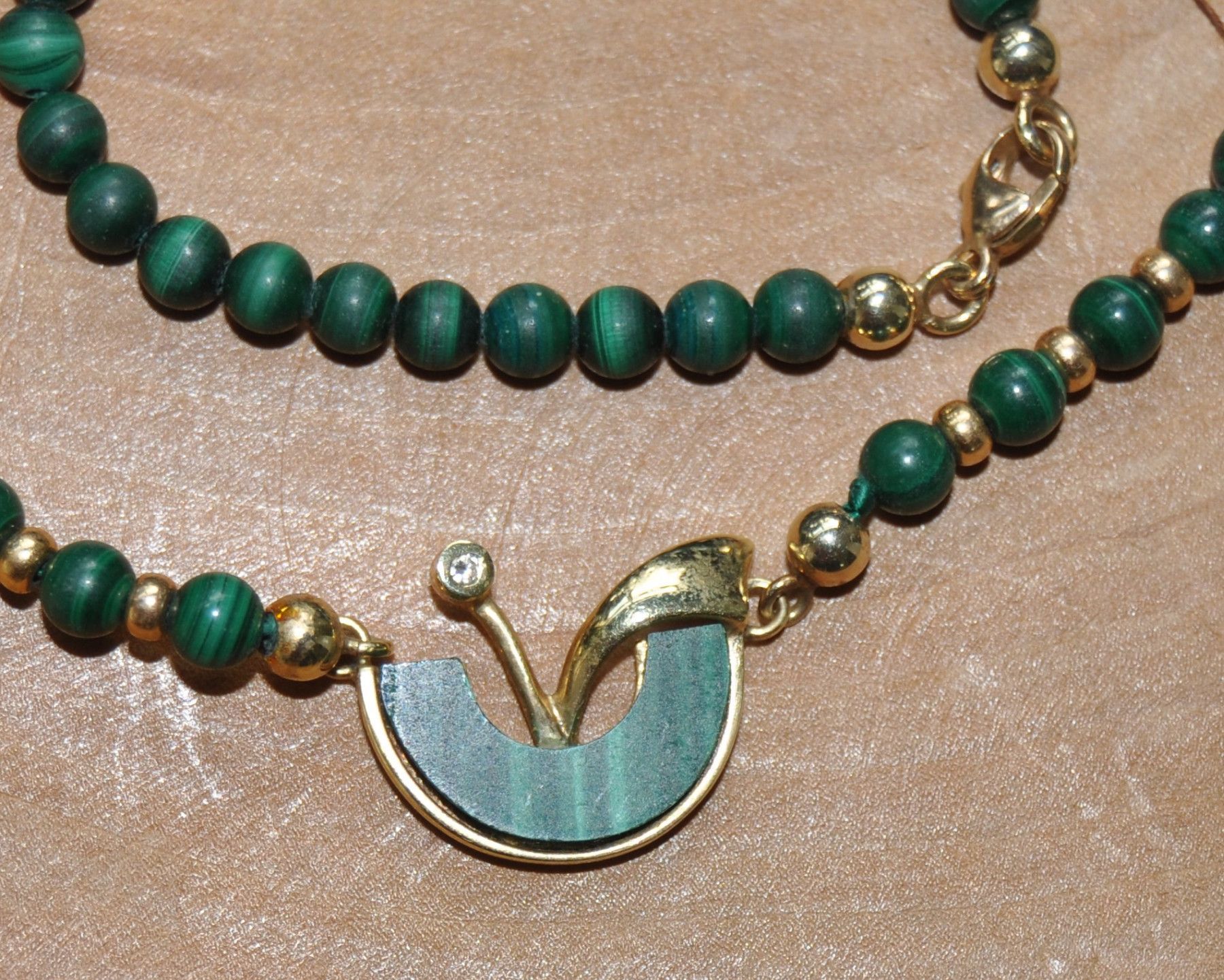 Die Kette ist in einem absolut neuwertigen Zustand. Sie hat eine Länge von 44 cm und wiegt 18 Gramm. Die Malachit Perlen sind 4,5 mm groß. Die Goldelemente sind alle aus 585 Gold. Anhänger und Verschluss sind auch so gestempelt. Der Anhänger hat eine Breite von 2 cm. Ihm schmückt eine echter Brillant. Sehr edel.