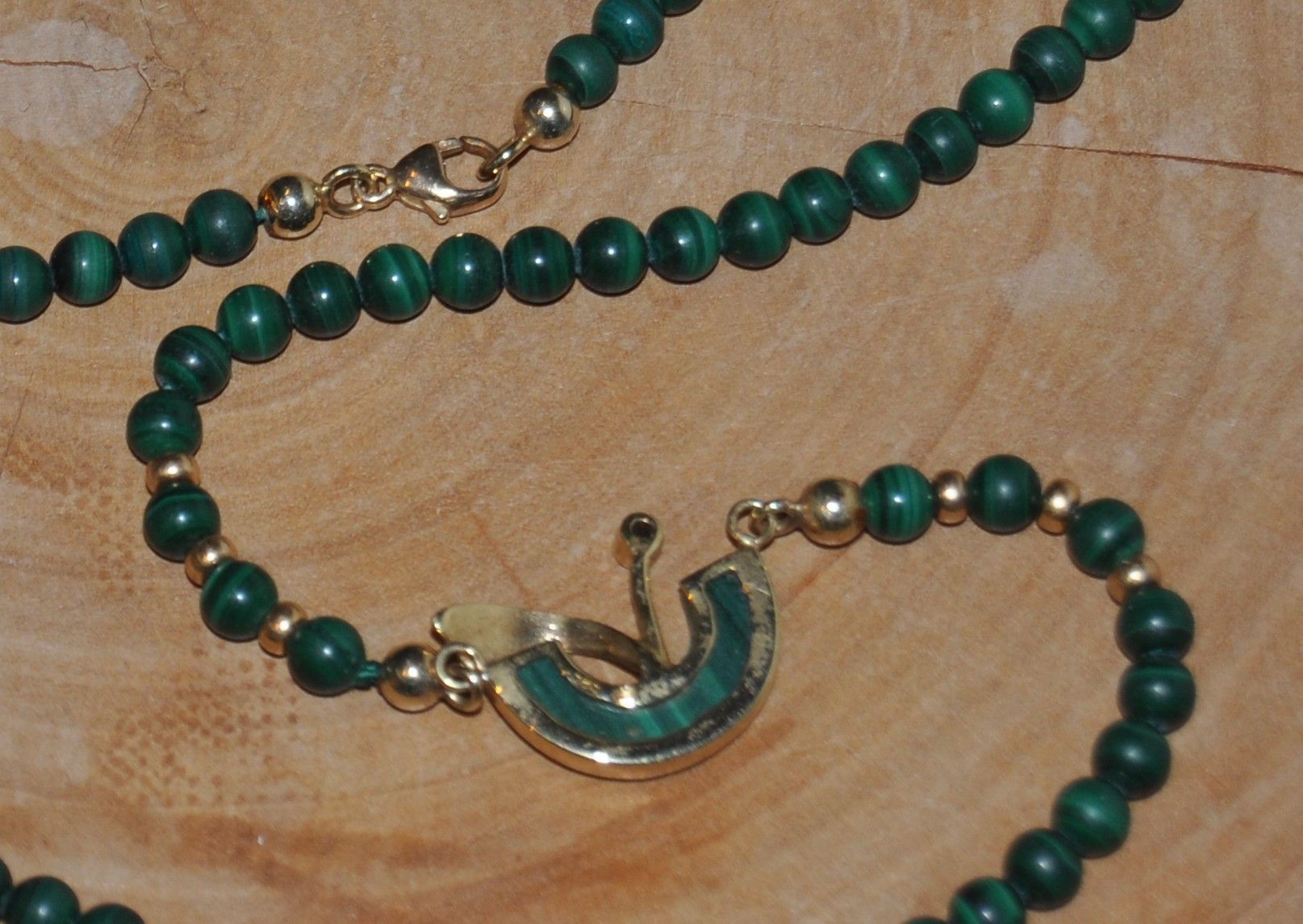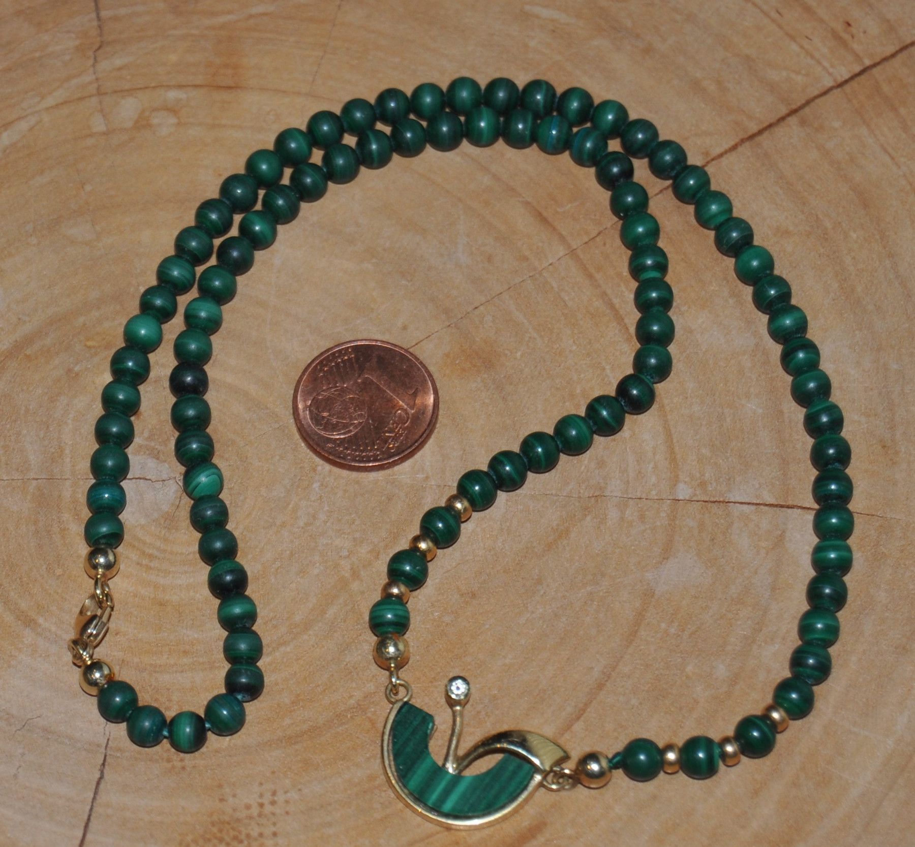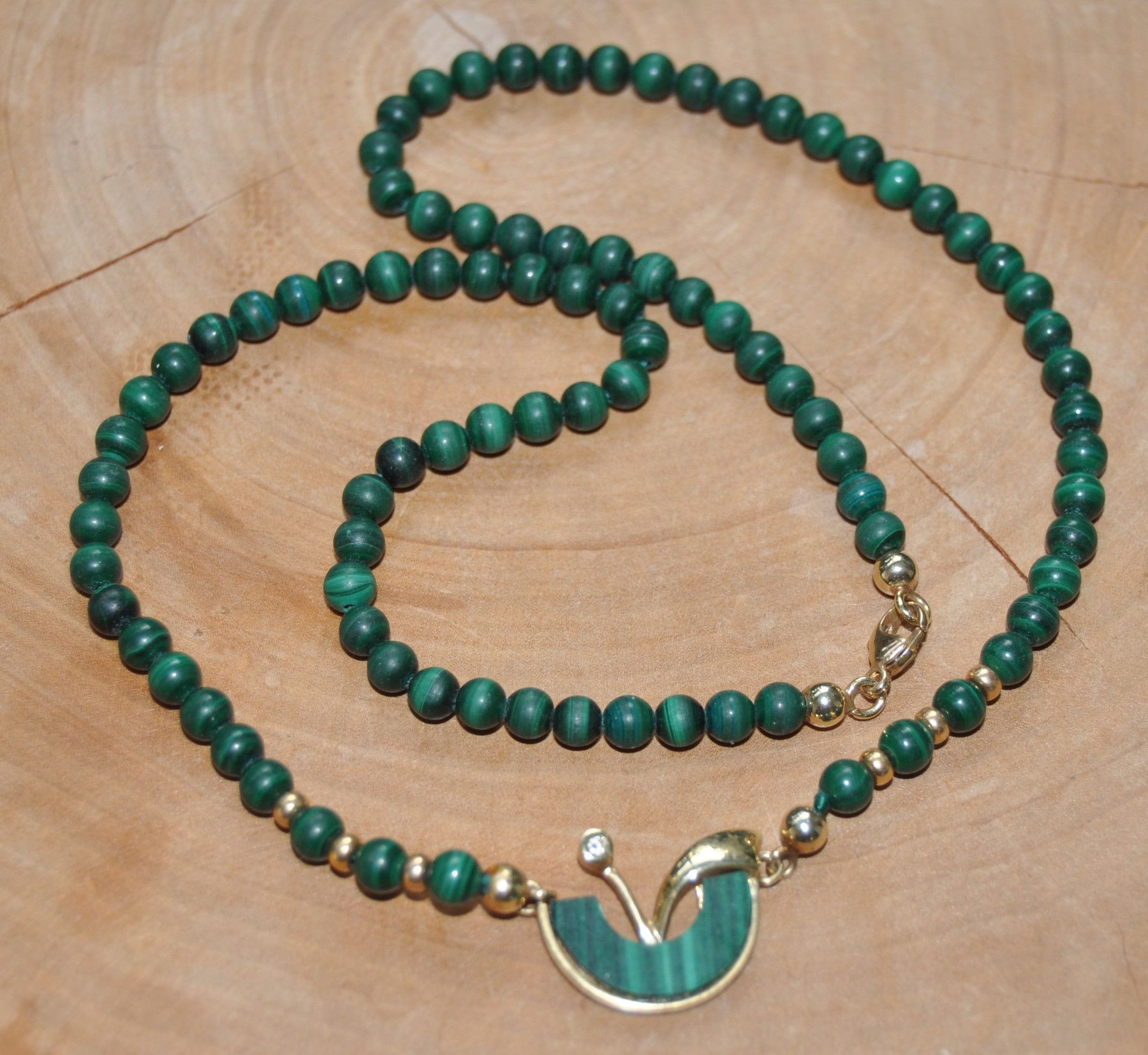 Die Kette ist in einem absolut neuwertigen Zustand. Sie hat eine Länge von 44 cm und wiegt 18 Gramm. Die Malachit Perlen sind 4,5 mm groß. Die Goldelemente sind alle aus 585 Gold. Anhänger und Verschluss sind auch so gestempelt. Der Anhänger hat eine Breite von 2 cm. Ihm schmückt eine echter Brillant. Sehr edel.