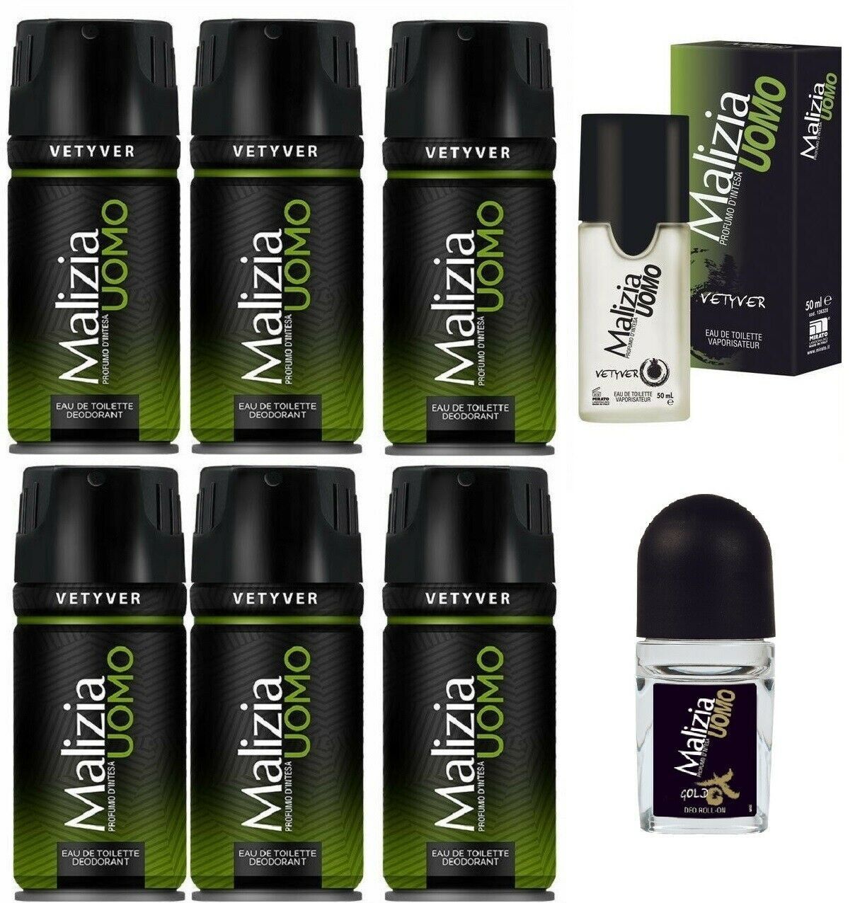 Malizia Uomo Vetyver 6er Pack Deo + 1Edt Vetyver + 1 Deo roll on Gold