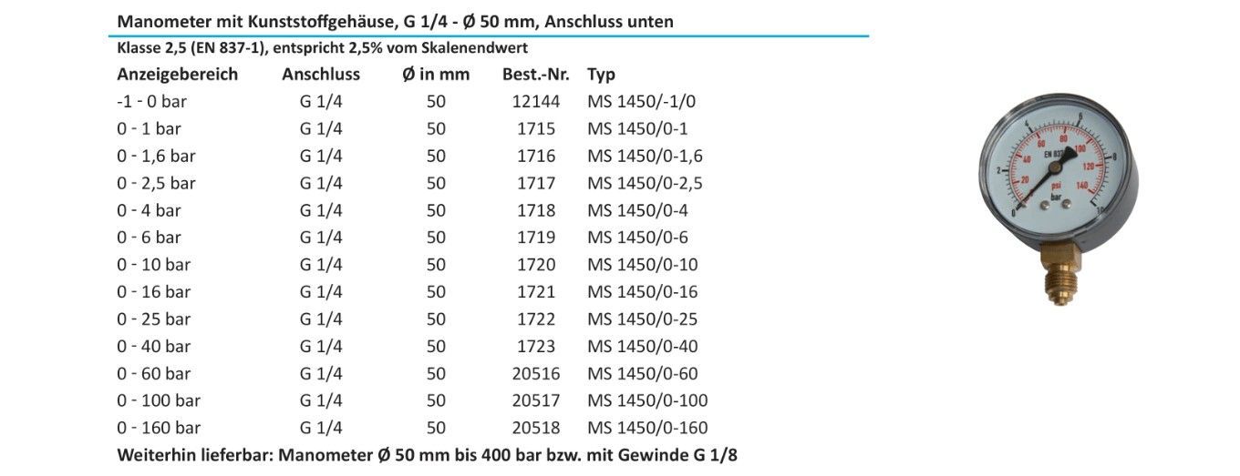 -1 bis 0 bar, 0 bis 1 bar, 0 bis 1,6 bar, 0 bis 2,5 bar, 0 bis 4 bar, 0 bis 6 bar, 0 bis 10 bar, 0 bis 16 bar, 0 bis 25 bar
