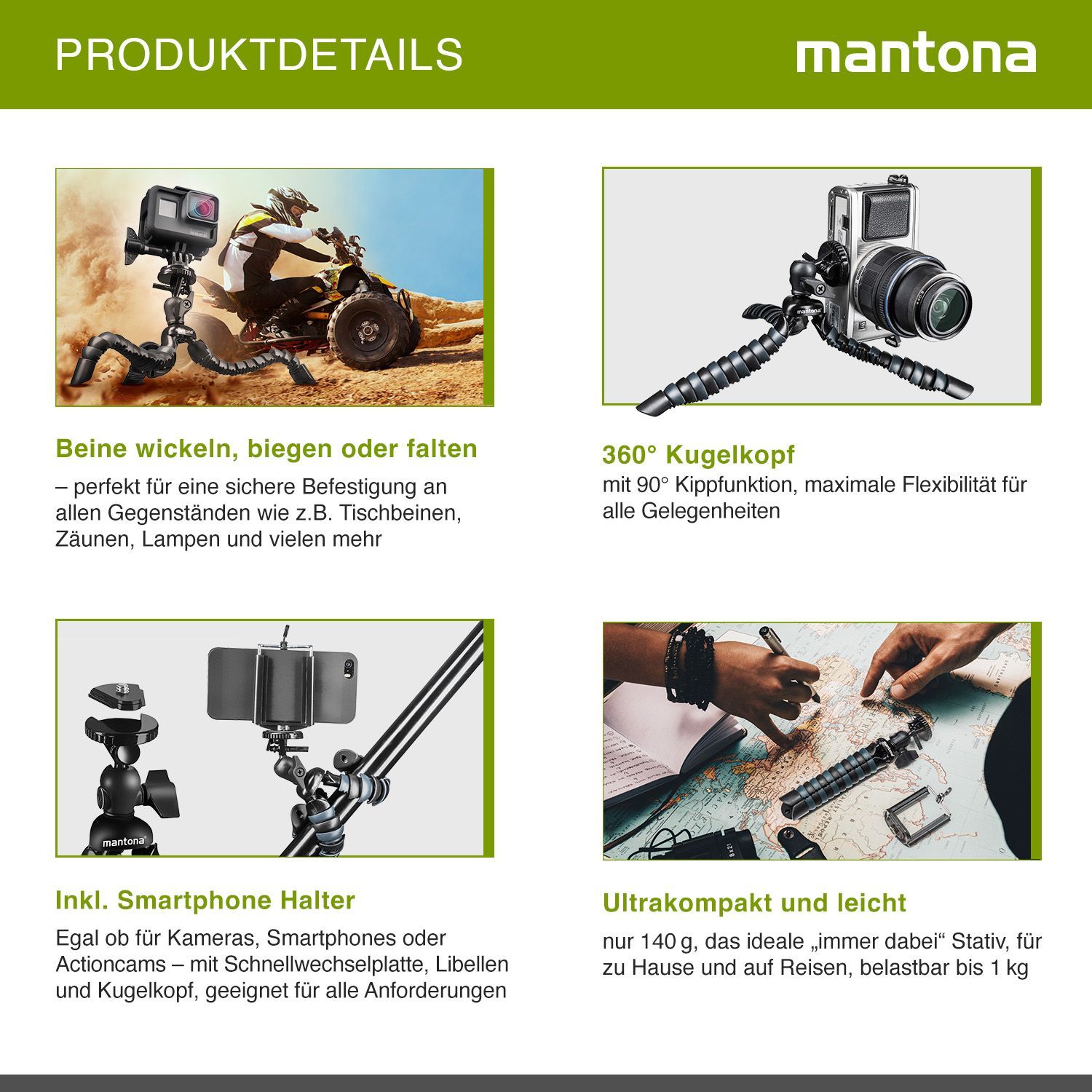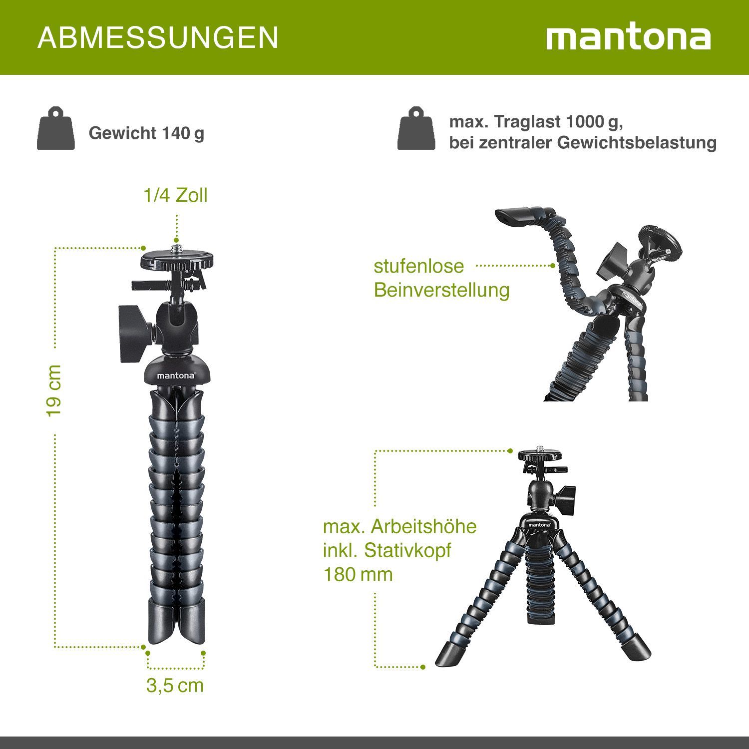 Mantona Armadillo Mini 190x35x35mm 8-18cm max 1kg schwarz/grau Reisestativ Foto