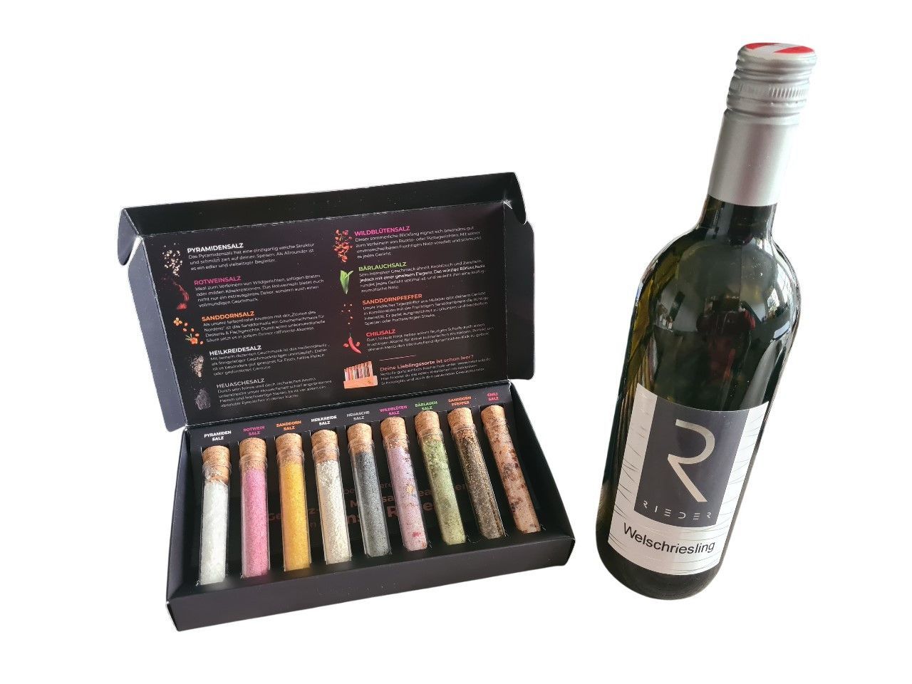 Manufakturgewürze 9 Röhrchen + Ständer und eine Flasche Welschriesling