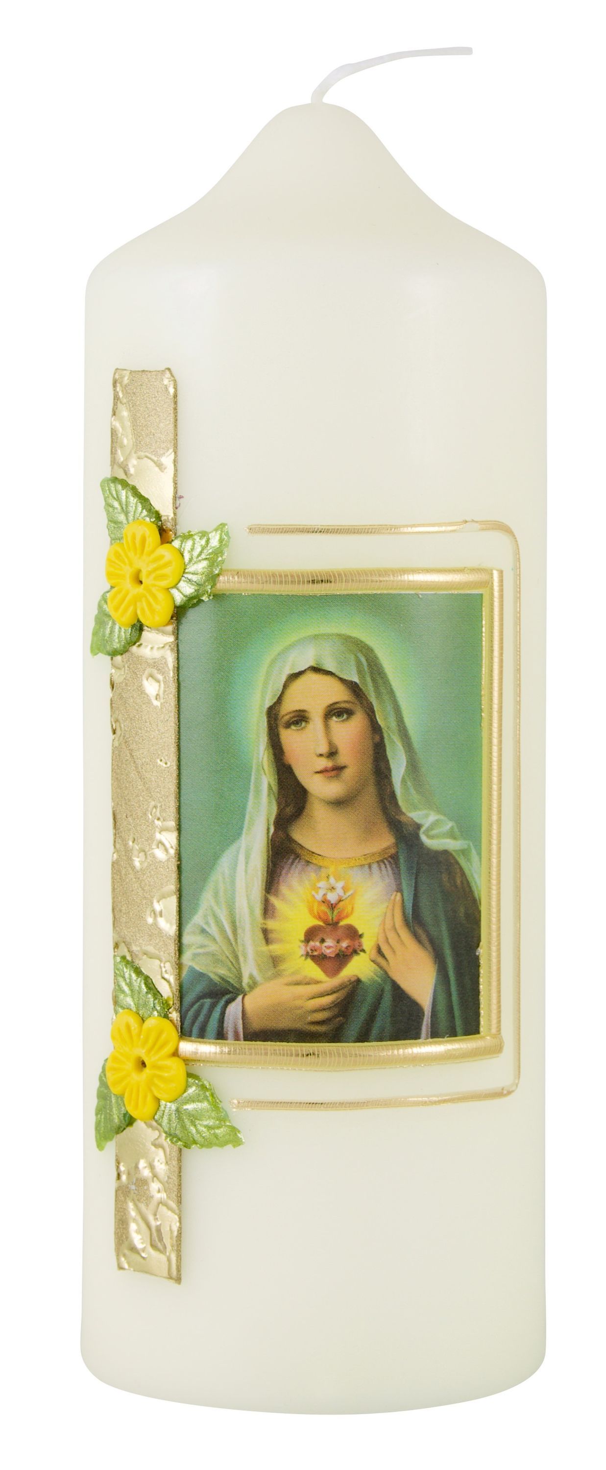 schön gestaltete Motivkerze mit Motiv Herz Maria, Marienkerze mit Verzierung Rose gelb. Kerze-Eierschale Details zum Produkt: Größe: 16,5 x 6cm Material: Wachs