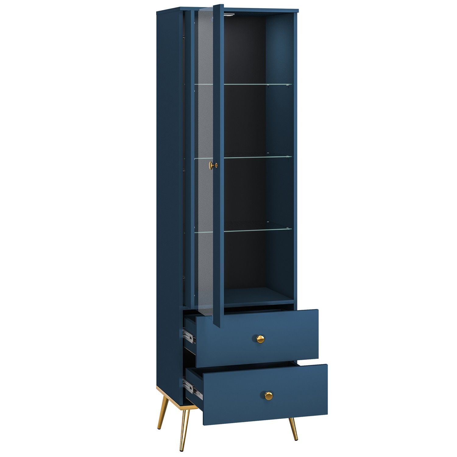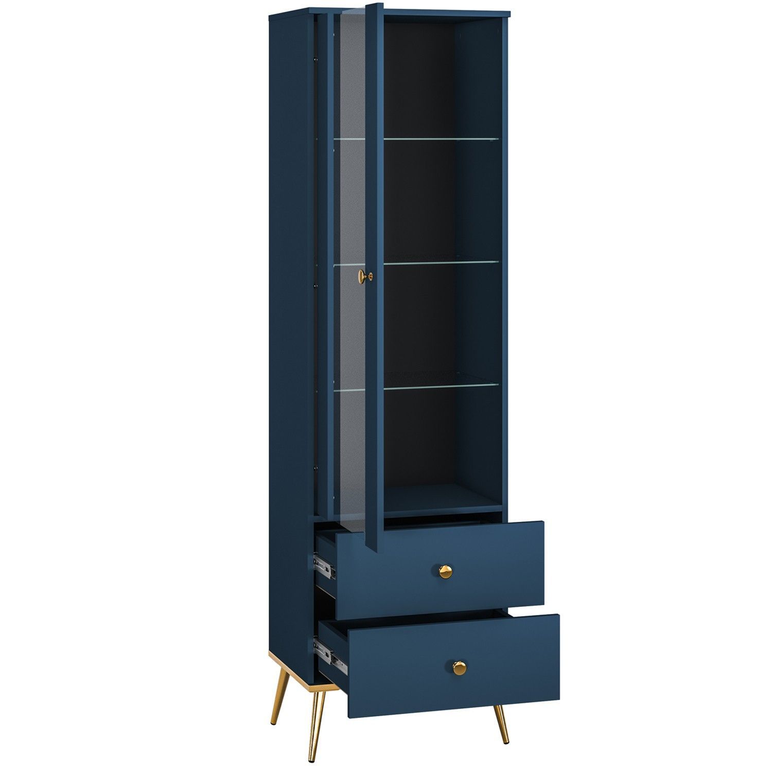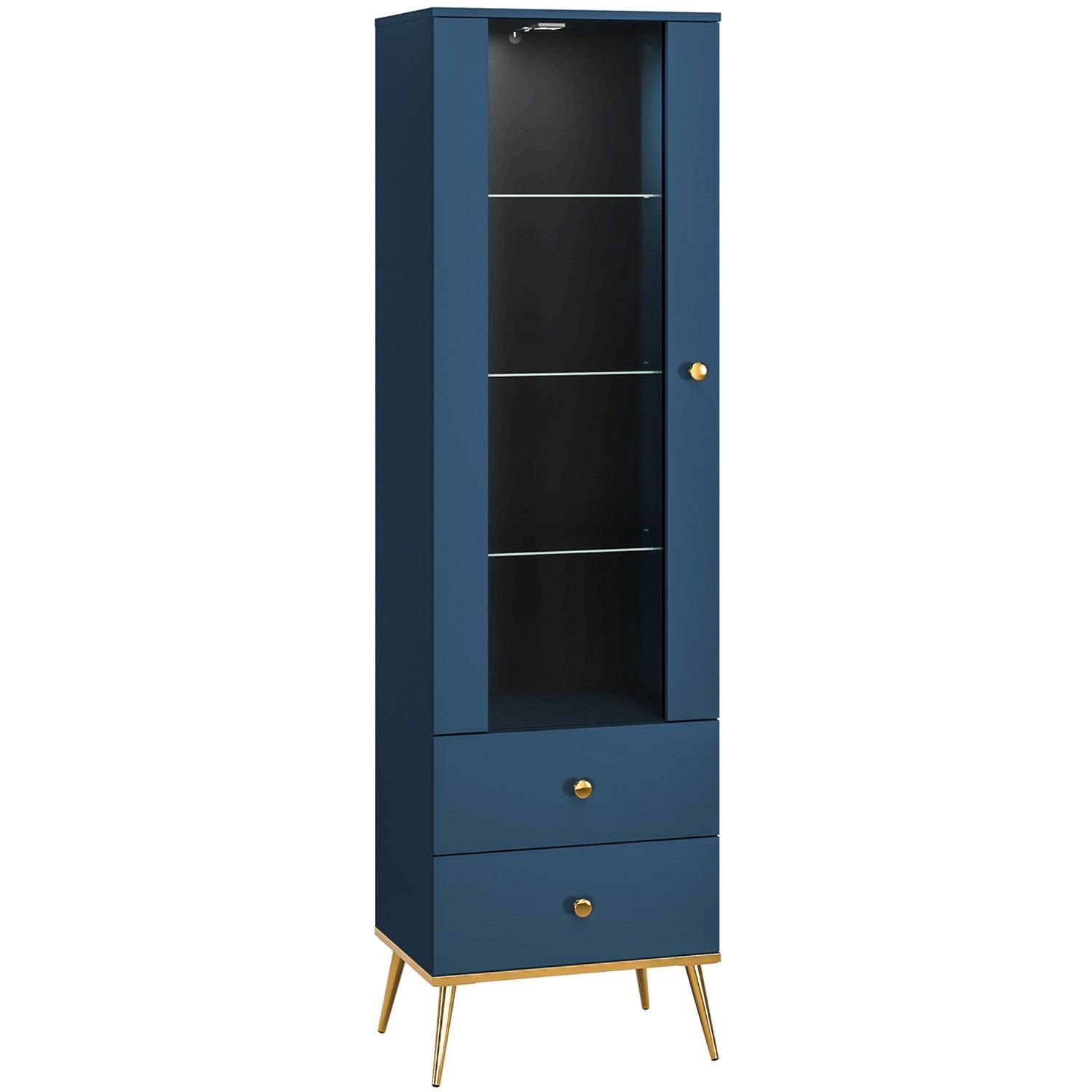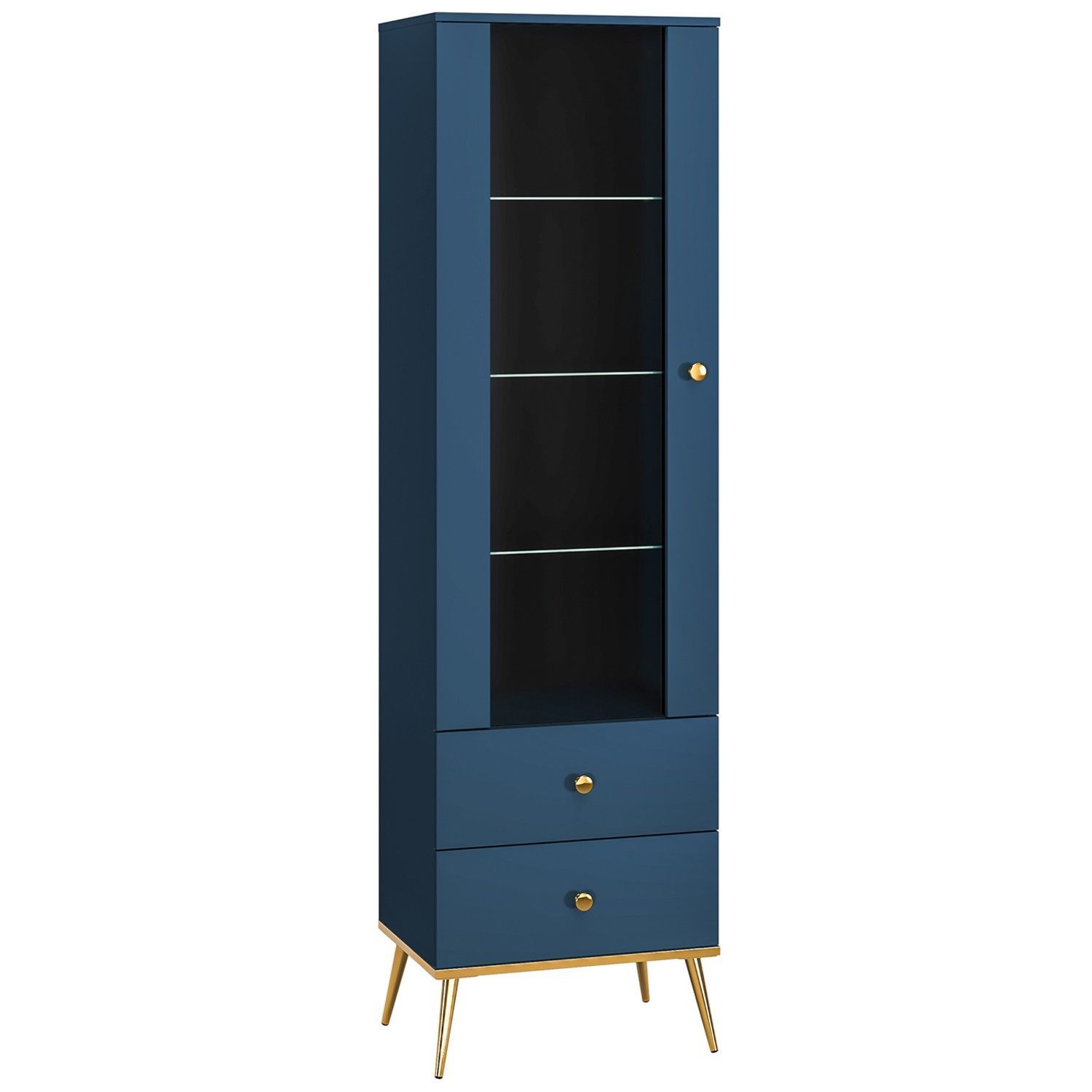 Marine Schmale Vitrine 01 marineblau matt mit Regalen, Schubladen, verglastes Regal