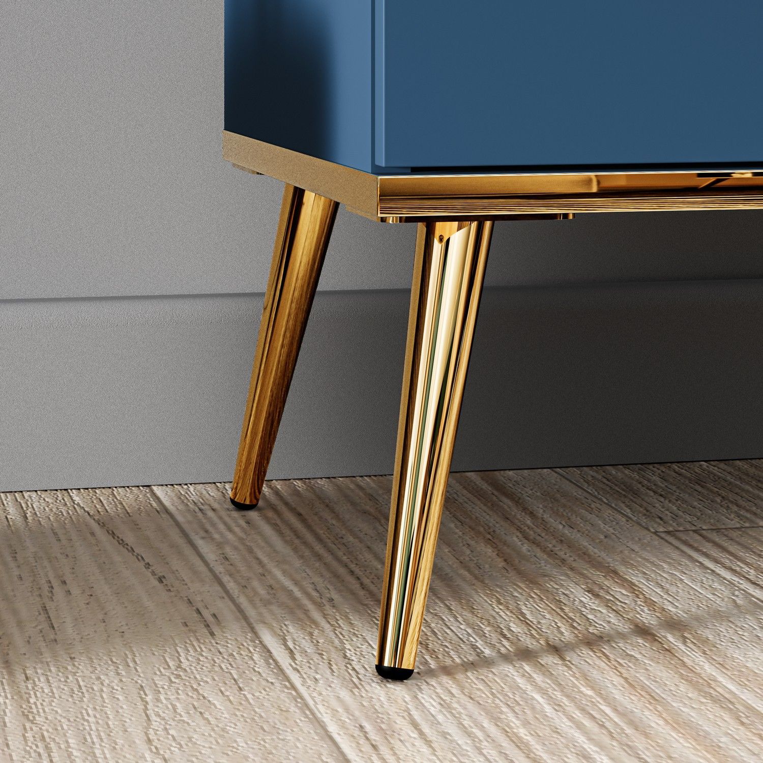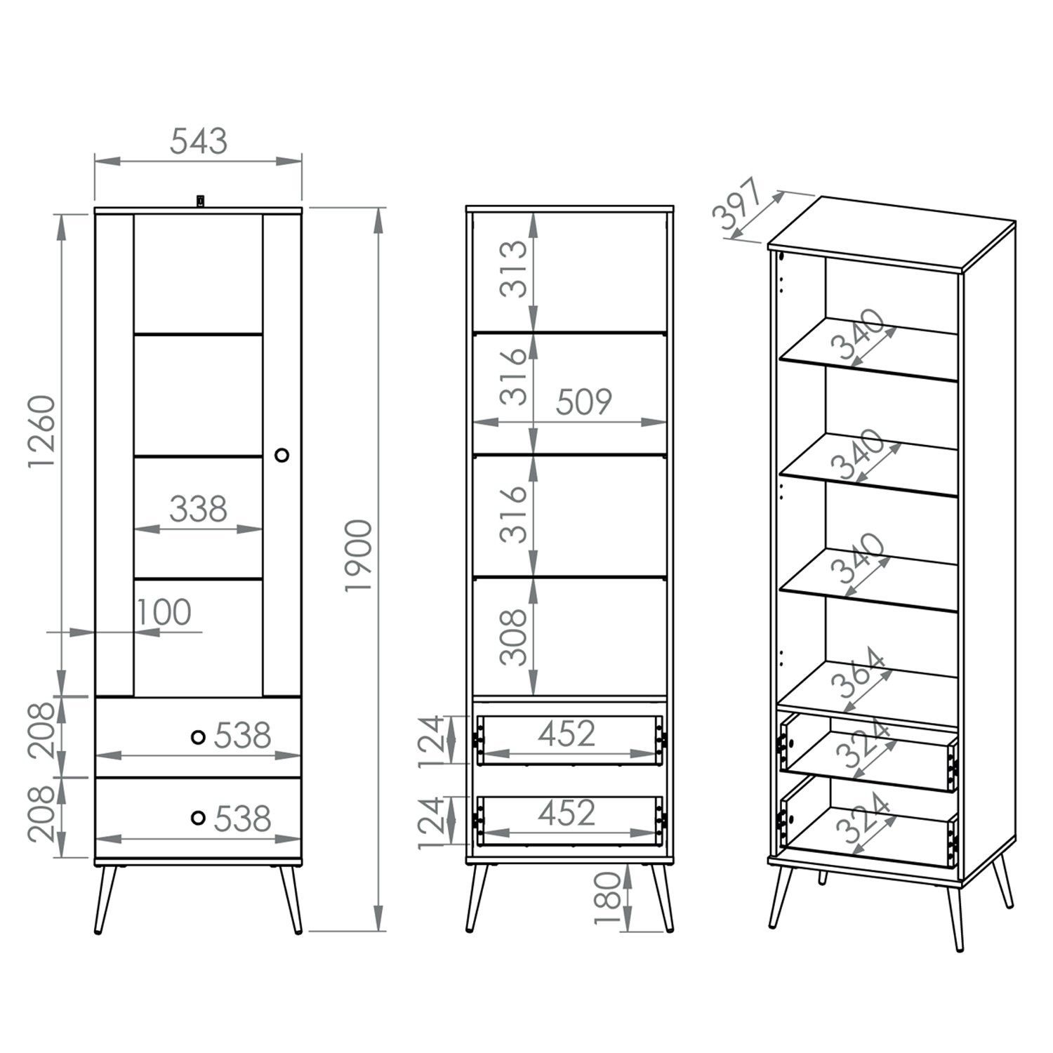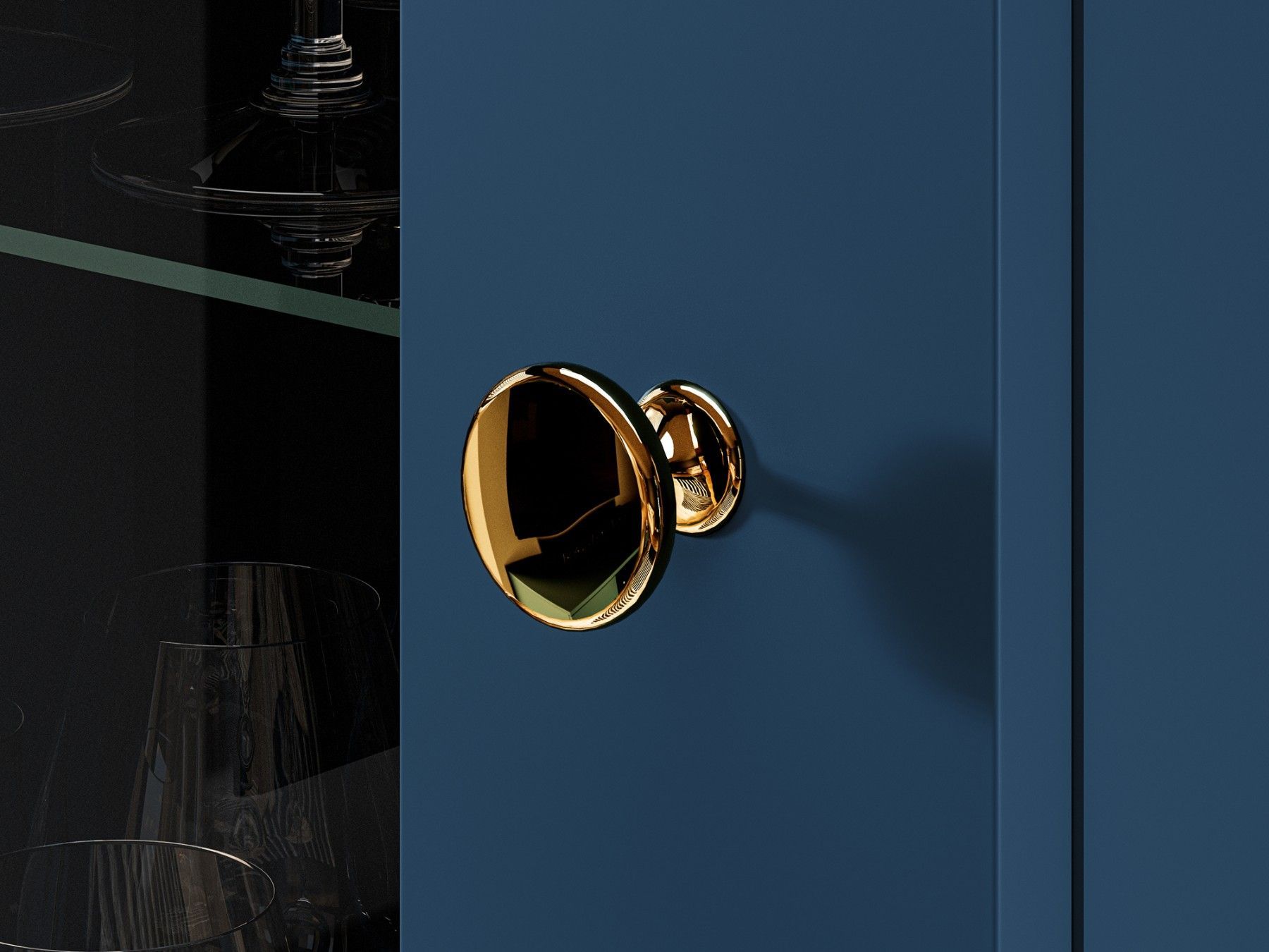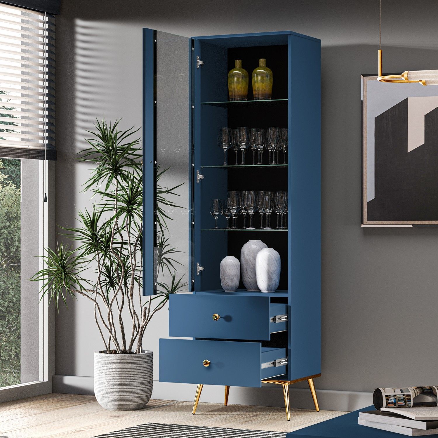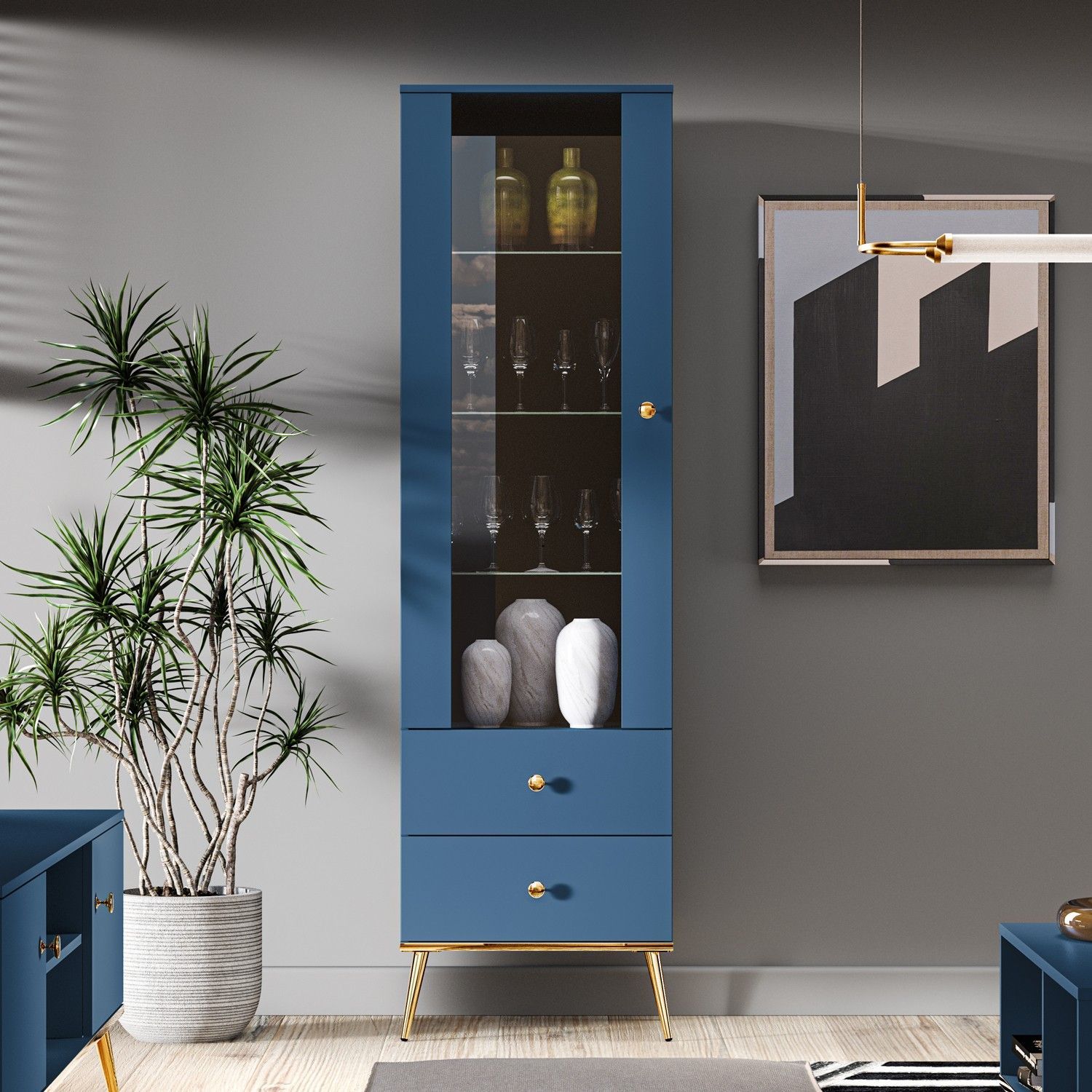 Marine Schmale Vitrine 01 marineblau matt mit Regalen, Schubladen, verglastes Regal